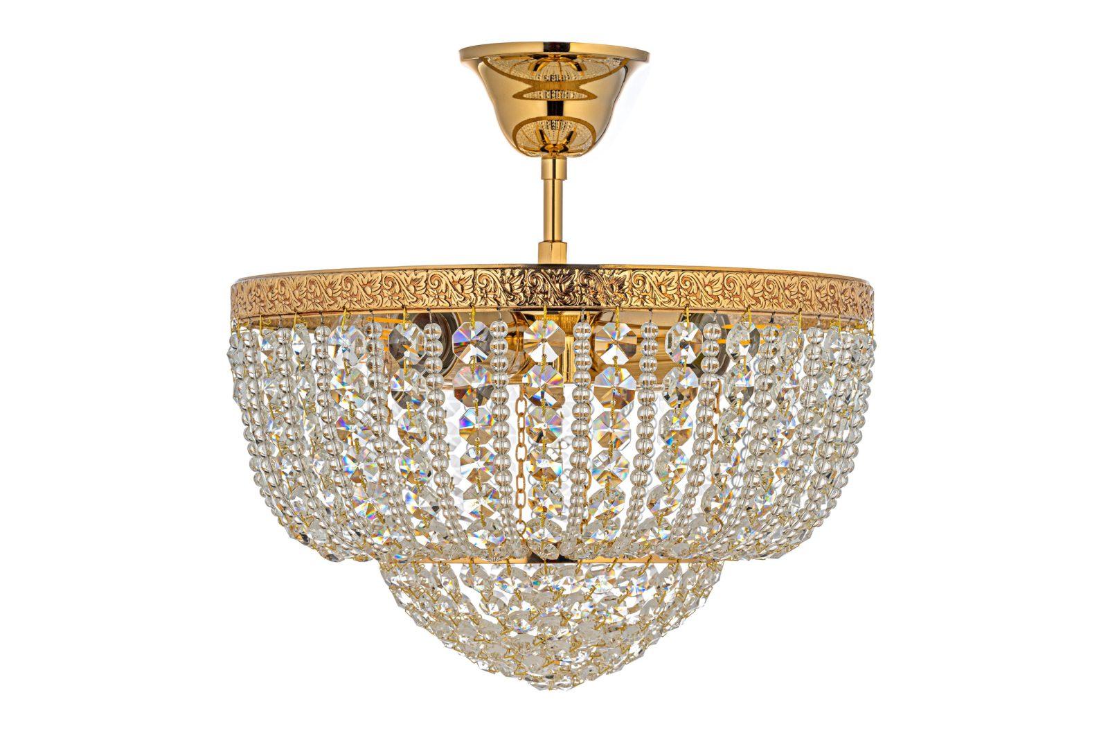 латуни золотого цвета. Поверхность арматуры глянцевая. Плафон изготовлен из хрусталя прозрачного цвета. с глянцевой поверхностью. Декоративные элементы выполнены из прозрачного хрусталя. Осветительный прибор рассчитан на освещение пространства площадью 12 кв. м. Тип цоколя используемых ламп E27. Производитель рекомендует использовать лампы мощностью не более 60 Вт. Суммарная мощность светильника составляет 240 Вт. Лампочки в комплект не входят. Защита от попадания влаги и пыли внутрь изделия не предусмотрена. Рекомендуем к применению в гостиной, кабинете, спальне.