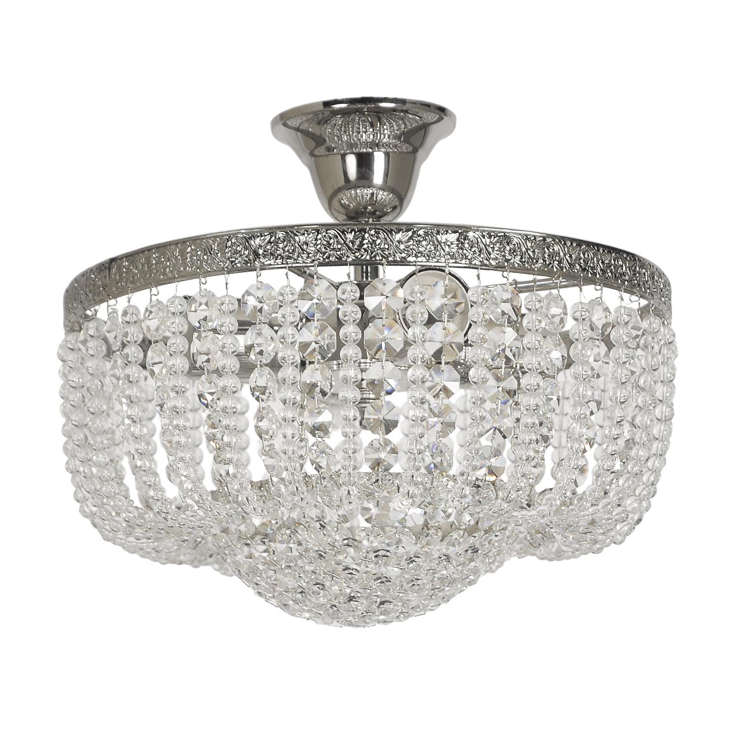 латуни цвета никель. Поверхность арматуры глянцевая. Плафон изготовлен из хрусталя прозрачного цвета. с глянцевой поверхностью. Декоративные элементы выполнены из прозрачного хрусталя. Осветительный прибор рассчитан на освещение пространства площадью 12 кв. м. Тип цоколя используемых ламп E27. Производитель рекомендует использовать лампы мощностью не более 60 Вт. Суммарная мощность светильника составляет 240 Вт. Лампочки в комплект не входят. Защита от попадания влаги и пыли внутрь изделия не предусмотрена. Рекомендуем к применению в гостиной, кабинете, спальне.