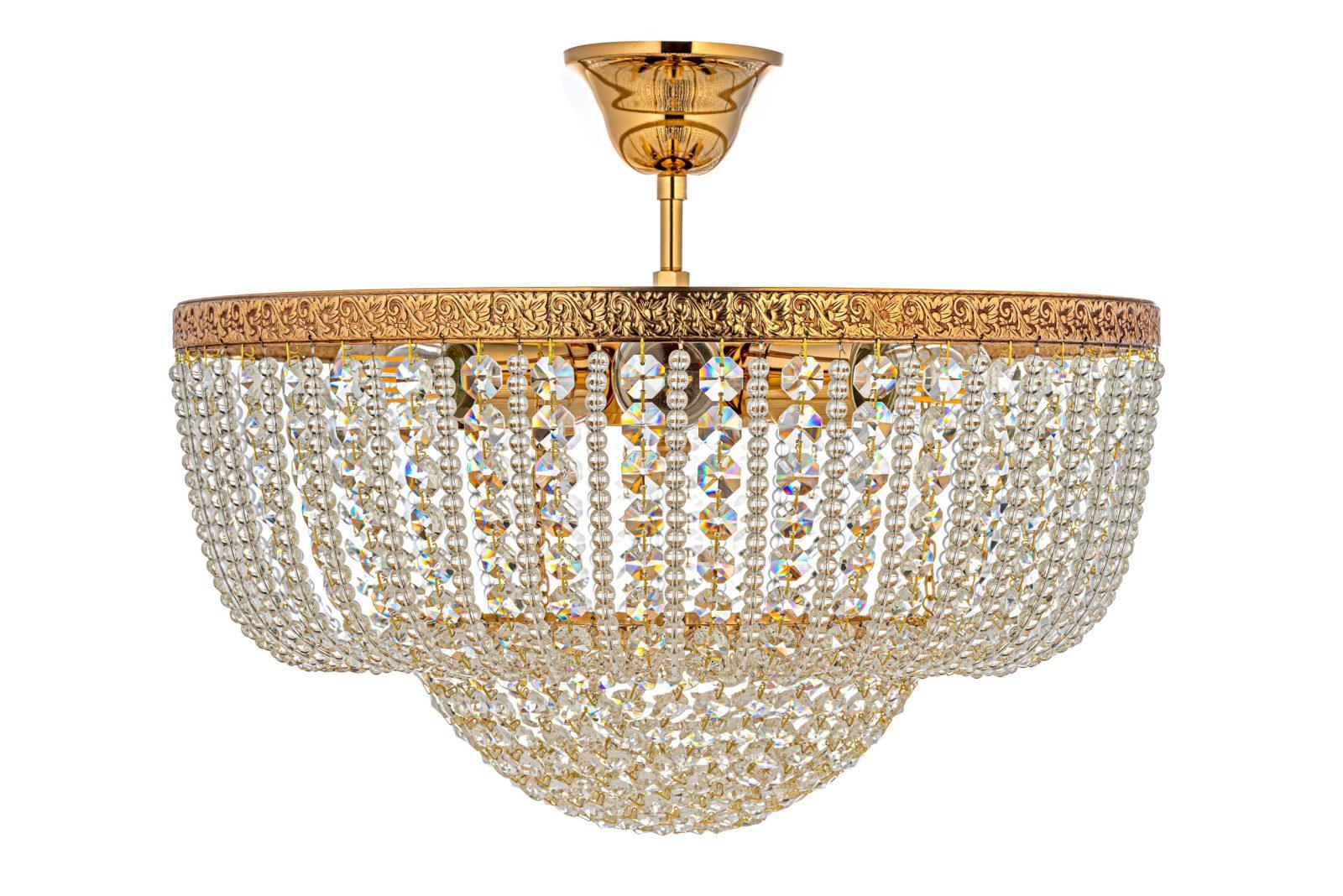 латуни золотого цвета. Поверхность арматуры глянцевая. Плафон изготовлен из хрусталя прозрачного цвета. с глянцевой поверхностью. Декоративные элементы выполнены из прозрачного хрусталя. Осветительный прибор рассчитан на освещение пространства площадью 15 кв. м. Тип цоколя используемых ламп E27. Производитель рекомендует использовать лампы мощностью не более 60 Вт. Суммарная мощность светильника составляет 300 Вт. Лампочки в комплект не входят. Защита от попадания влаги и пыли внутрь изделия не предусмотрена. Рекомендуем к применению в гостиной, кабинете, спальне.