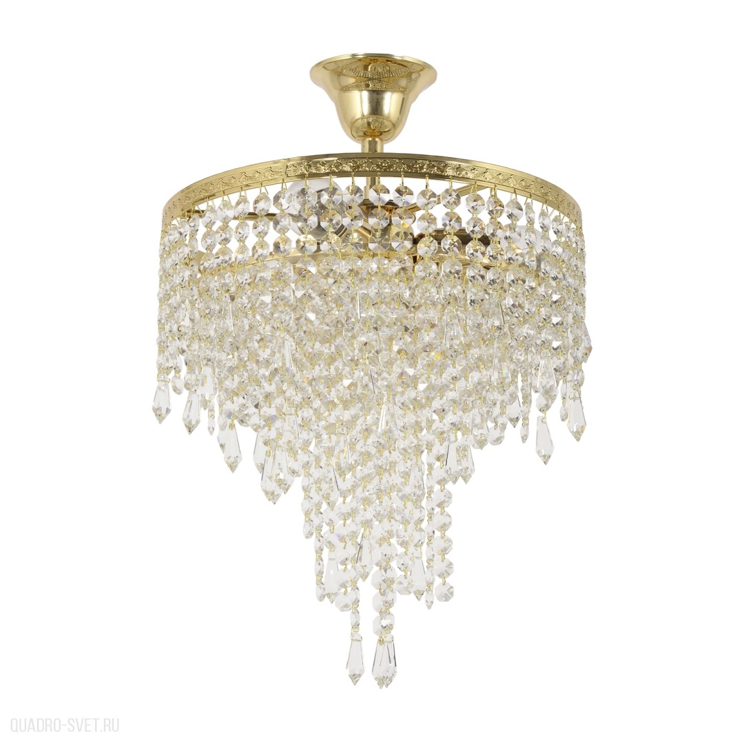 металла золотого цвета. Поверхность арматуры глянцевая. Плафон изготовлен из хрусталя прозрачного цвета. с глянцевой поверхностью. Декоративные элементы выполнены из прозрачного хрусталя. Осветительный прибор рассчитан на освещение пространства площадью 9 кв. м. Тип цоколя используемых ламп E27. Производитель рекомендует использовать лампы мощностью не более 60 Вт. Суммарная мощность светильника составляет 180 Вт. Лампочки в комплект не входят. Защита от попадания влаги и пыли внутрь изделия не предусмотрена. Рекомендуем к применению в гостиной, кабинете, спальне.