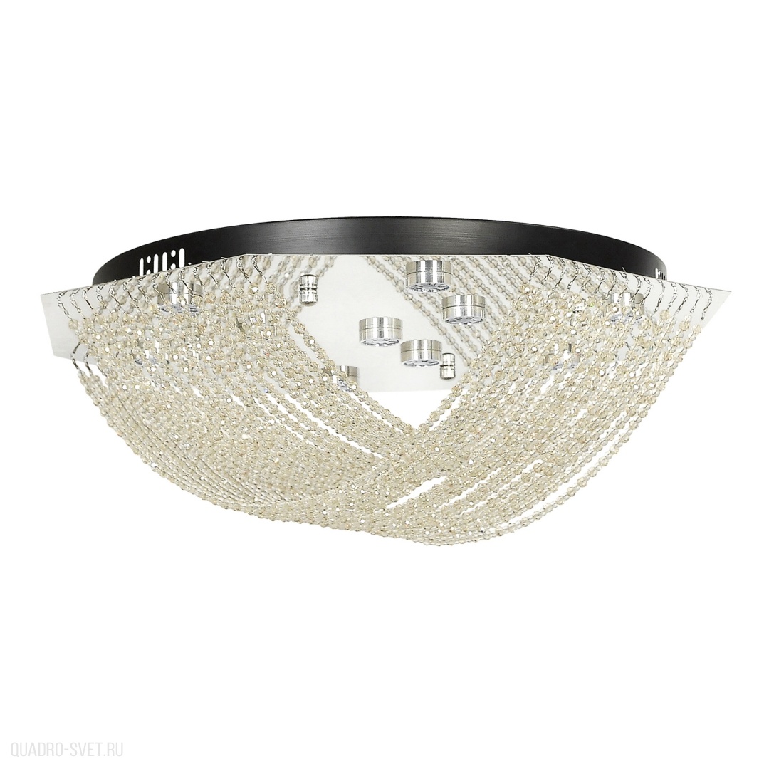 металла цвета никель. Поверхность арматуры глянцевая. Плафон изготовлен из стекла прозрачного цвета. с глянцевой поверхностью. Декоративные элементы выполнены из хрусталя. Осветительный прибор рассчитан на освещение пространства площадью 45 кв. м. Тип цоколя используемых ламп LED. Производитель рекомендует использовать лампы мощностью не более 10 Вт. Суммарная мощность светильника составляет 100 Вт. Лампочки входят в комплект. Защита от попадания влаги и пыли внутрь изделия не предусмотрена. Имеется пульт ДУ. Цвет свечения нейтральный белый (4500K). Рекомендуем к применению в гостиной, кабинете, прихожей, спальне.