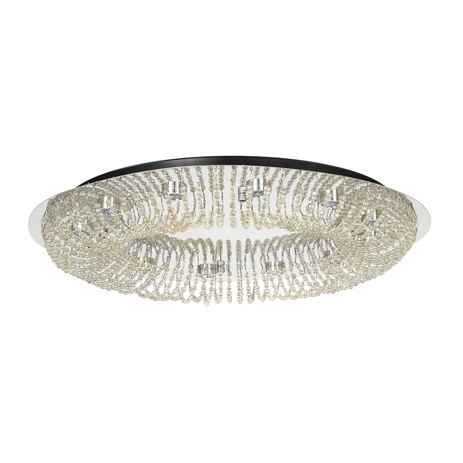 металла цвета никель. Поверхность арматуры глянцевая. Плафон изготовлен из стекла прозрачного цвета. с глянцевой поверхностью. Декоративные элементы выполнены из хрусталя. Осветительный прибор рассчитан на освещение пространства площадью 54 кв. м. Тип цоколя используемых ламп LED. Производитель рекомендует использовать лампы мощностью не более 10 Вт. Суммарная мощность светильника составляет 120 Вт. Лампочки входят в комплект. Защита от попадания влаги и пыли внутрь изделия не предусмотрена. Имеется пульт ДУ. Цвет свечения нейтральный белый (4500K). Рекомендуем к применению в гостиной, кабинете, прихожей, спальне.