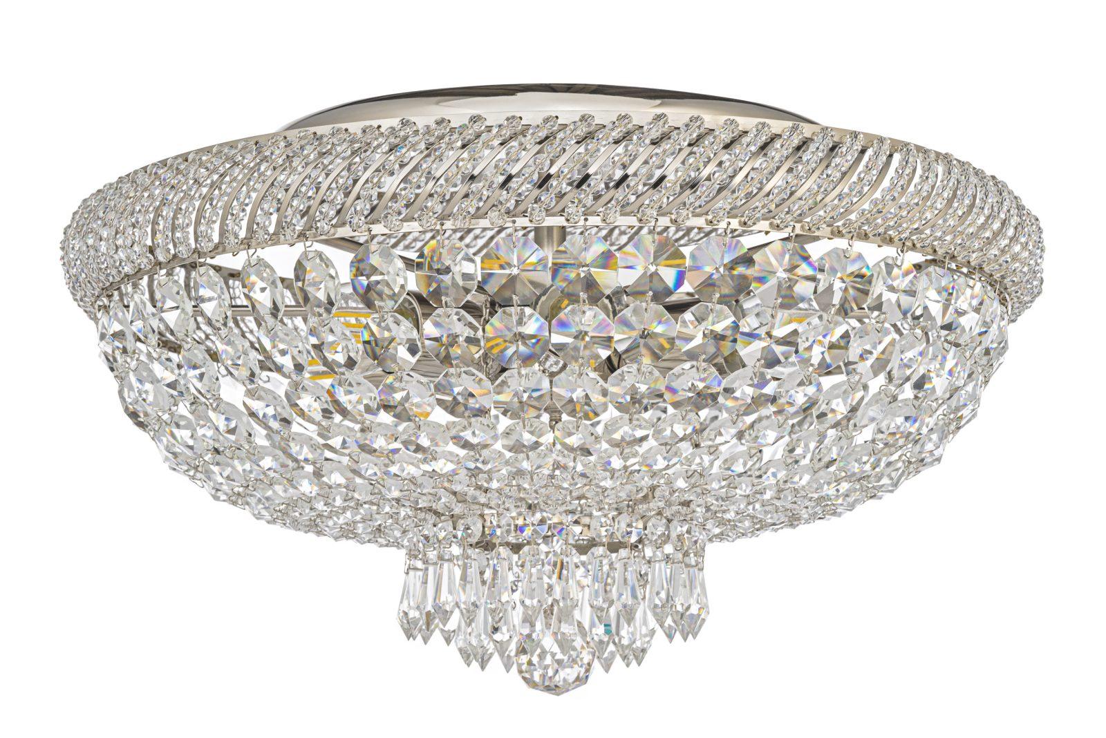 металла цвета никель. Поверхность арматуры матовая. Плафон изготовлен из хрусталя прозрачного цвета. с глянцевой поверхностью. Декоративные элементы выполнены из прозрачного хрусталя. Осветительный прибор рассчитан на освещение пространства площадью 18 кв. м. Тип цоколя используемых ламп E27. Производитель рекомендует использовать лампы мощностью не более 60 Вт. Суммарная мощность светильника составляет 360 Вт. Лампочки в комплект не входят. Защита от попадания влаги и пыли внутрь изделия не предусмотрена. Рекомендуем к применению в гостиной, кабинете, спальне.