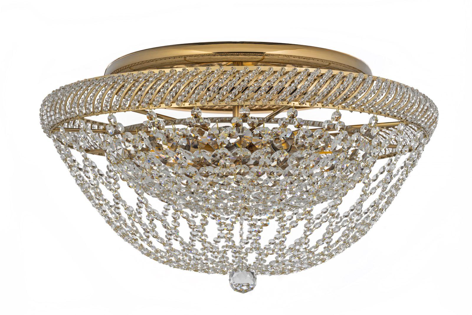 металла золотого цвета. Поверхность арматуры глянцевая. Плафон изготовлен из хрусталя прозрачного цвета. с глянцевой поверхностью. Декоративные элементы выполнены из прозрачного хрусталя. Осветительный прибор рассчитан на освещение пространства площадью 24 кв. м. Тип цоколя используемых ламп E27. Производитель рекомендует использовать лампы мощностью не более 60 Вт. Суммарная мощность светильника составляет 480 Вт. Лампочки в комплект не входят. Защита от попадания влаги и пыли внутрь изделия не предусмотрена. Рекомендуем к применению в гостиной, кабинете, спальне.