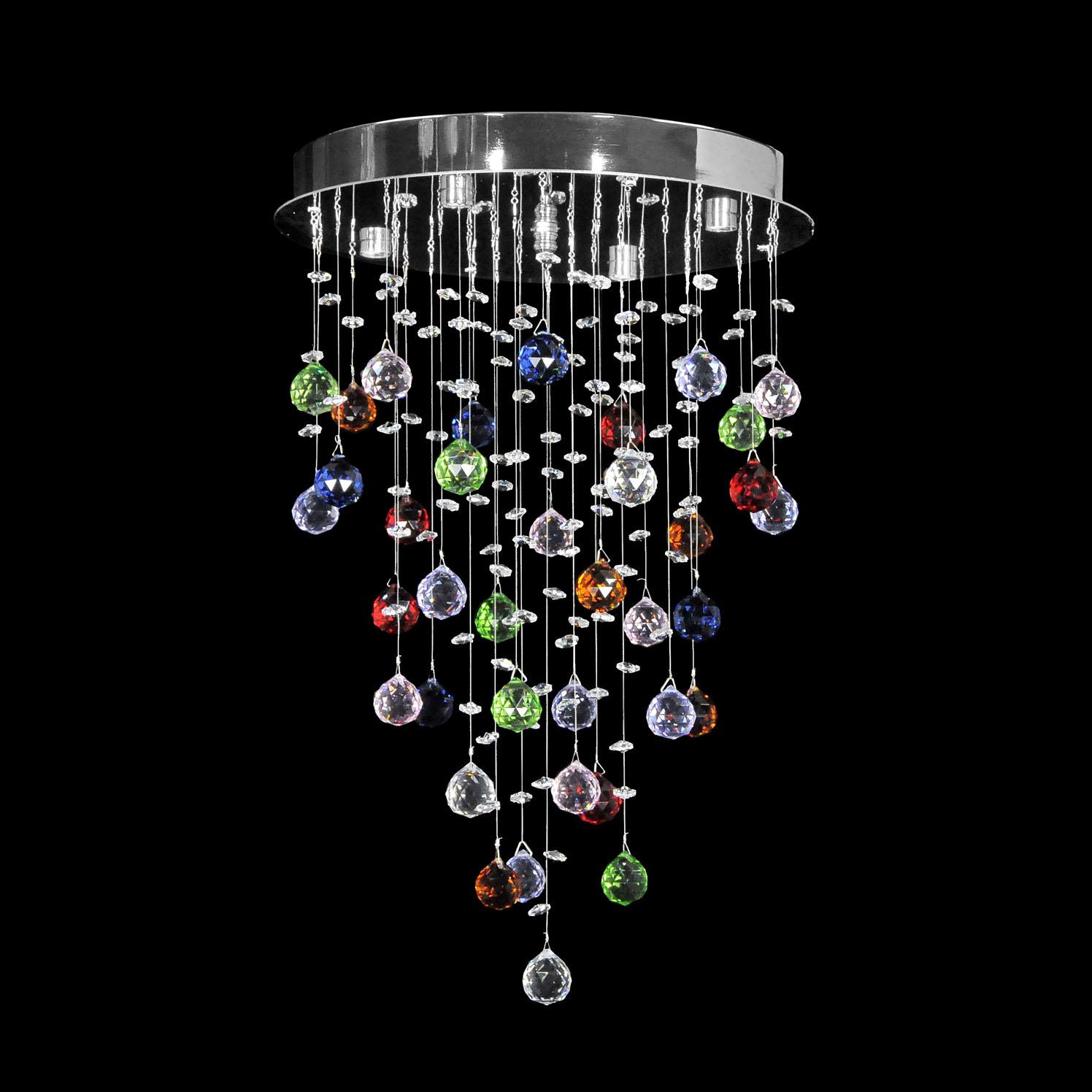 металла цвета никель. Поверхность арматуры матовая. Плафон изготовлен из хрусталя разноцветной окраски. с глянцевой поверхностью. Декоративные элементы выполнены из цветного хрусталя. Осветительный прибор рассчитан на освещение пространства площадью 8 кв. м. Тип цоколя используемых ламп G9. Производитель рекомендует использовать лампы мощностью не более 40 Вт. Суммарная мощность светильника составляет 160 Вт. Лампочки в комплект не входят. Защита от попадания влаги и пыли внутрь изделия не предусмотрена. Рекомендуем к применению в гостиной, спальне, прихожей, кабинете.