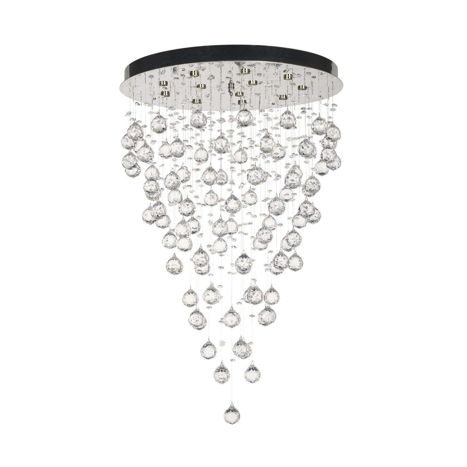металла цвета никель. Поверхность арматуры матовая. Плафон изготовлен из хрусталя прозрачного цвета. с глянцевой поверхностью. Декоративные элементы выполнены из прозрачного хрусталя. Осветительный прибор рассчитан на освещение пространства площадью 24 кв. м. Тип цоколя используемых ламп G9. Производитель рекомендует использовать лампы мощностью не более 40 Вт. Суммарная мощность светильника составляет 480 Вт. Лампочки в комплект не входят. Защита от попадания влаги и пыли внутрь изделия не предусмотрена. Рекомендуем к применению в гостиной, кабинете, прихожей, спальне.
