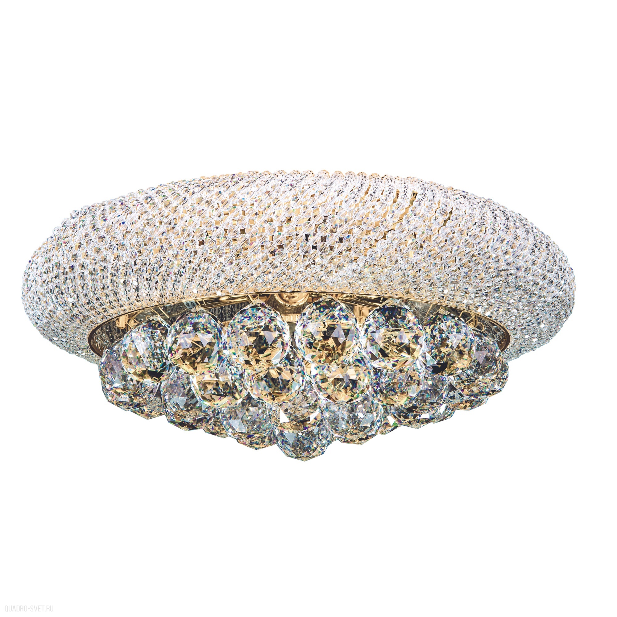 металла золотого цвета. Поверхность арматуры матовая. Плафон изготовлен из хрусталя прозрачного цвета. с глянцевой поверхностью. Декоративные элементы выполнены из прозрачного хрусталя. Осветительный прибор рассчитан на освещение пространства площадью 12 кв. м. Тип цоколя используемых ламп E14. Производитель рекомендует использовать лампы мощностью не более 40 Вт. Суммарная мощность светильника составляет 240 Вт. Лампочки в комплект не входят. Защита от попадания влаги и пыли внутрь изделия не предусмотрена. Рекомендуем к применению в гостиной, кабинете, прихожей, спальне.