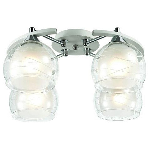 металла белого и хромового цветов. Поверхность арматуры глянцевая. Плафон изготовлен из стекла белого и прозрачного цветов с матовым рисунком, имеет сферическую форму и матовую поверхность. Направлен вниз. Осветительный прибор рассчитан на освещение пространства площадью 12 кв. м. Тип цоколя используемых ламп E27. Производитель рекомендует использовать лампы мощностью не более 60 Вт. Суммарная мощность светильника составляет 240 Вт. Лампочки в комплект не входят. Защита от попадания влаги и пыли внутрь изделия не предусмотрена. Рекомендуем к применению в гостиной, кабинете, спальне.