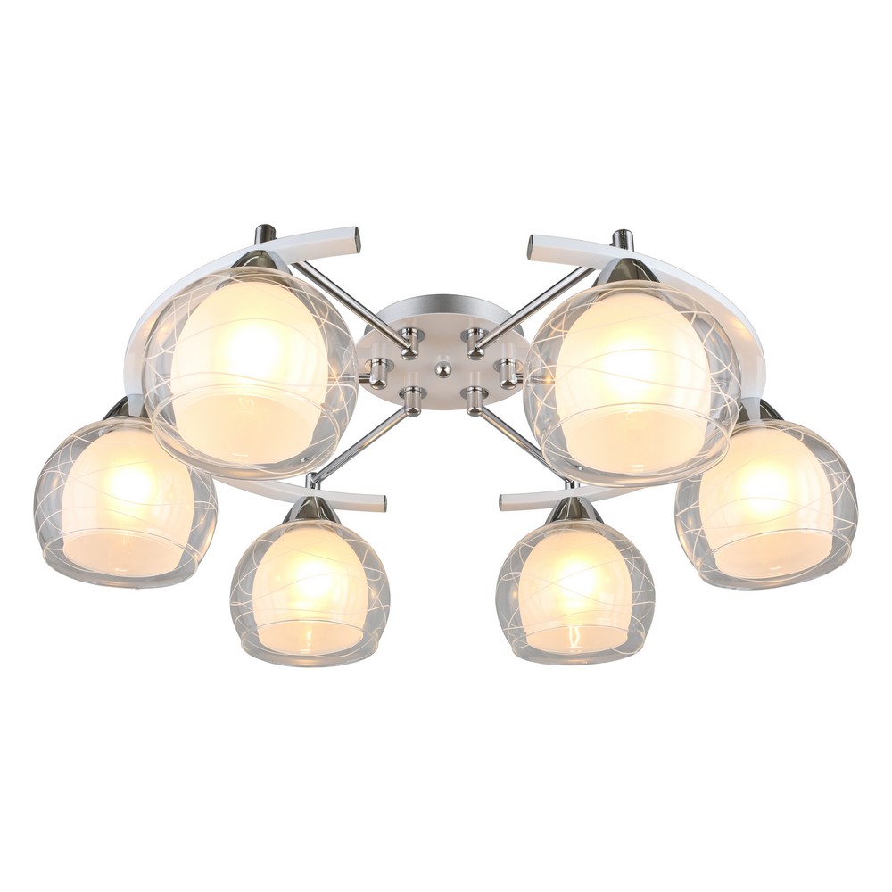 металла белого и хромового цветов. Поверхность арматуры глянцевая. Плафон изготовлен из стекла белого и прозрачного цветов с матовым рисунком, имеет сферическую форму и матовую поверхность. Направлен вниз. Осветительный прибор рассчитан на освещение пространства площадью 18 кв. м. Тип цоколя используемых ламп E27. Производитель рекомендует использовать лампы мощностью не более 60 Вт. Суммарная мощность светильника составляет 360 Вт. Лампочки в комплект не входят. Защита от попадания влаги и пыли внутрь изделия не предусмотрена. Рекомендуем к применению в гостиной, кабинете, спальне.