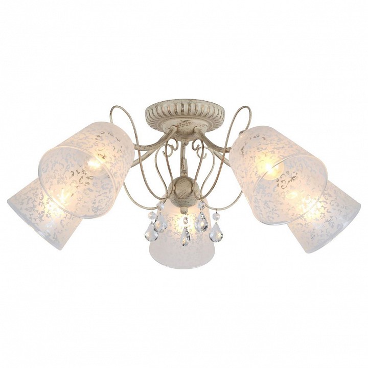 металла белого цвета с золотой патиной. Поверхность арматуры матовая, рельефная. Плафон изготовлен из стекла белого и прозрачного цветов, имеет конусную форму и матовую поверхность. Направлен в стороны. Декоративные элементы выполнены из прозрачного хрусталя. Осветительный прибор рассчитан на освещение пространства площадью 10 кв. м. Тип цоколя используемых ламп E14. Производитель рекомендует использовать лампы мощностью не более 40 Вт. Суммарная мощность светильника составляет 200 Вт. Лампочки в комплект не входят. Защита от попадания влаги и пыли внутрь изделия не предусмотрена. Рекомендуем к применению в гостиной, кабинете, спальне.