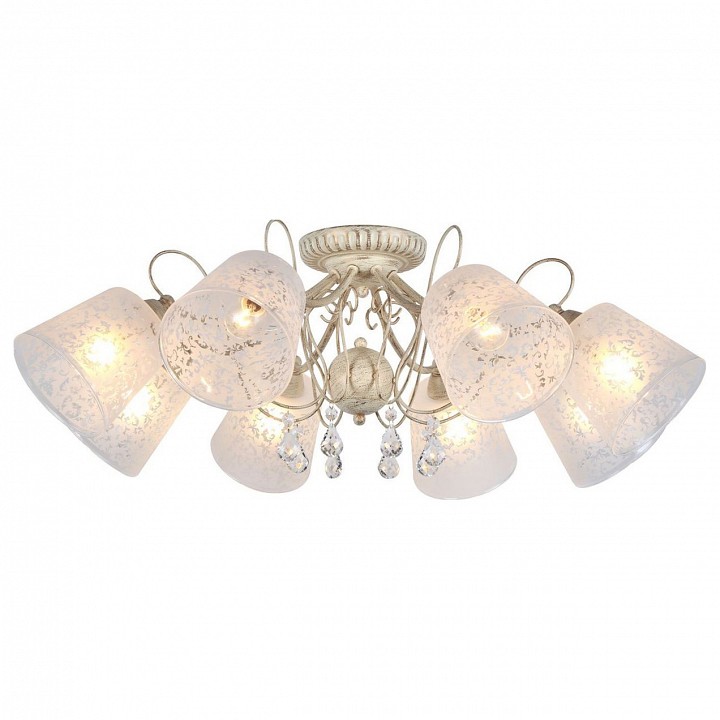 металла белого цвета с золотой патиной. Поверхность арматуры матовая, рельефная. Плафон изготовлен из стекла белого и прозрачного цветов, имеет конусную форму и матовую поверхность. Направлен в стороны. Декоративные элементы выполнены из прозрачного хрусталя. Осветительный прибор рассчитан на освещение пространства площадью 16 кв. м. Тип цоколя используемых ламп E14. Производитель рекомендует использовать лампы мощностью не более 40 Вт. Суммарная мощность светильника составляет 320 Вт. Лампочки в комплект не входят. Защита от попадания влаги и пыли внутрь изделия не предусмотрена. Рекомендуем к применению в гостиной, кабинете, спальне.