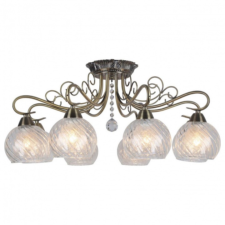 металла цвета состаренная бронза. Поверхность арматуры глянцевая. Плафон изготовлен из стекла прозрачного цвета, имеет сферическую форму и рельефную поверхность. Направлен вниз. Декоративные элементы выполнены из прозрачного хрусталя. Осветительный прибор рассчитан на освещение пространства площадью 16 кв. м. Тип цоколя используемых ламп E14. Производитель рекомендует использовать лампы мощностью не более 40 Вт. Суммарная мощность светильника составляет 320 Вт. Лампочки в комплект не входят. Защита от попадания влаги и пыли внутрь изделия не предусмотрена. Рекомендуем к применению в гостиной, кабинете, спальне.