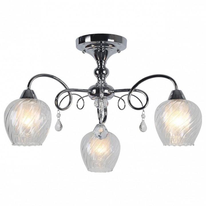 металла цвета хром. Поверхность арматуры глянцевая. Плафон изготовлен из стекла прозрачного цвета, имеет сферическую форму и рельефную поверхность. Направлен вниз. Декоративные элементы выполнены из прозрачного хрусталя. Осветительный прибор рассчитан на освещение пространства площадью 6 кв. м. Тип цоколя используемых ламп E14. Производитель рекомендует использовать лампы мощностью не более 40 Вт. Суммарная мощность светильника составляет 120 Вт. Лампочки в комплект не входят. Защита от попадания влаги и пыли внутрь изделия не предусмотрена. Рекомендуем к применению в гостиной, кабинете, спальне.