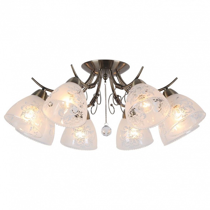 металла бронзового цвета. Поверхность арматуры матовая. Плафон изготовлен из стекла белого и прозрачного цветов, имеет форму колокола и матовую поверхность. Направлен в стороны. Декоративные элементы выполнены из прозрачного хрусталя. Осветительный прибор рассчитан на освещение пространства площадью 16 кв. м. Тип цоколя используемых ламп E14. Производитель рекомендует использовать лампы мощностью не более 40 Вт. Суммарная мощность светильника составляет 320 Вт. Лампочки в комплект не входят. Защита от попадания влаги и пыли внутрь изделия не предусмотрена. Рекомендуем к применению в гостиной, кабинете, спальне.