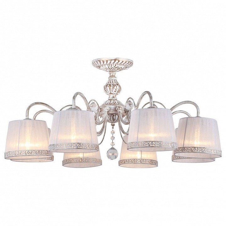 металла белого цвета с золотым рисунком. Поверхность арматуры матовая. Плафон изготовлен из текстиля белого цвета с золотистым орнаментом, имеет конусную форму и матовую рельефную поверхность. Направлен вниз. Декоративные элементы выполнены из прозрачного хрусталя. Осветительный прибор рассчитан на освещение пространства площадью 16 кв. м. Тип цоколя используемых ламп E14. Производитель рекомендует использовать лампы мощностью не более 40 Вт. Суммарная мощность светильника составляет 320 Вт. Лампочки в комплект не входят. Защита от попадания влаги и пыли внутрь изделия не предусмотрена. Рекомендуем к применению в гостиной, кабинете, спальне.