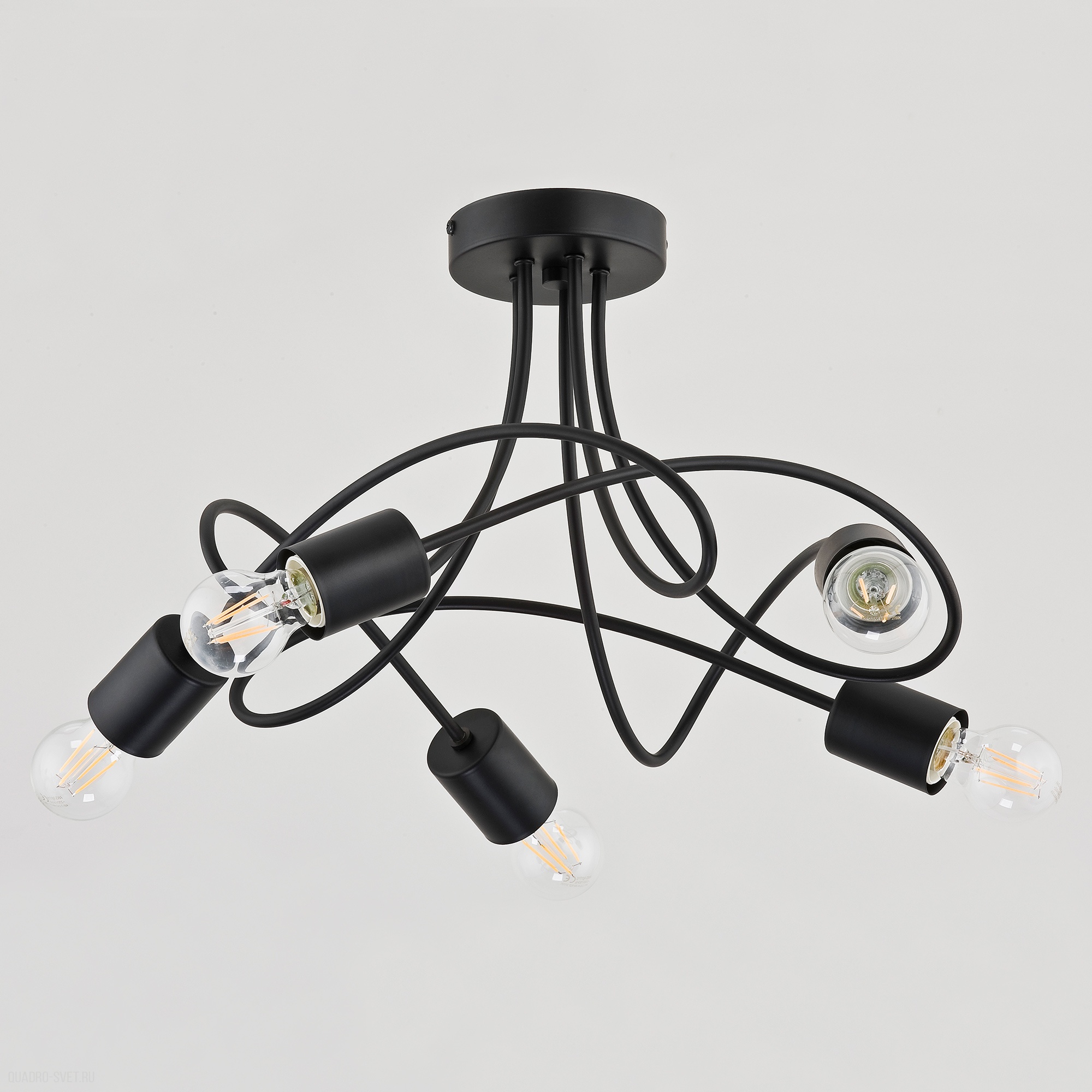 металла черного цвета. Поверхность арматуры глянцевая. Плафон отсутствует. Лампы направленывниз. Осветительный прибор рассчитан на освещение пространства площадью 24 кв. м. Тип цоколя используемых ламп E27. Производитель рекомендует использовать лампы мощностью не более 60 Вт. Суммарная мощность светильника составляет 300 Вт. Лампочки в комплект не входят. Защита от попадания влаги и пыли внутрь изделия не предусмотрена. Рекомендуем к применению в гостиной, спальне, прихожей, кабинете.