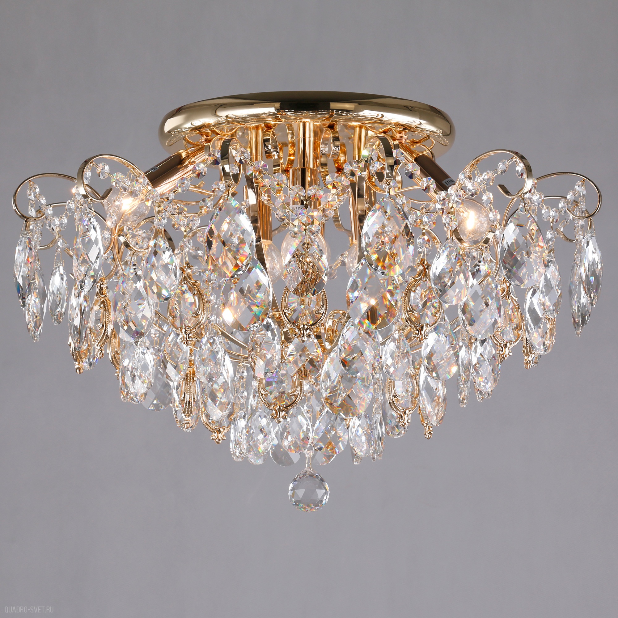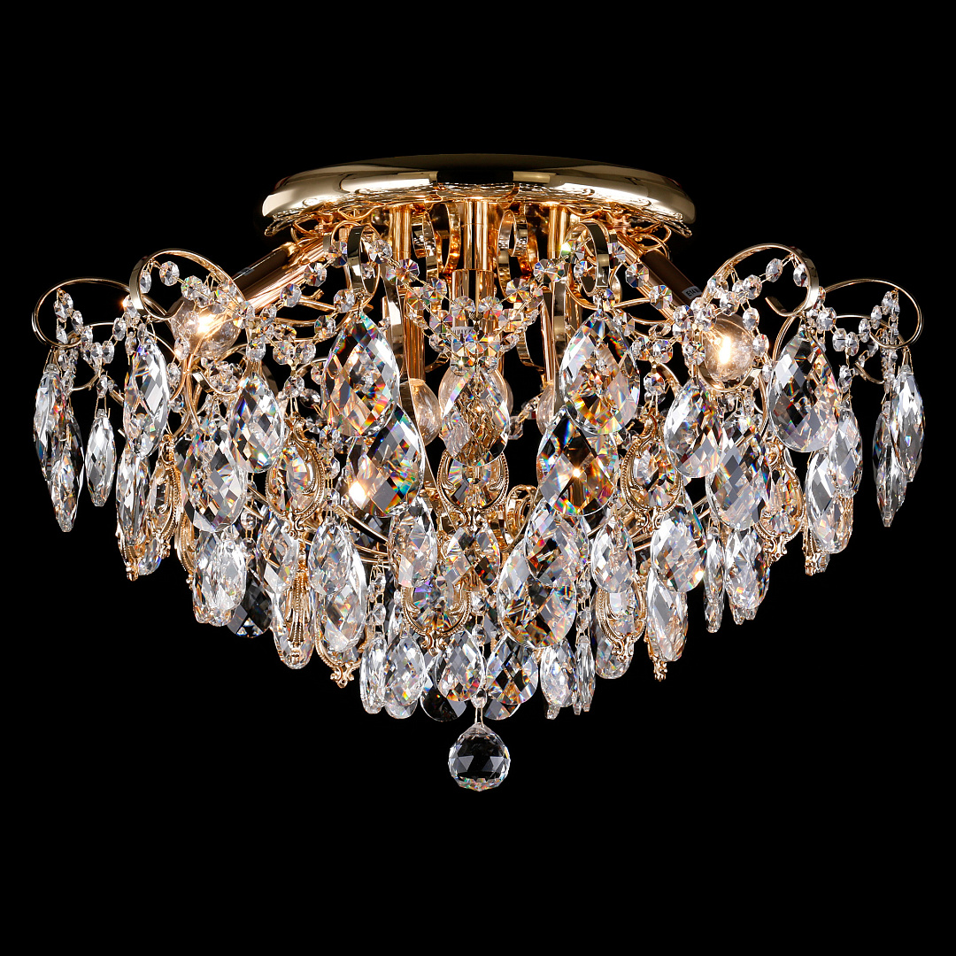 металла золотого цвета. Поверхность арматуры глянцевая. Плафон изготовлен из хрусталя прозрачного цвета, имеет круглую плоскую форму и глянцевую поверхность. Направляетсяв любую сторону. Декоративные элементы выполнены из прозрачного хрусталя. Осветительный прибор рассчитан на освещение пространства площадью 29 кв. м. Тип цоколя используемых ламп E14. Производитель рекомендует использовать лампы мощностью не более 60 Вт. Суммарная мощность светильника составляет 360 Вт. Лампочки в комплект не входят. Защита от попадания влаги и пыли внутрь изделия не предусмотрена. Рекомендуем к применению в гостиной, кабинете, спальне.