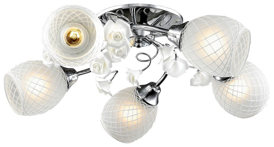 Потолочная люстра 705-107-05 итальянского производителя Velante из коллекции 705 исполнена в стиле флористика. Арматура светильника выполнена из металла цвета хром. Поверхность арматуры глянцевая. Плафон изготовлен из стекла белого цвета. с матовой поверхностью. Осветительный прибор рассчитан на освещение пространства площадью 15 кв. м. Тип цоколя используемых ламп E27. Производитель рекомендует использовать лампы мощностью не более 60 Вт. Суммарная мощность светильника составляет 300 Вт. Лампочки в комплект не входят. Защита от попадания влаги и пыли внутрь изделия не предусмотрена. Рекомендуем к применению в гостиной, спальне.