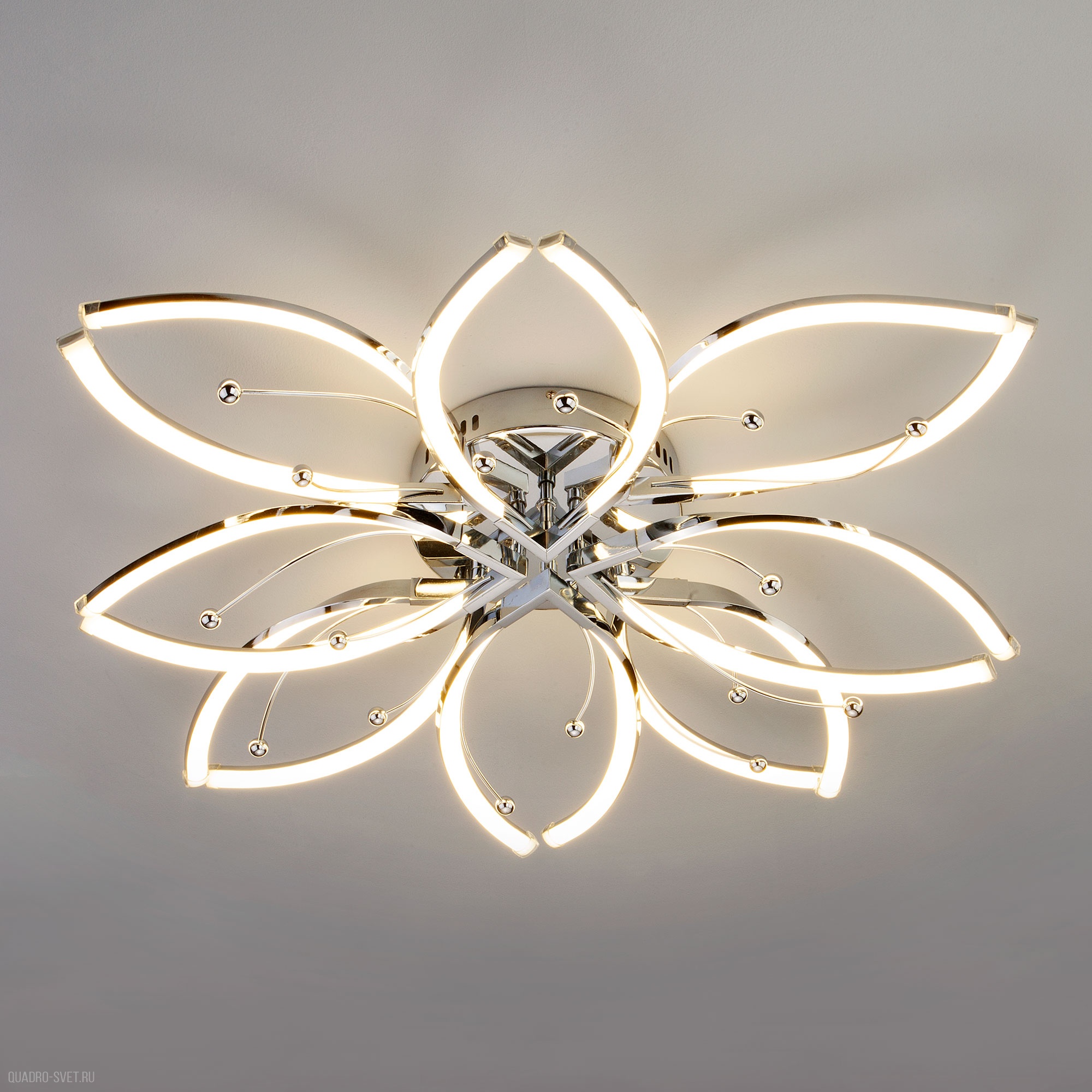 металла цвета хром. Поверхность арматуры матовая. Плафон изготовлен из акрила белого цвета. с глянцевой поверхностью. Осветительный прибор рассчитан на освещение пространства площадью 30 кв. м. Тип цоколя используемых ламп LED. Производитель рекомендует использовать лампы мощностью не более 12 Вт. Суммарная мощность светильника составляет 96 Вт. Лампочки входят в комплект. Защита от попадания влаги и пыли внутрь изделия не предусмотрена. Цвет свечения нейтральный белый (4200K). Рекомендуем к применению в гостиной, спальне, прихожей, кабинете.