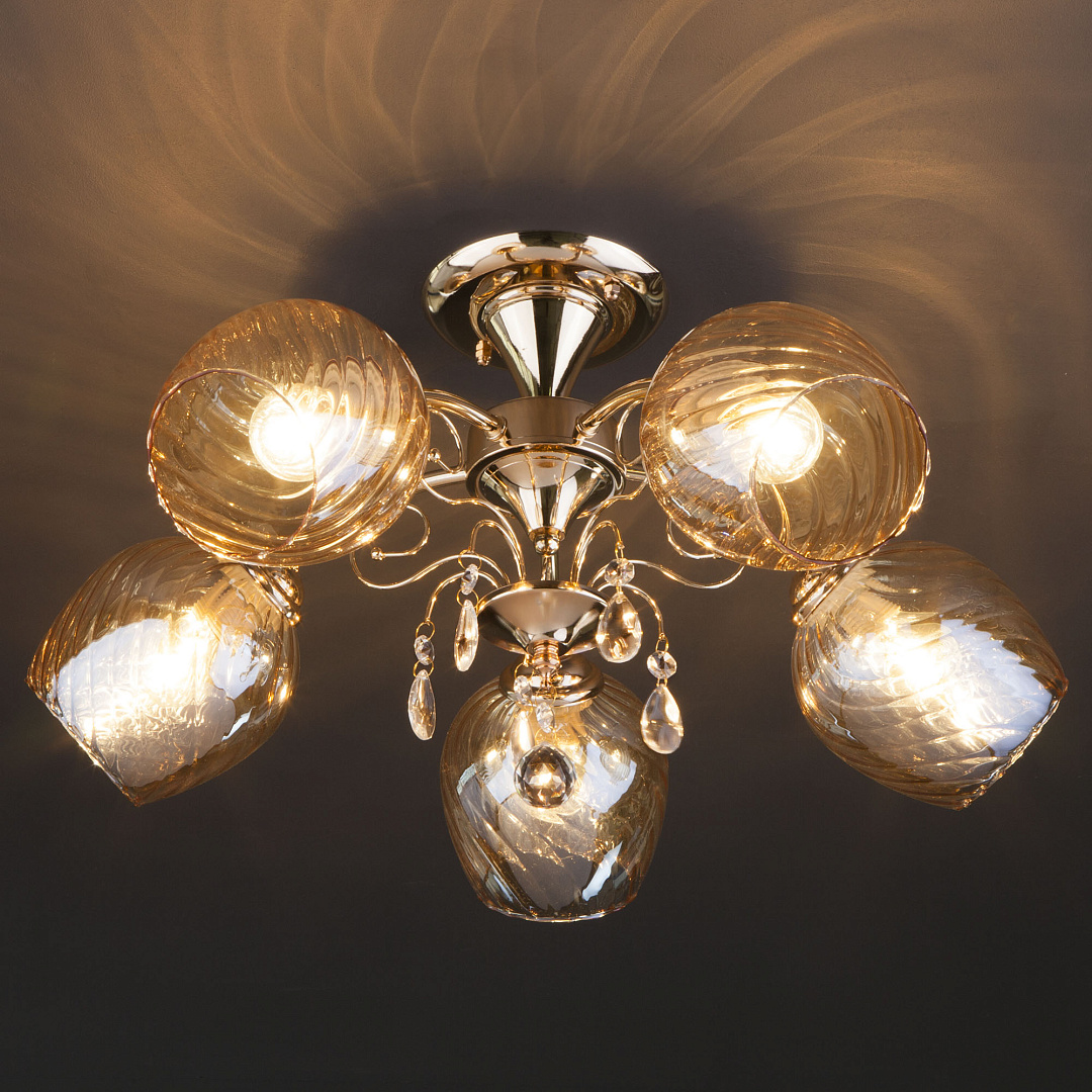 металла золотого цвета. Поверхность арматуры глянцевая. Плафон изготовлен из стекла янтарного цвета, имеет цилиндрическую форму Направлен вниз. Декоративные элементы выполнены из прозрачного хрусталя. Осветительный прибор рассчитан на освещение пространства площадью 24 кв. м. Тип цоколя используемых ламп E27. Производитель рекомендует использовать лампы мощностью не более 60 Вт. Суммарная мощность светильника составляет 300 Вт. Лампочки в комплект не входят. Защита от попадания влаги и пыли внутрь изделия не предусмотрена. Рекомендуем к применению в гостиной, спальне, прихожей, кабинете.