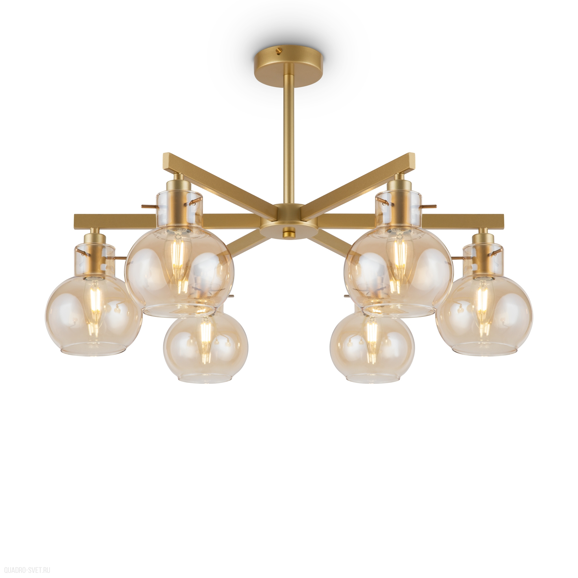 Металлическая арматура в золотом цвете. Стеклянные плафоны трендовой обтекаемой формы. Оттенок плафонов – шампань. Геометричный дизайн. Источник света – лампа с цоколем E14.