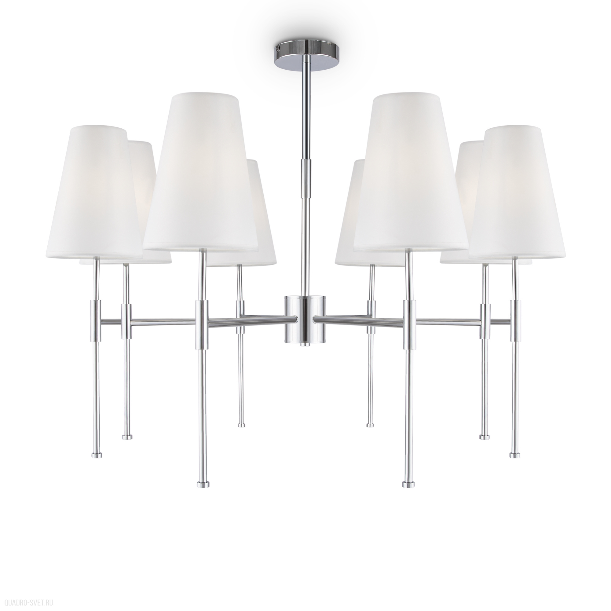 Материал арматуры – металл. Оттенки: хром, комбинация черного и латуни. Абажуры – белая ткань. Акцентный вытянутый силуэт. Источник света – лампа с цоколем E14.