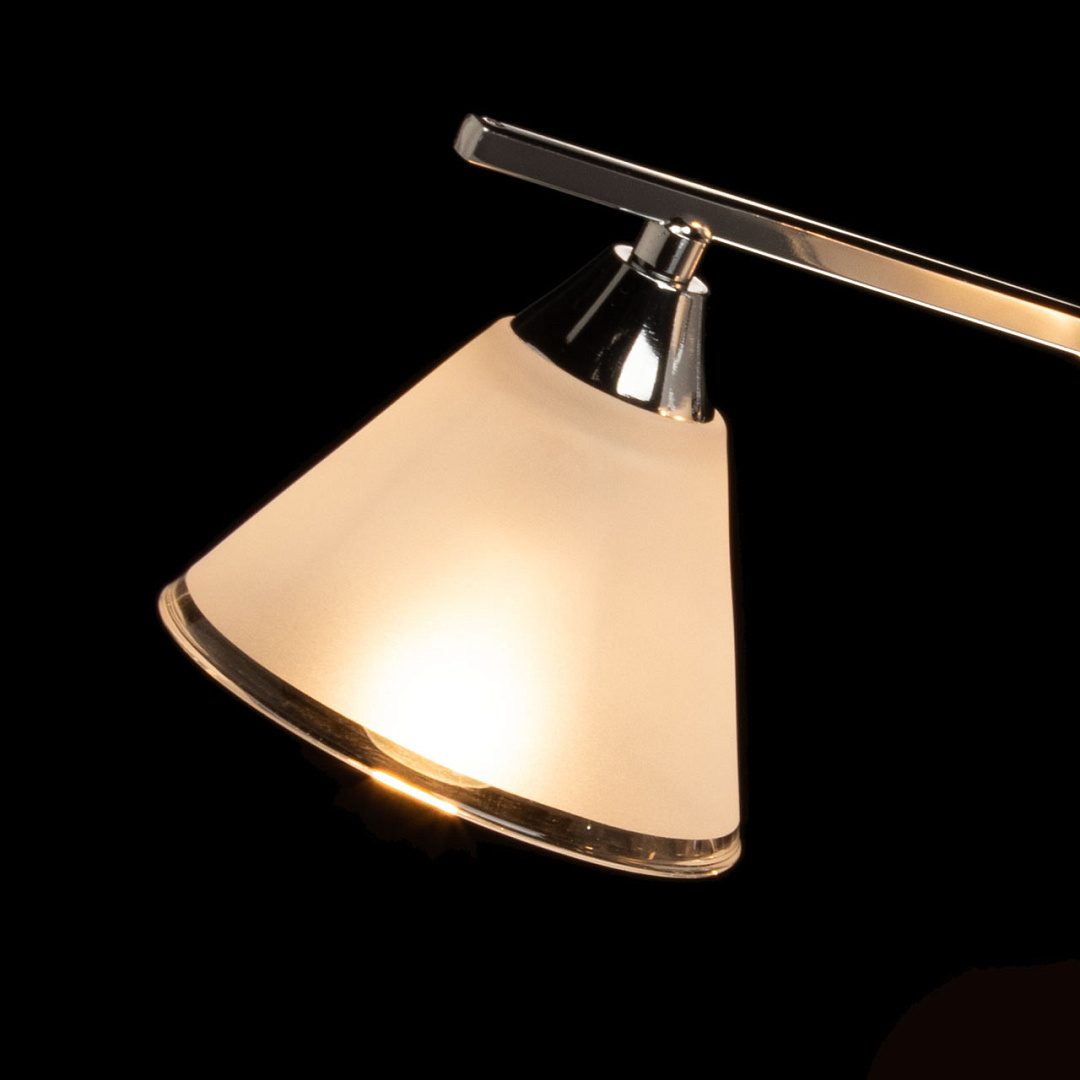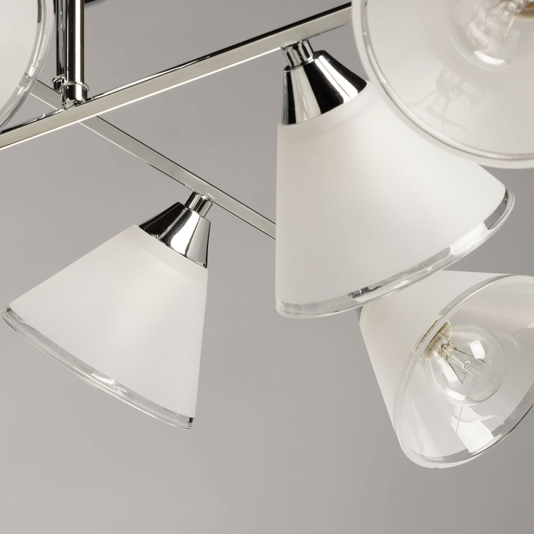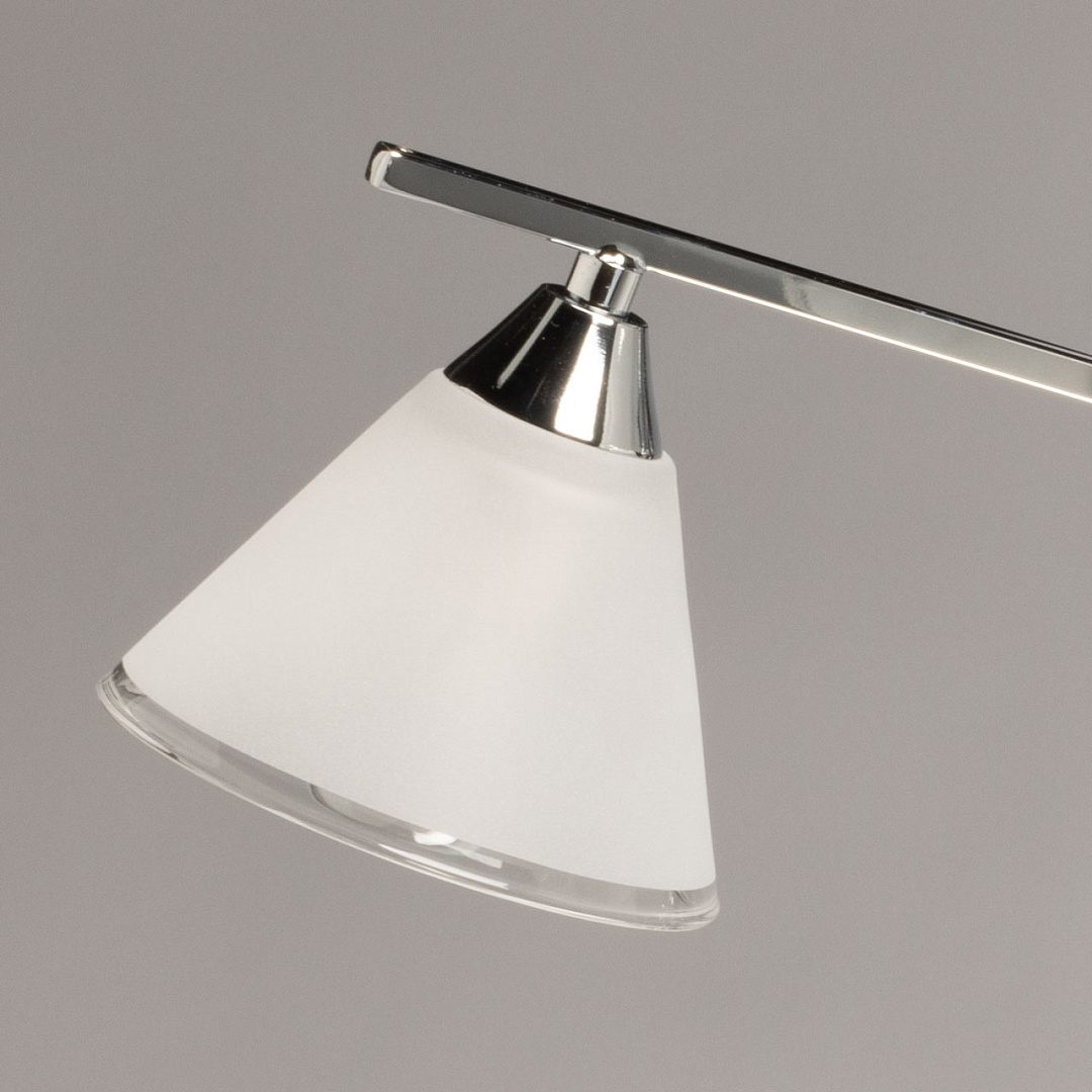 Потолочная люстра выполнена в современном минималистичном стиле.Светильник вытянут горизонтально, благодаря чему он освещает большую площадь.Матовые плафоны создают комфортное освещение, а ассиметричное расположение позволяет свету равномерно распределяться по помещению.Заменяемые источники света удобны в эксплуатации.Компактная высота светильника идеально подходит для помещений со стандартными потолками, не перегружая пространство.
