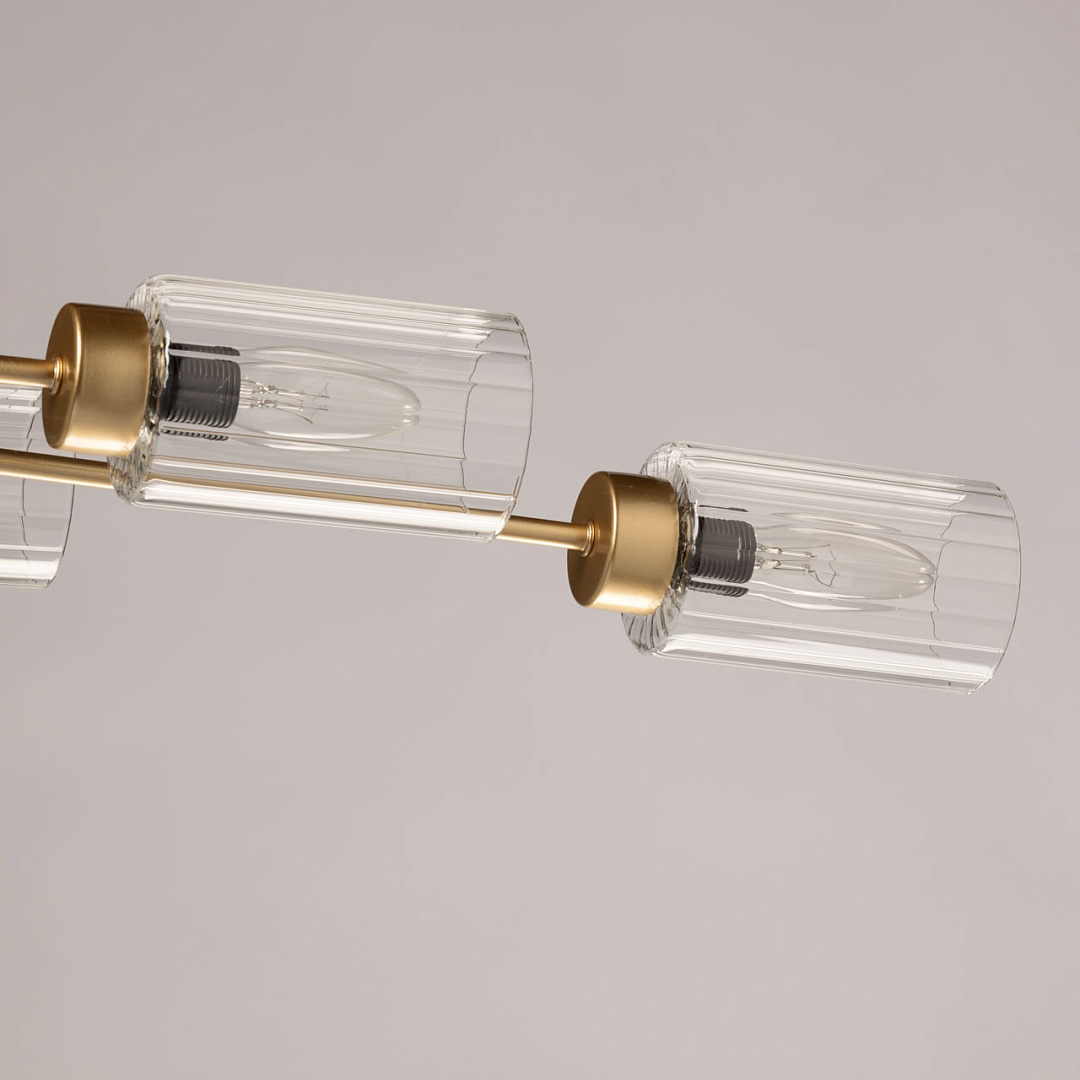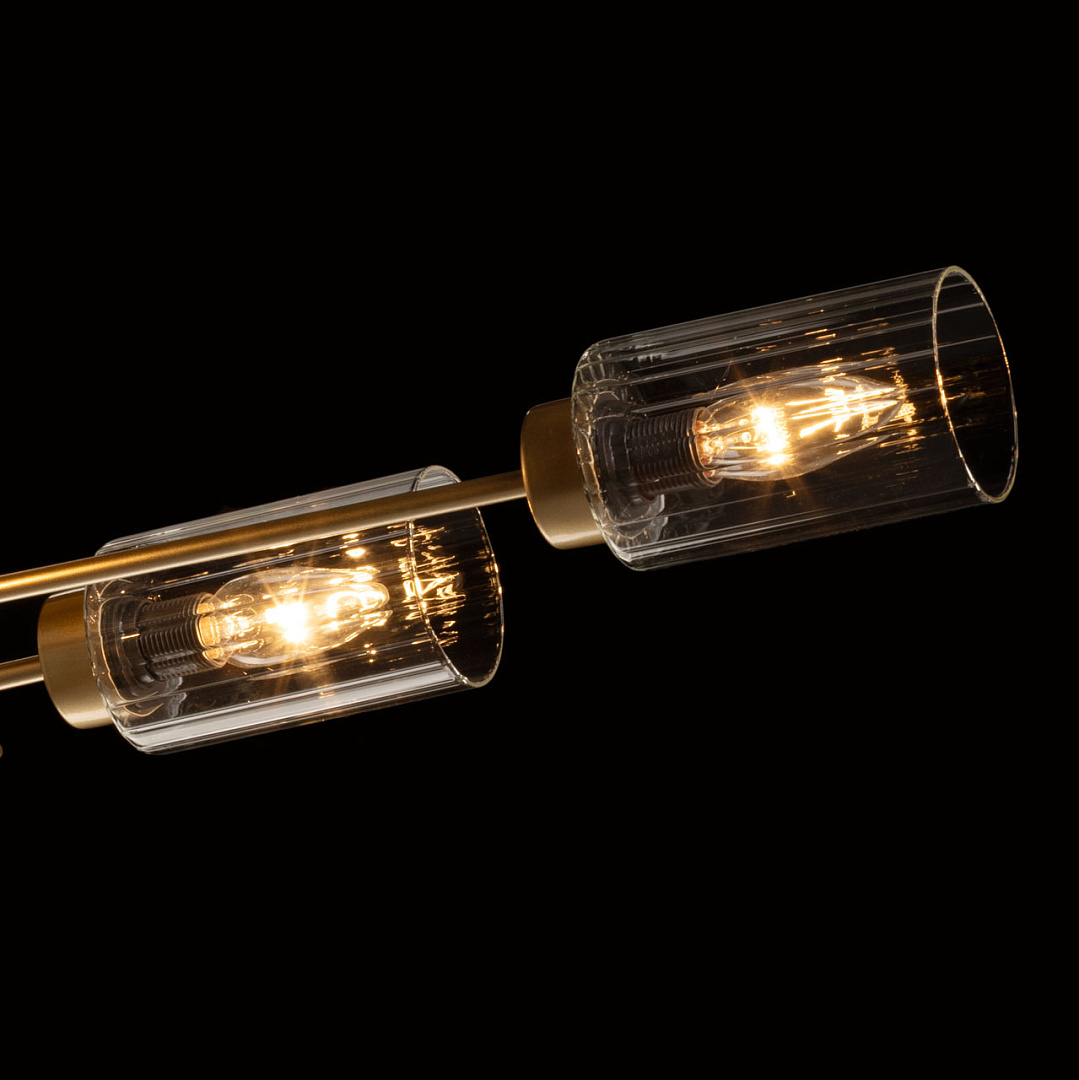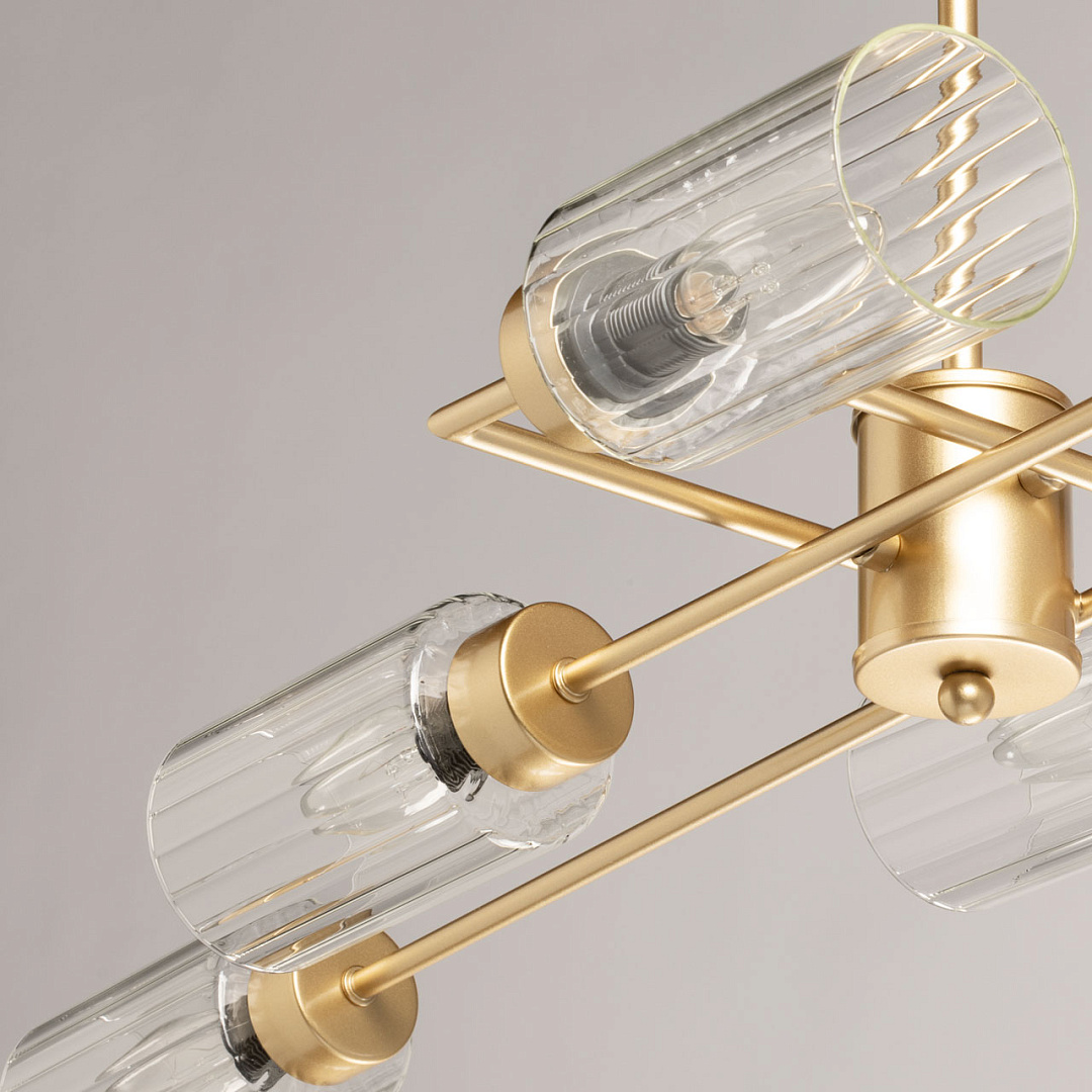 Минималистичный дизайн люстры идеально впишется в современный интерьер, добавляя ему элегантности и стиля. Прозрачные плафоны позволяют свету равномерно распределяться по помещению, создавая приятную атмосферу. Линейная текстура плафонов добавляет игре света дополнительный визуальный эффект. Светильник вытянут горизонтально, благодаря чему он освещает большую площадь. Компактная высота светильника делает его подходящим для помещений со стандартными потолками, не перегружая пространство.