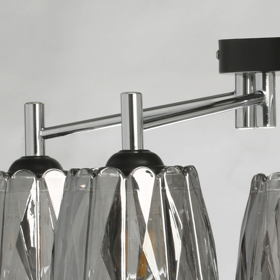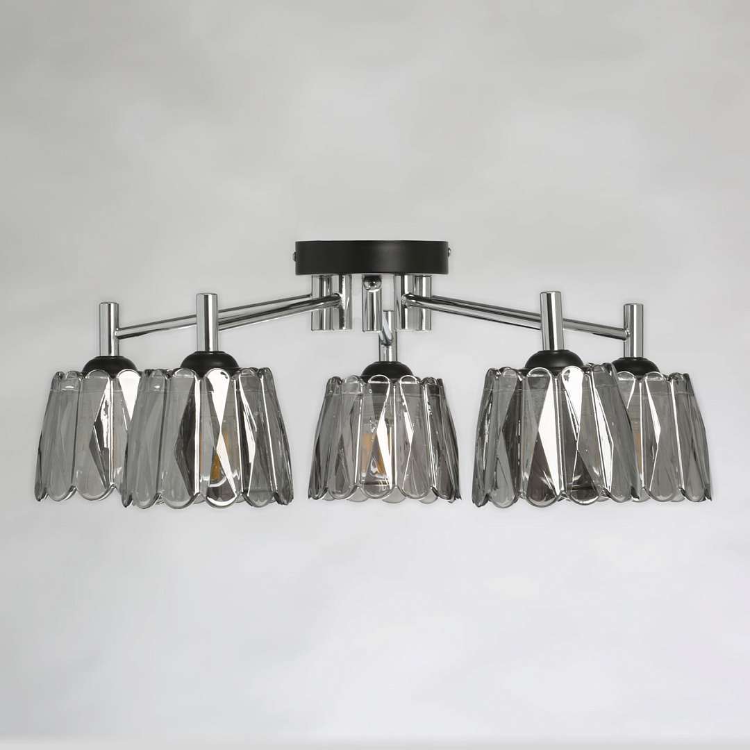 Лаконичный дизайн светильника идеален  для современных интерьеров.Фактурные плафоны из стекла дымчатого цвета эффектно смотрятся на потолке.Популярный  цвет  хрома в сочетании с черным позволяет декорировать современные интерьеры. Компактная высота модели идеальна для стандартных потолков в гостиную и в спальню.
