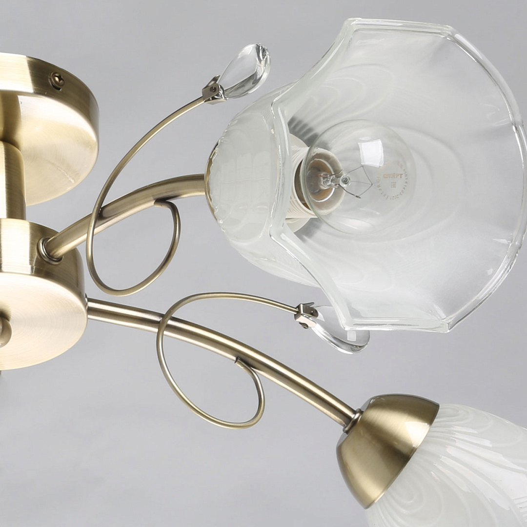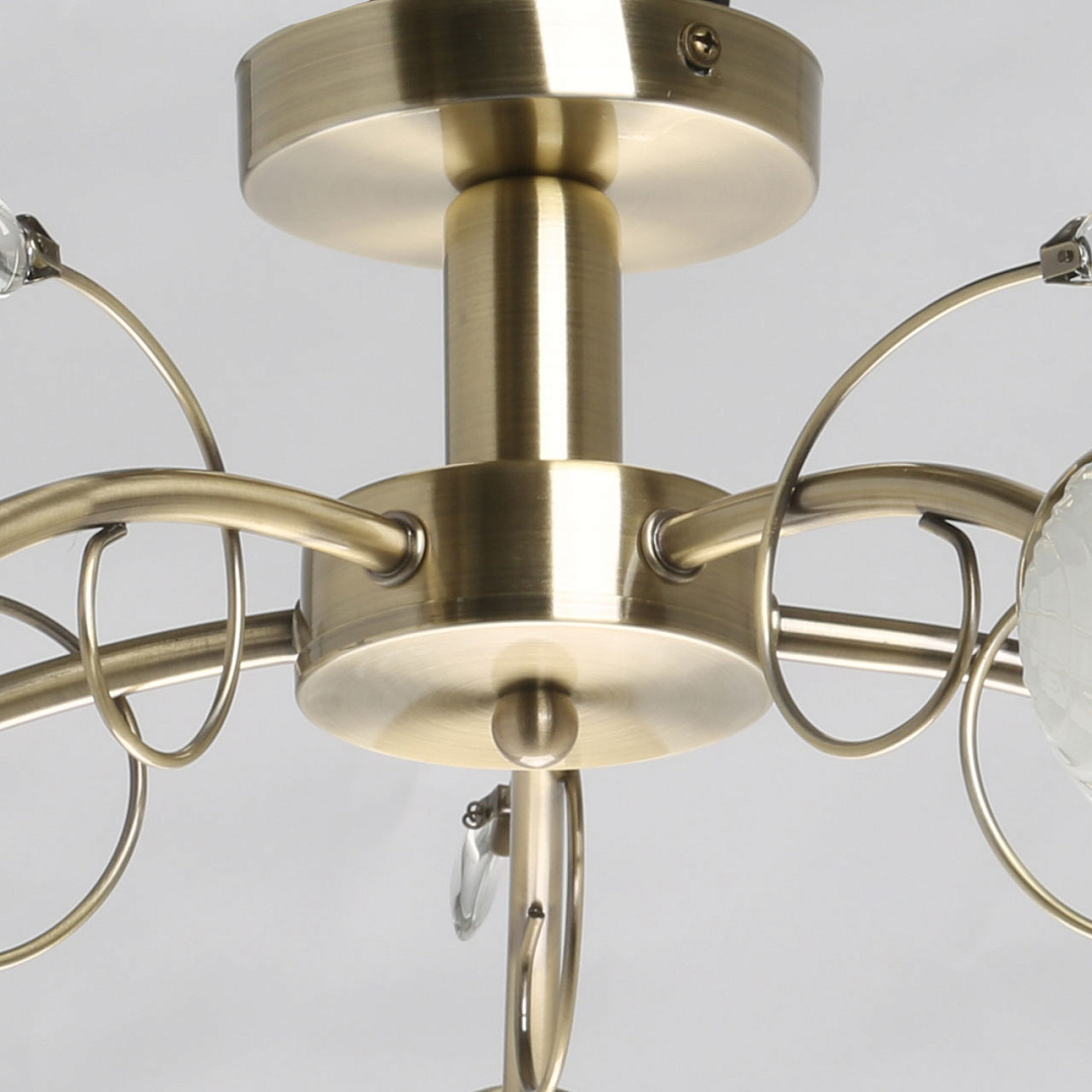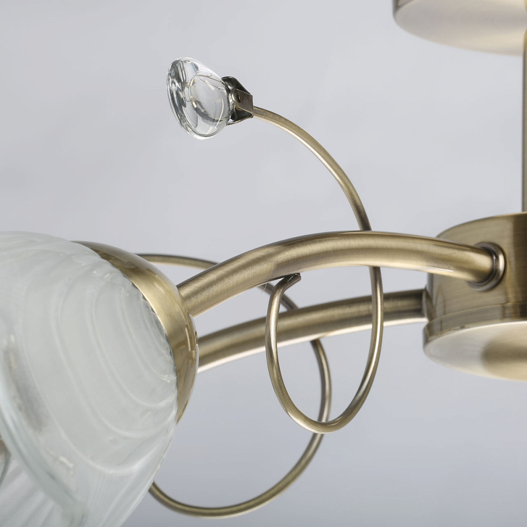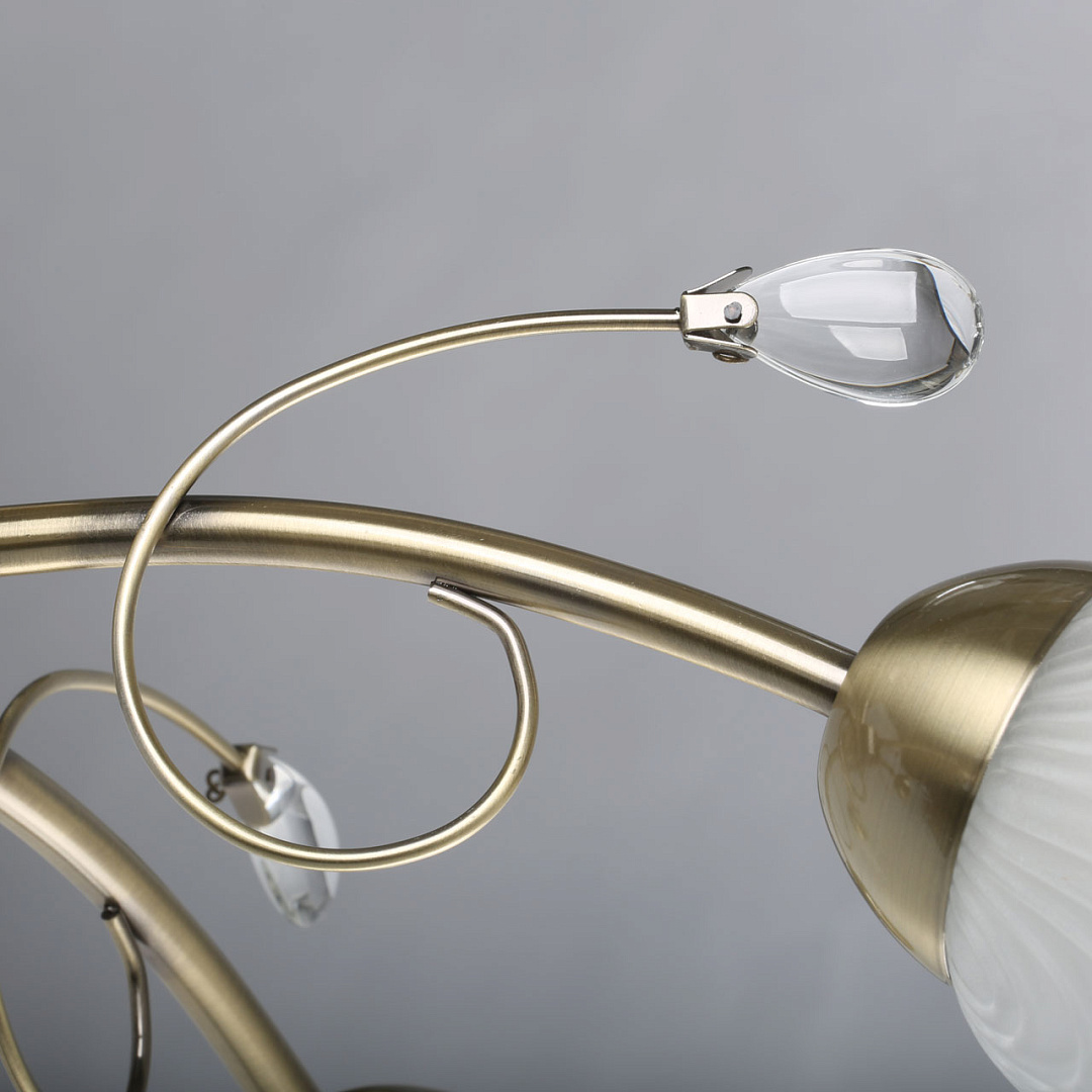 Классические элементы декора  цвета античной бронзы добавляют ценности модели.Матированные рельефные плафоны обеспечивают освещение.Потолочная люстра небольшой высоты сохраняет пространство комнаты