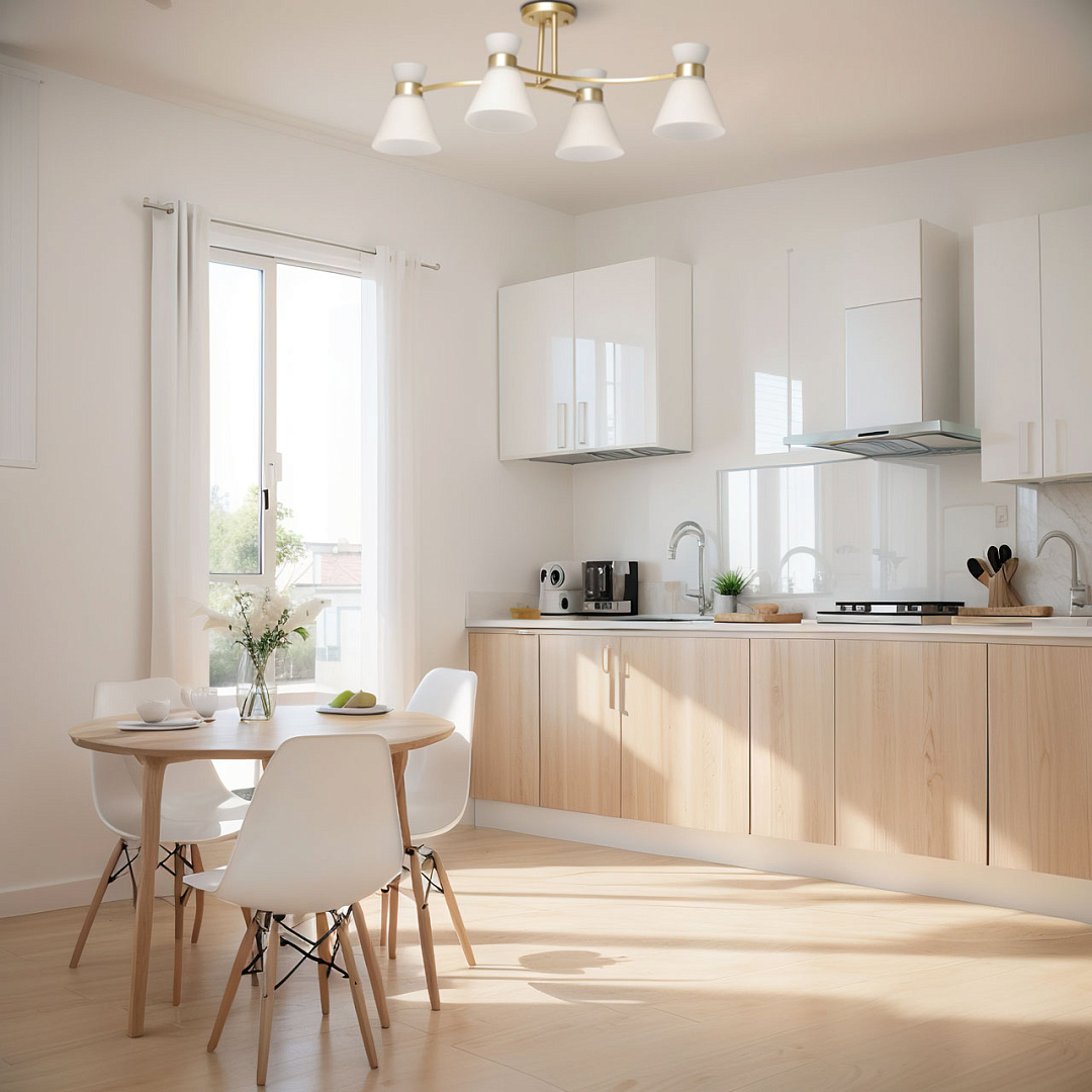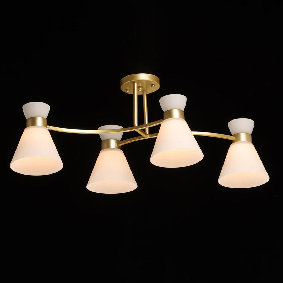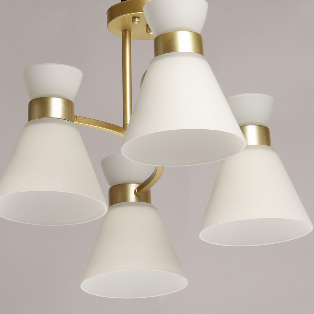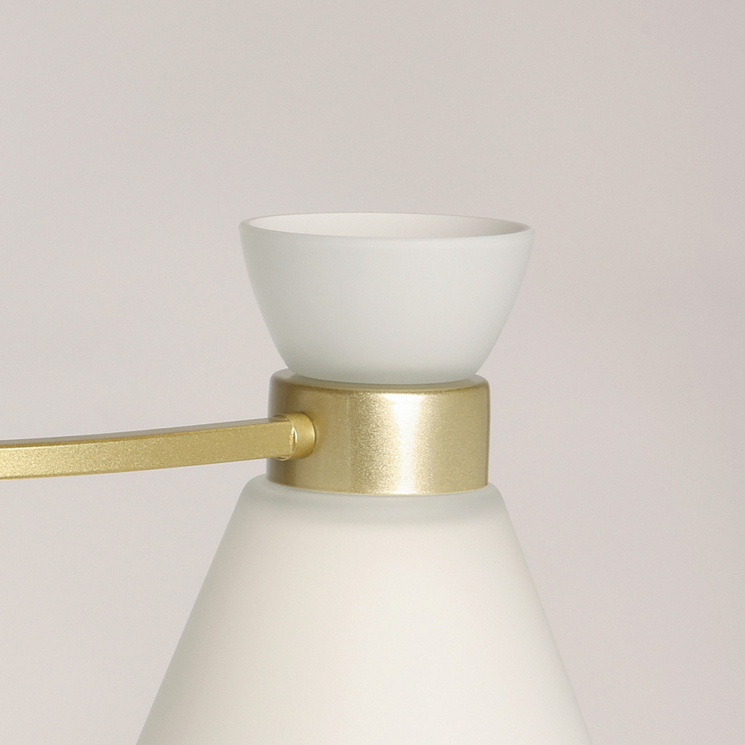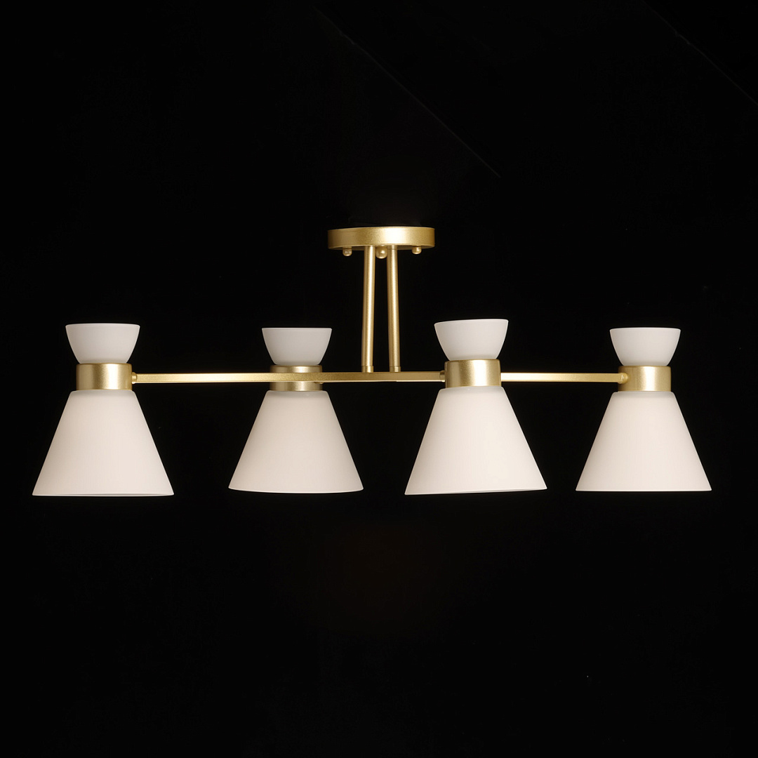 Актуальный цвет перламутрового золота придает люстре элегантность и стиль. Особый шарм создают белые стеклянные плафоны, направленные вниз. Вытянутая форма люстры гармонично объединяет освещение, дизайн и функциональность. Компактный размер люстры прекрасно подходит в интерьеры со стандартным потолком. Заменяемые источники света удобны в эксплуатации.