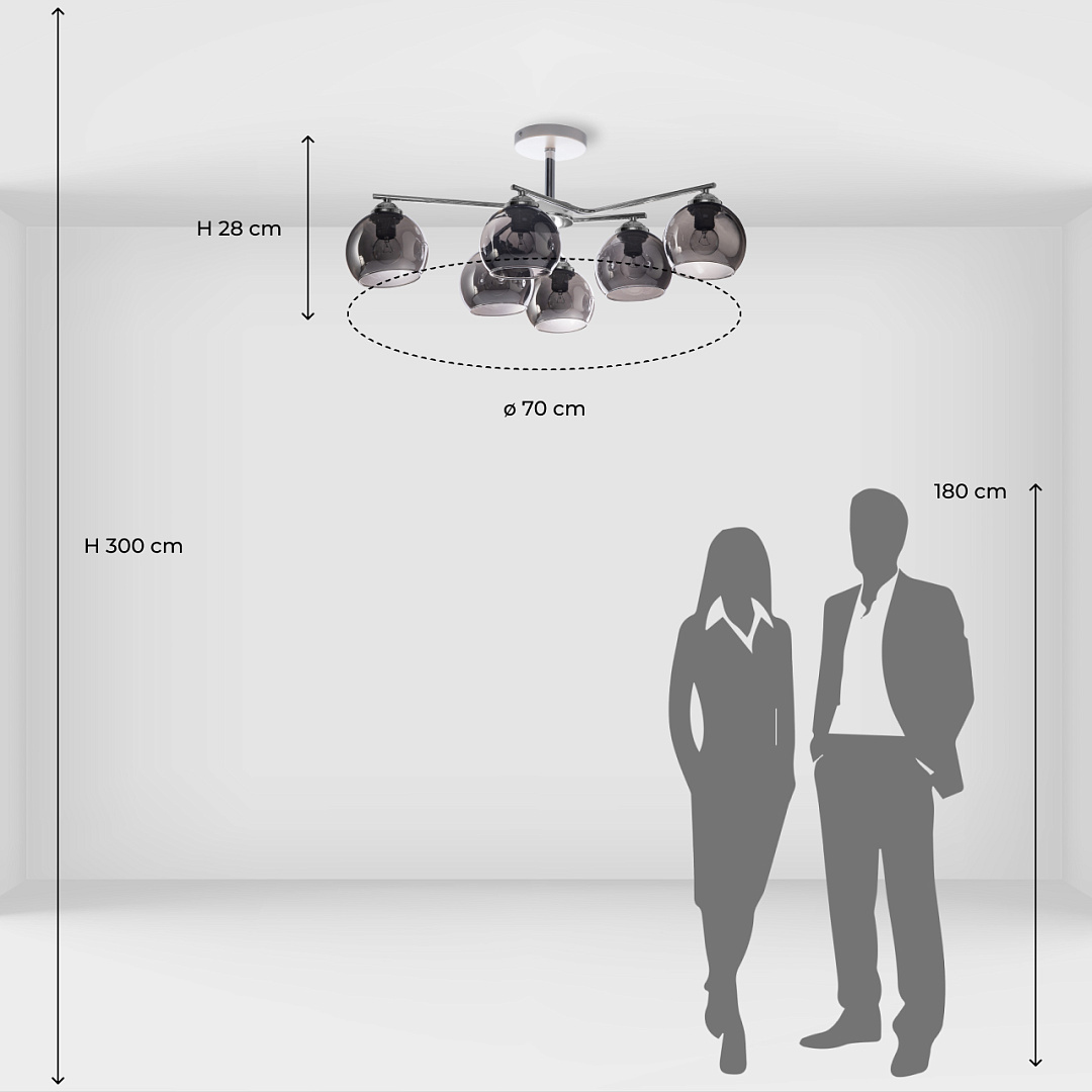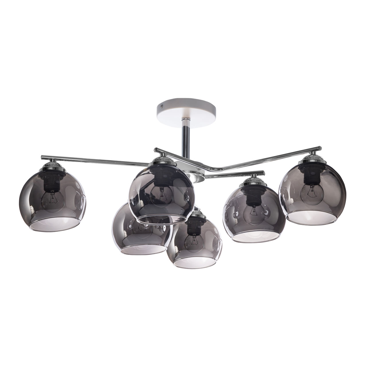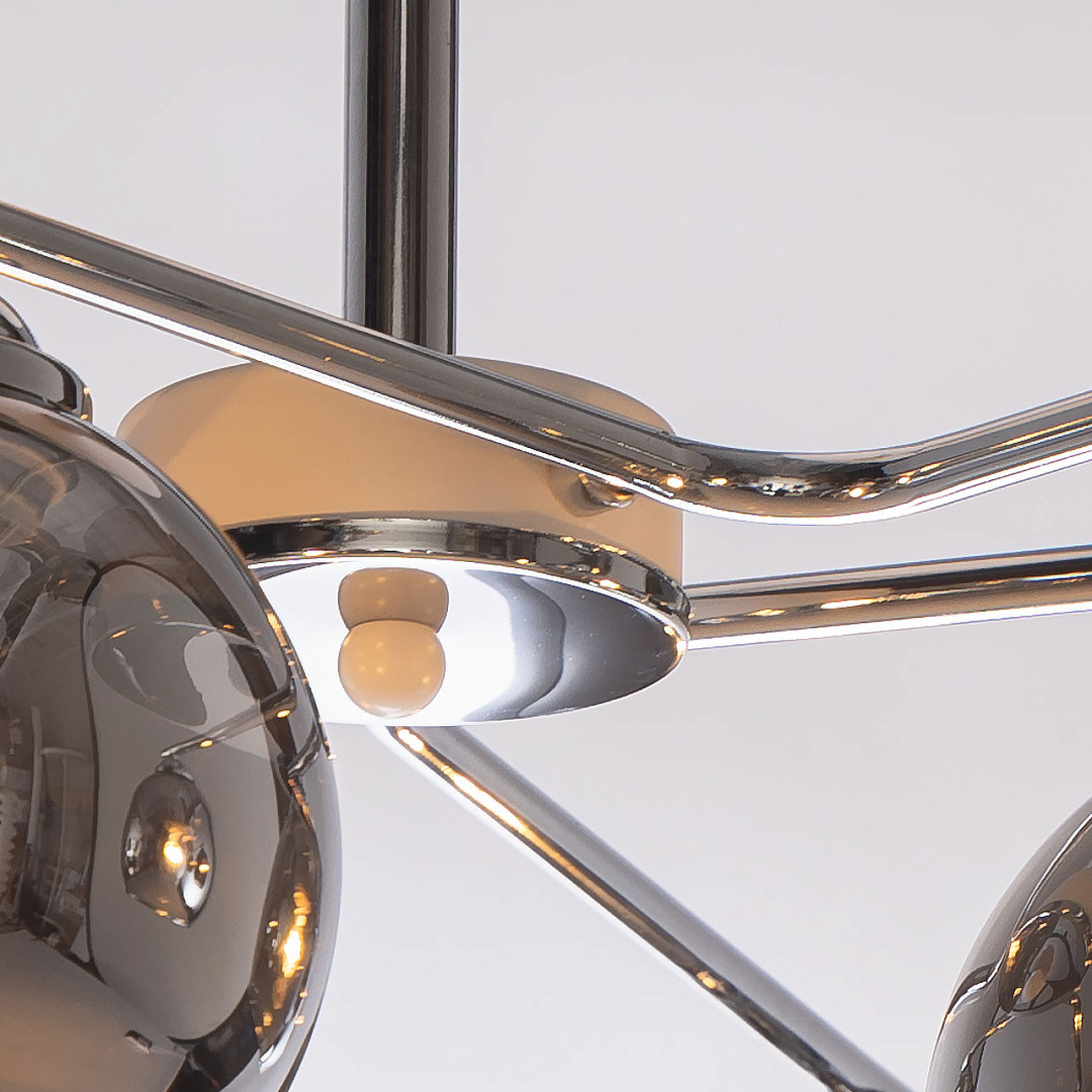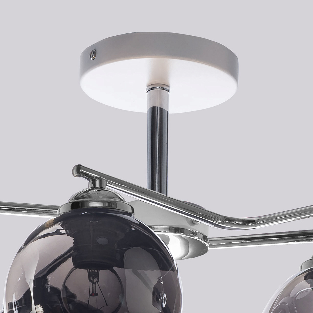 Трендовое сочетание матовой и глянцевой фактуры поверхности основания, белого цвета и цвета хрома.Стеклянные плафоны дымчатого цвета создают комфортное освещение.Компактный размер потолочной люстры сохраняет пространство комнаты и прекрасно подходит для стандартных потолков городских квартир.Заменяемые источники света удобны в эксплуатации.