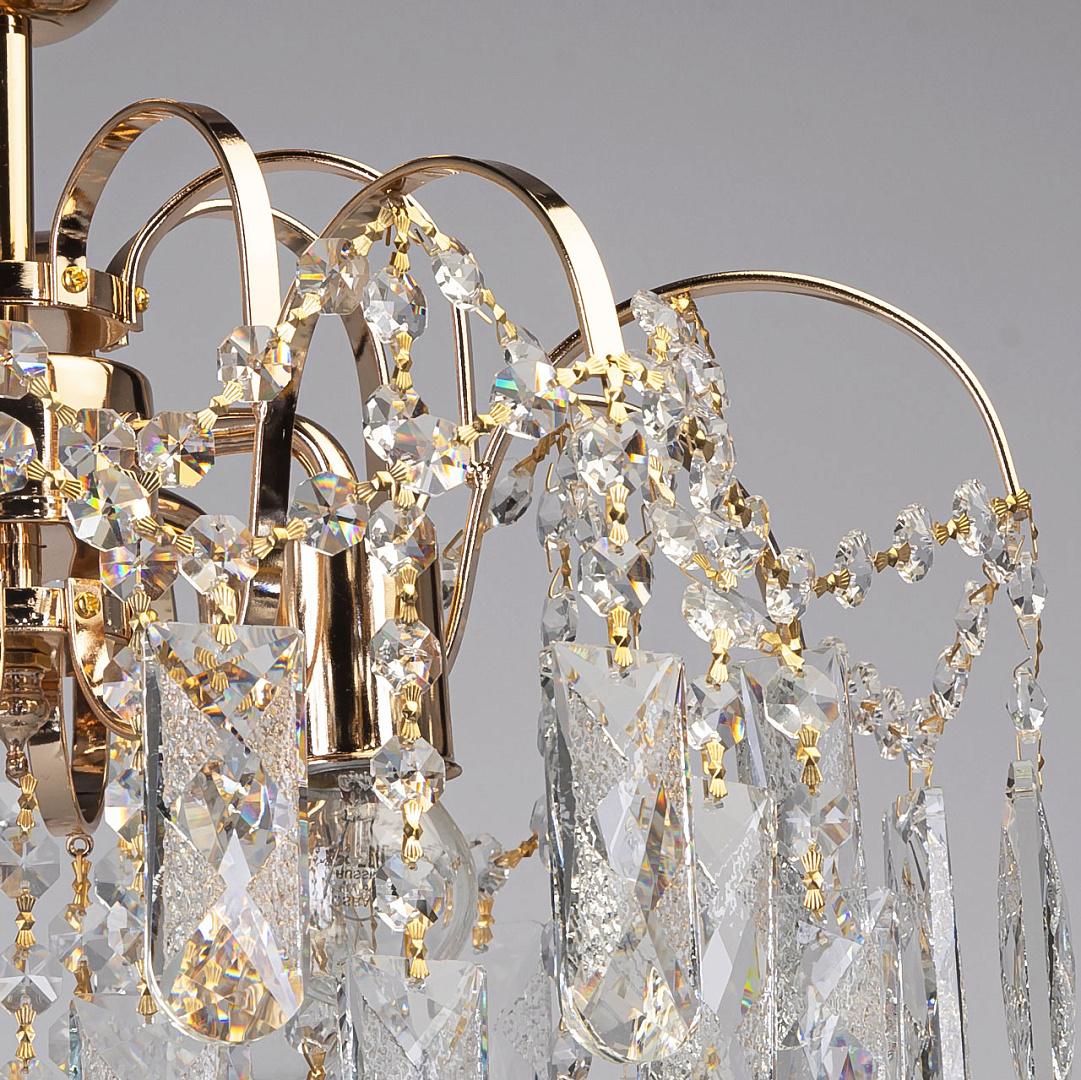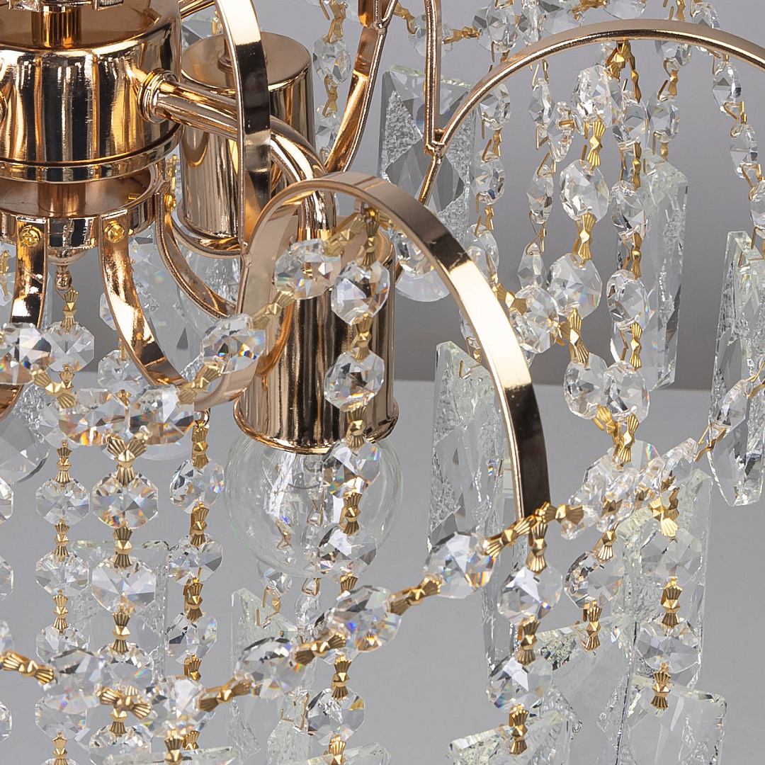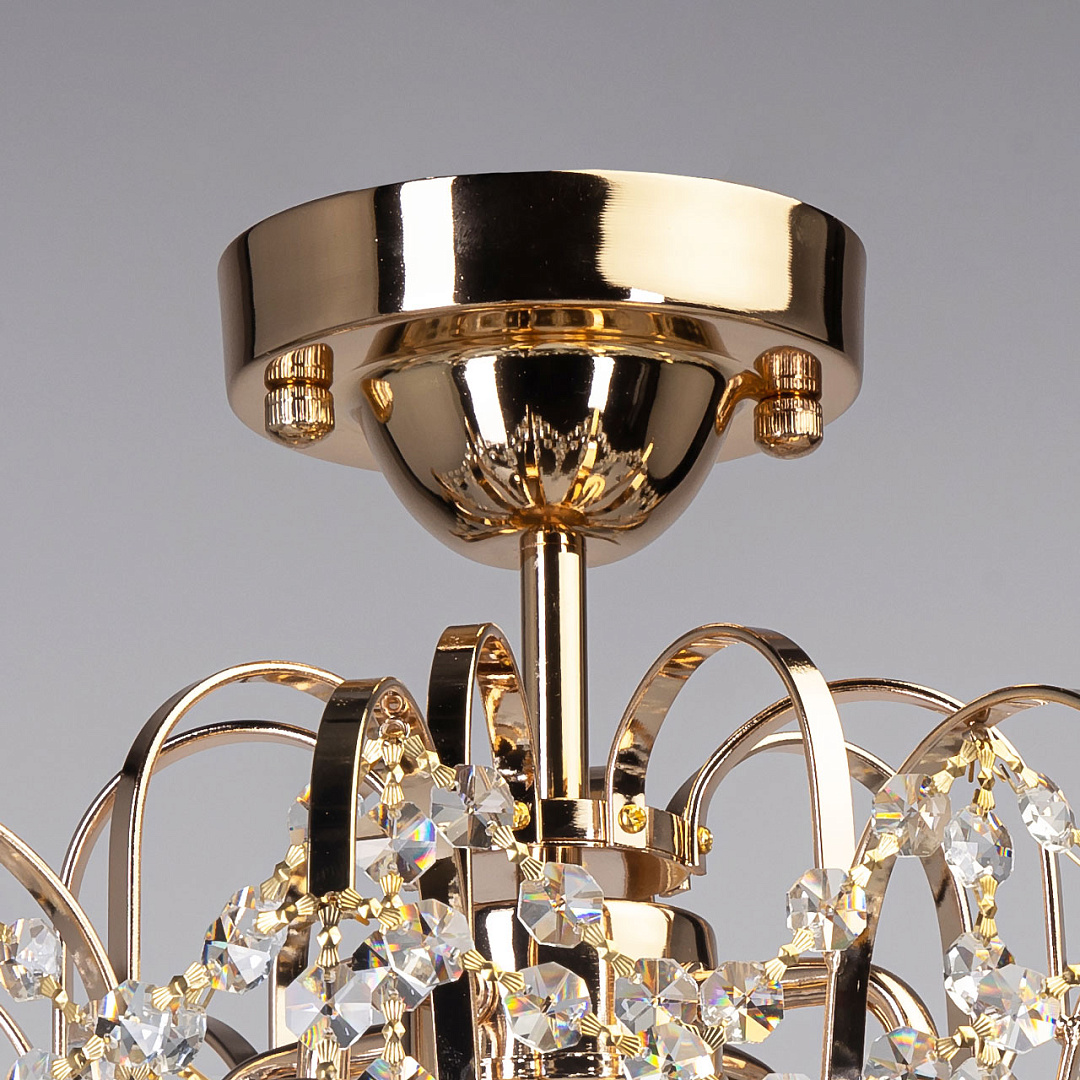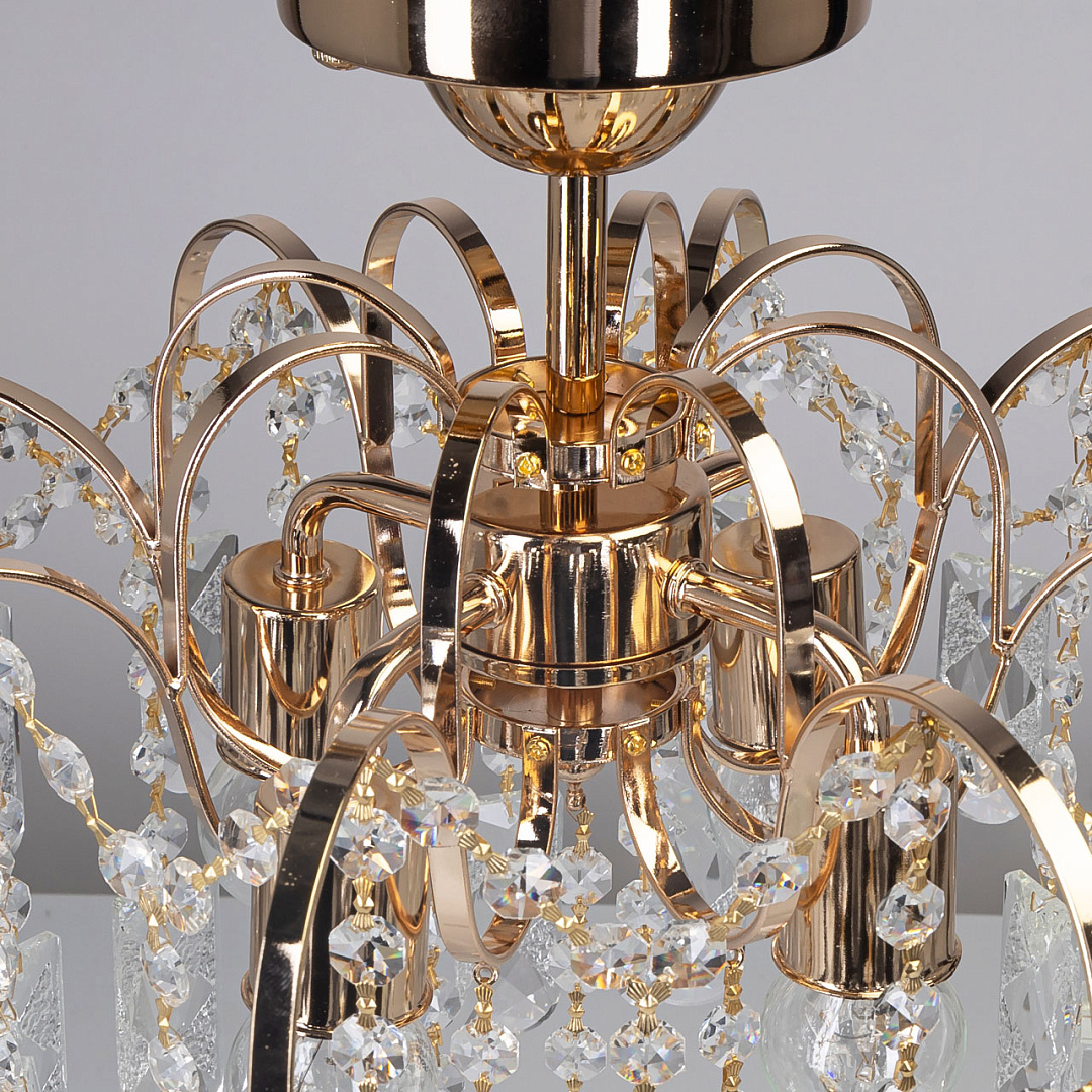 Актуальный цвет золота подойдет как в классический, так и в современный интерьер.Прозрачный хрусталь создает красивую игру света.Компактный размер потолочной люстры позволяет сохранить пространство комнаты при стандартном потолке.Заменяемые источники света удобны в эксплуатации.