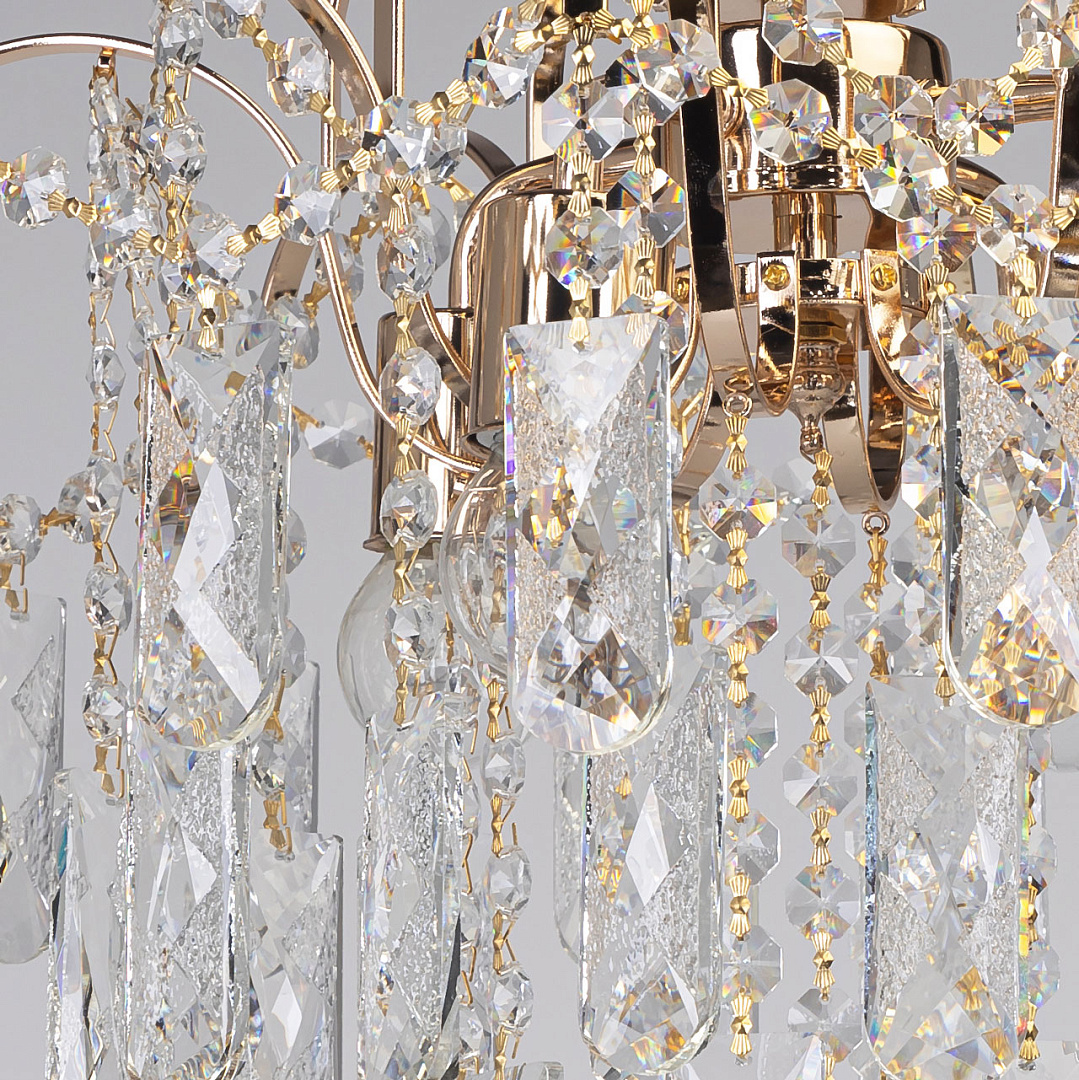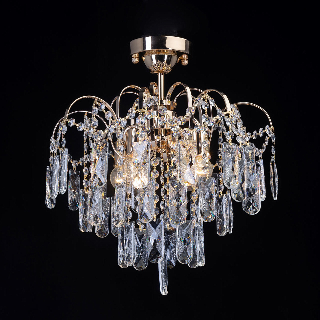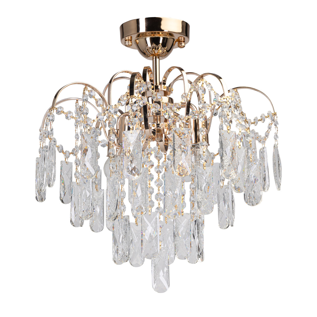 Актуальный цвет золота подойдет как в классический, так и в современный интерьер.Прозрачный хрусталь создает красивую игру света.Компактный размер потолочной люстры позволяет сохранить пространство комнаты при стандартном потолке.Заменяемые источники света удобны в эксплуатации.