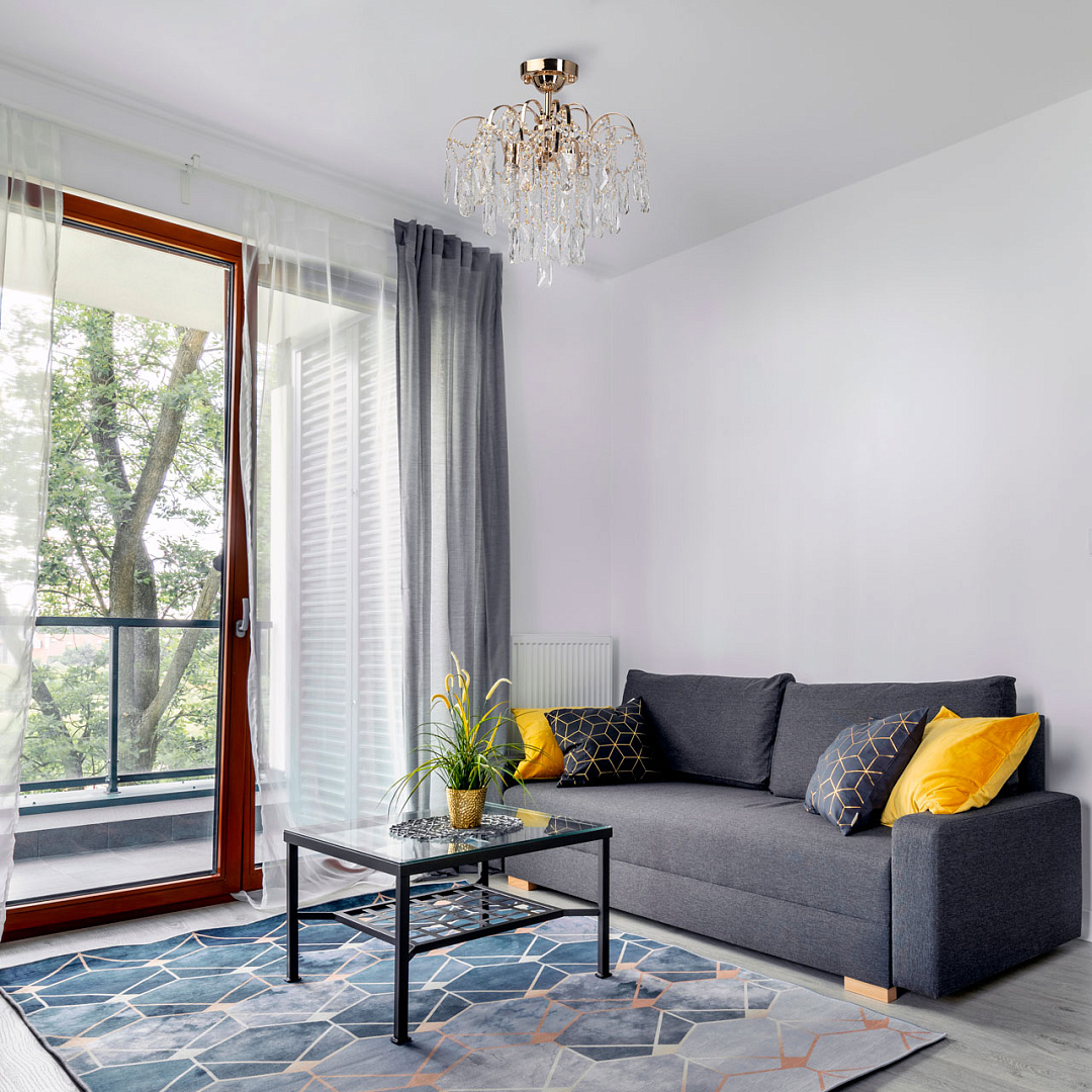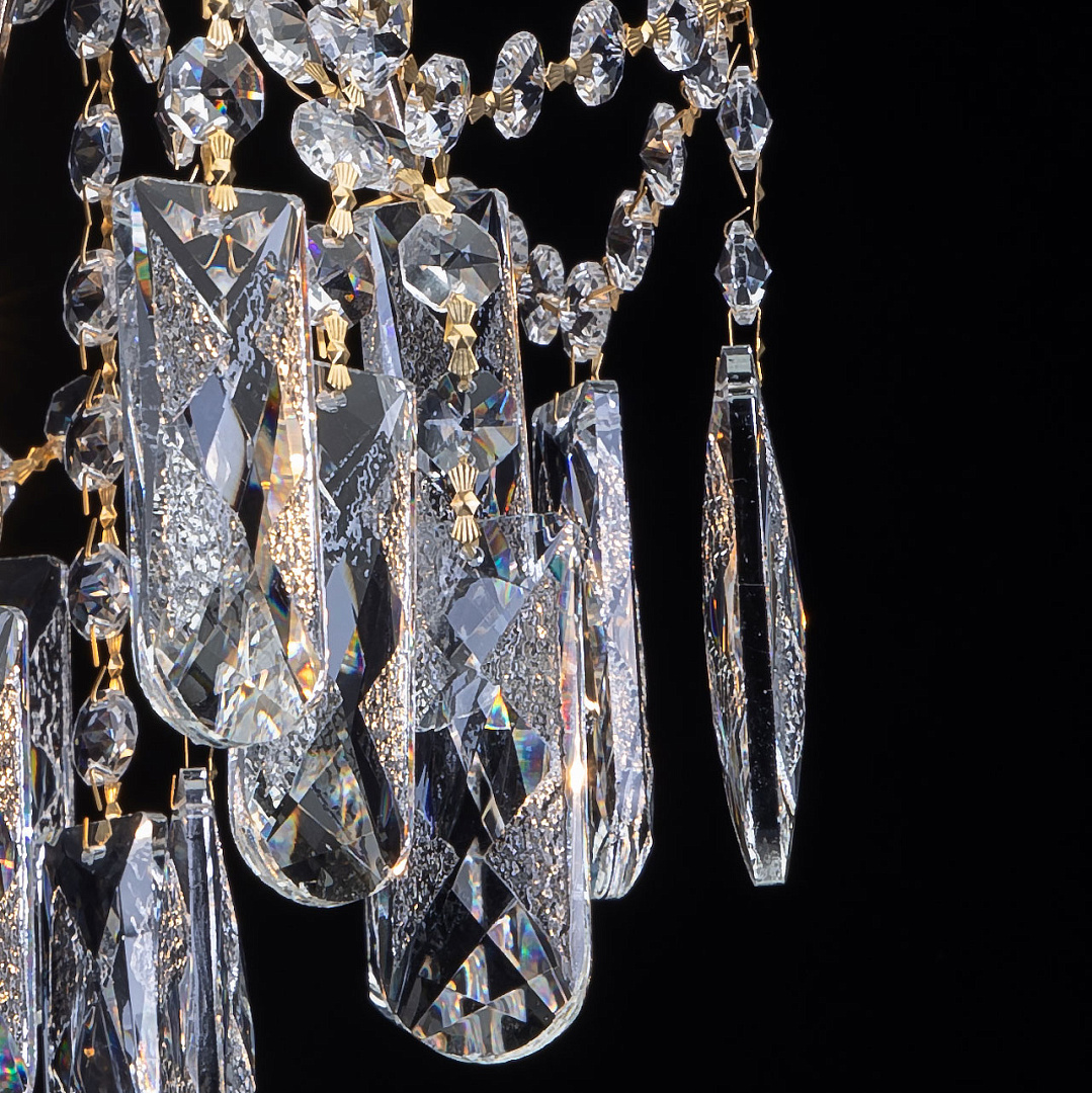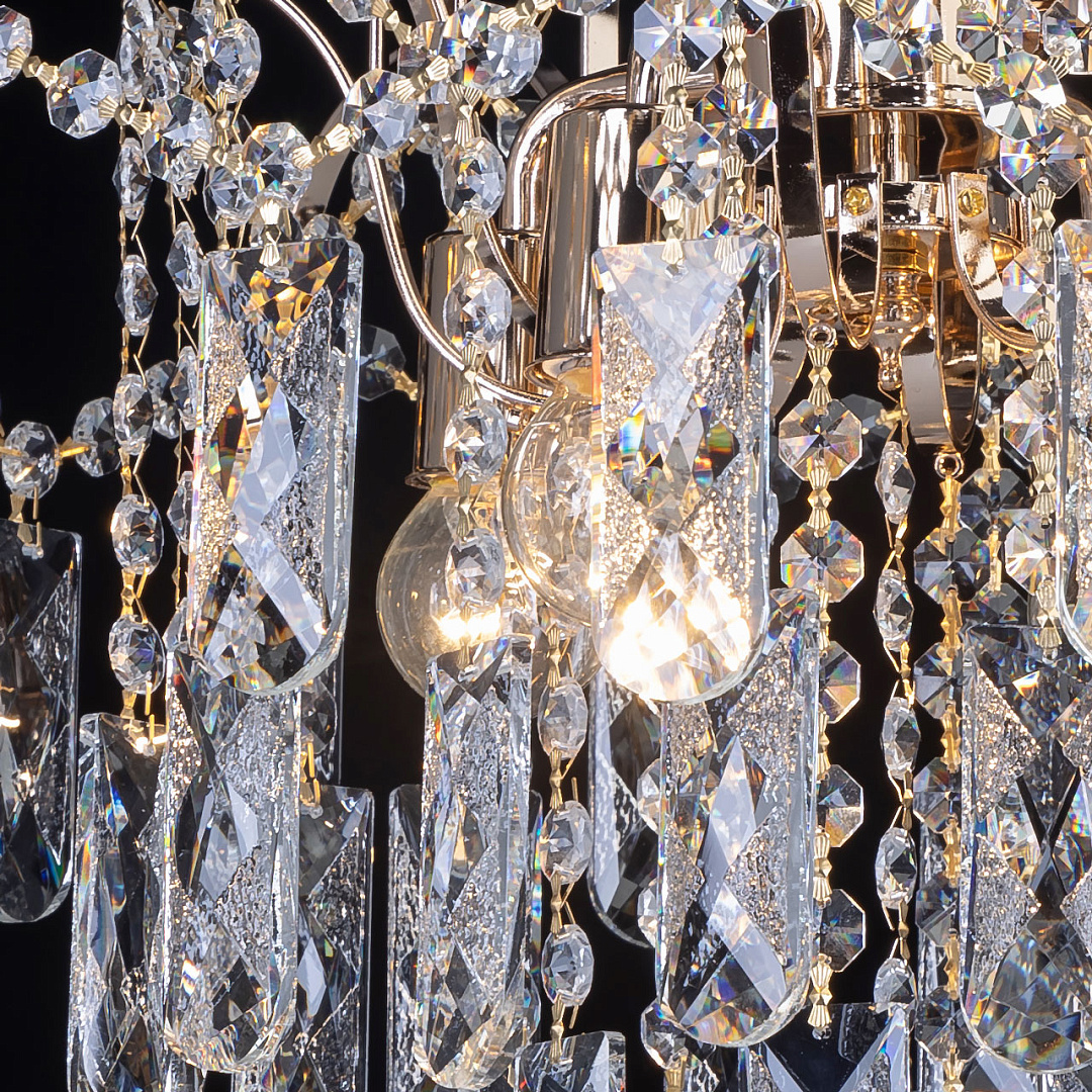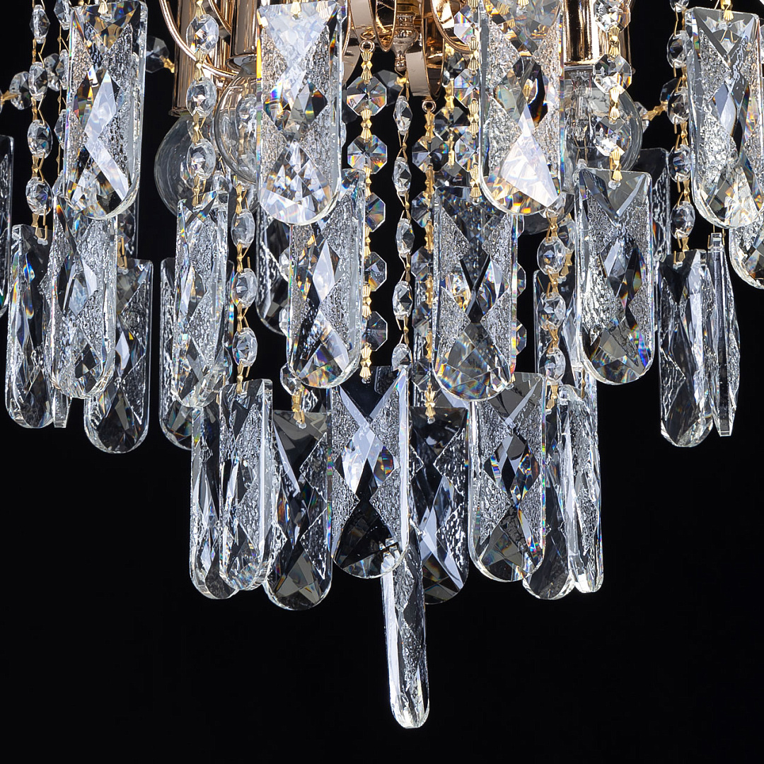 Актуальный цвет золота подойдет как в классический, так и в современный интерьер.Прозрачный хрусталь создает красивую игру света.Компактный размер потолочной люстры позволяет сохранить пространство комнаты при стандартном потолке.Заменяемые источники света удобны в эксплуатации.