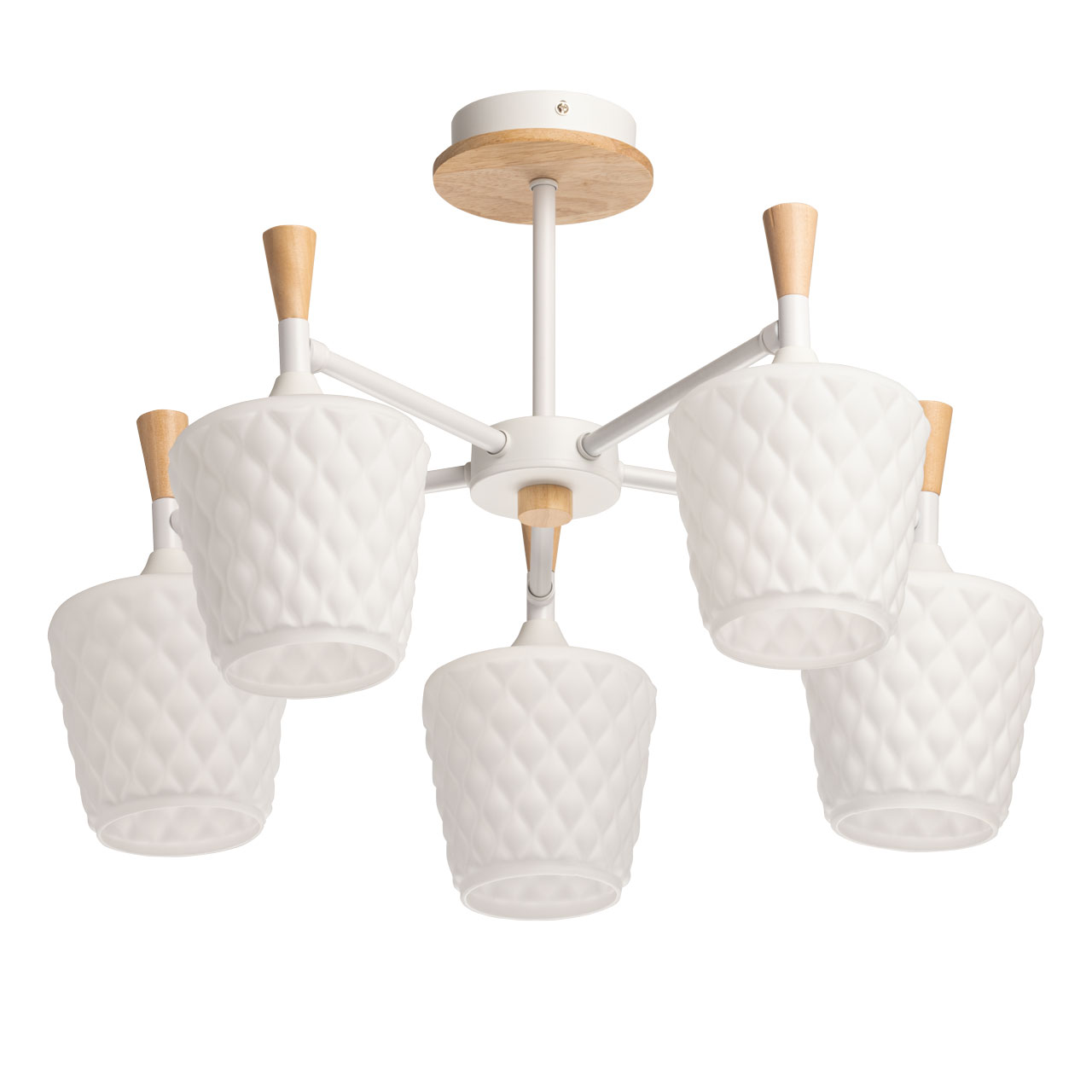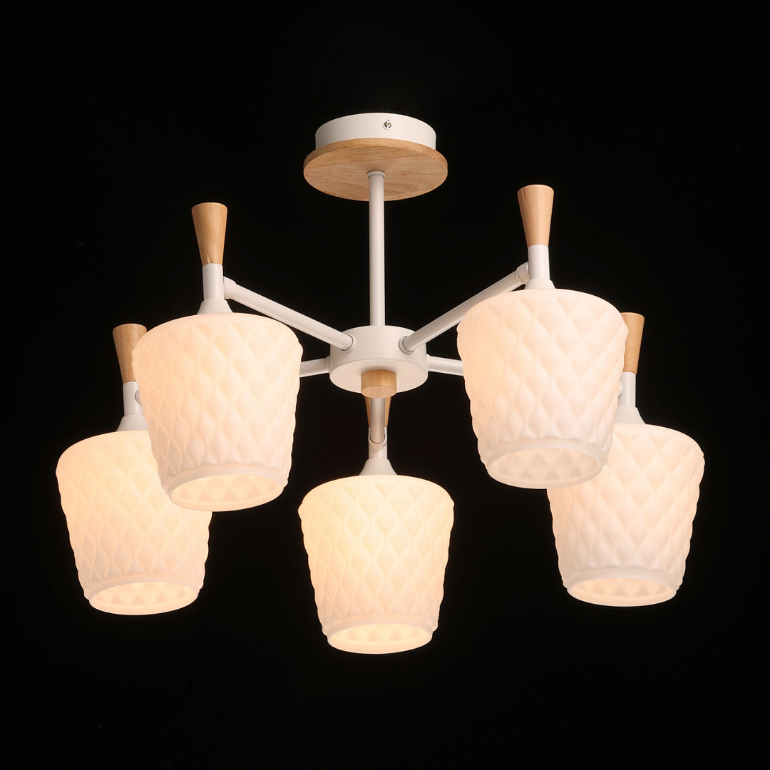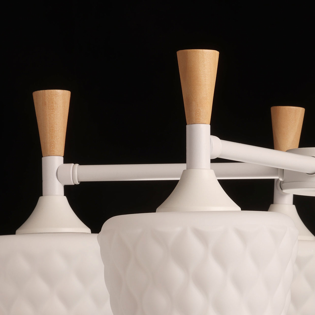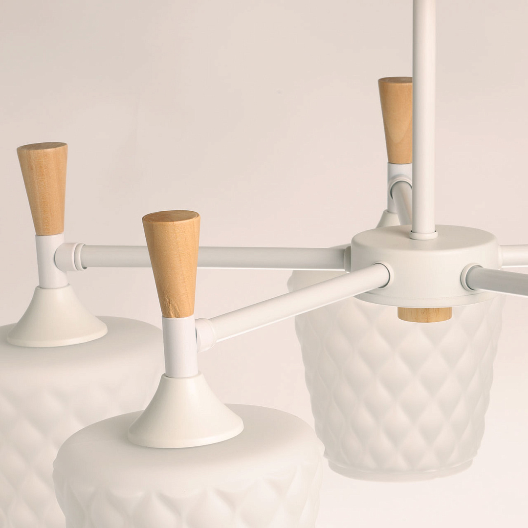 Универсальный белый цвет потолочной люстры подходит к любому интерьеру. Оригинальный орнамент белых плафонов придает лаконичной люстре декоративности. Элементы из натурального дерева в тренде природности. Заменяемые источники света удобны в эксплуатации. Компактный размер потолочной люстры сохранит пространство комнаты при стандартных потолках.