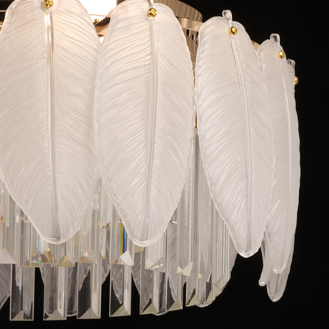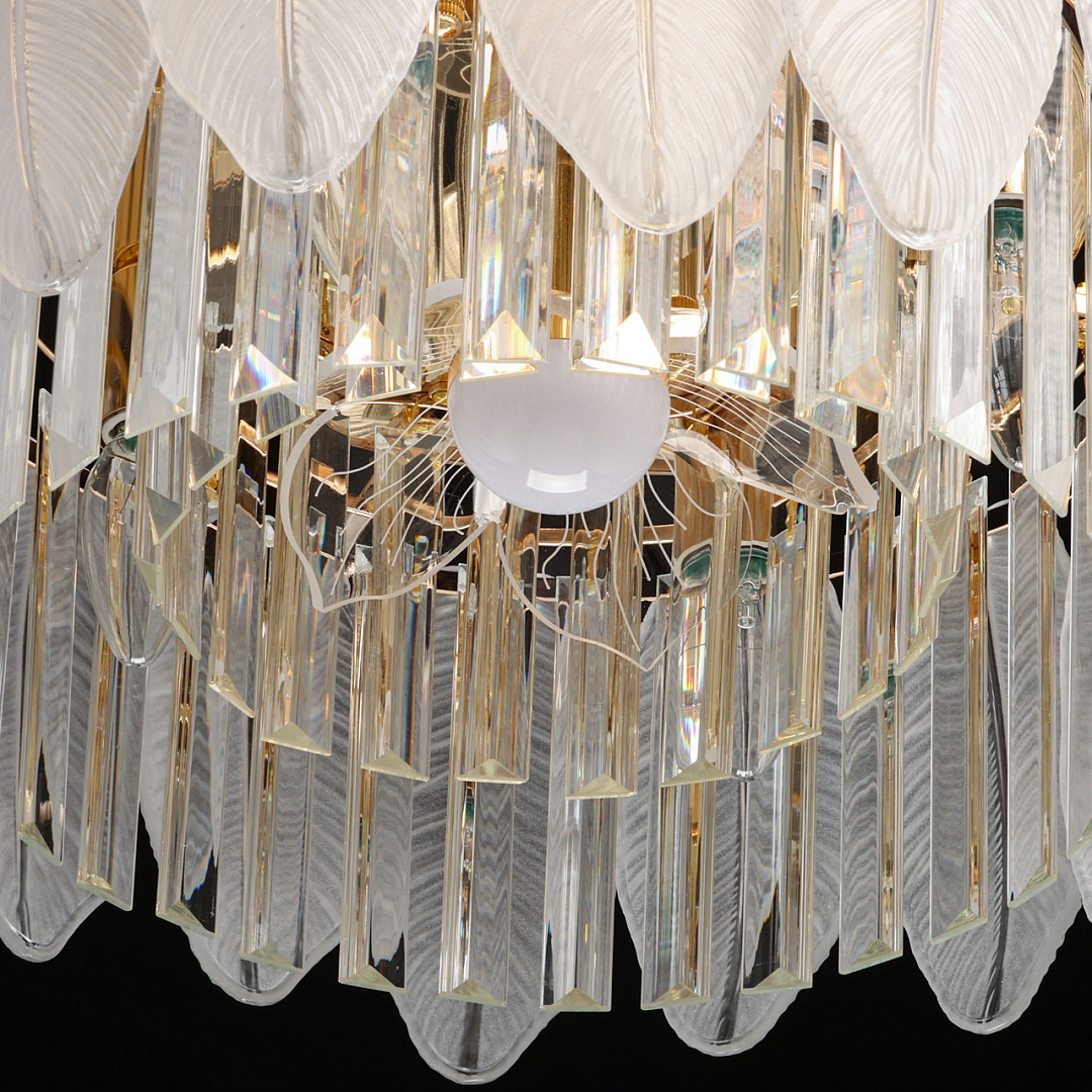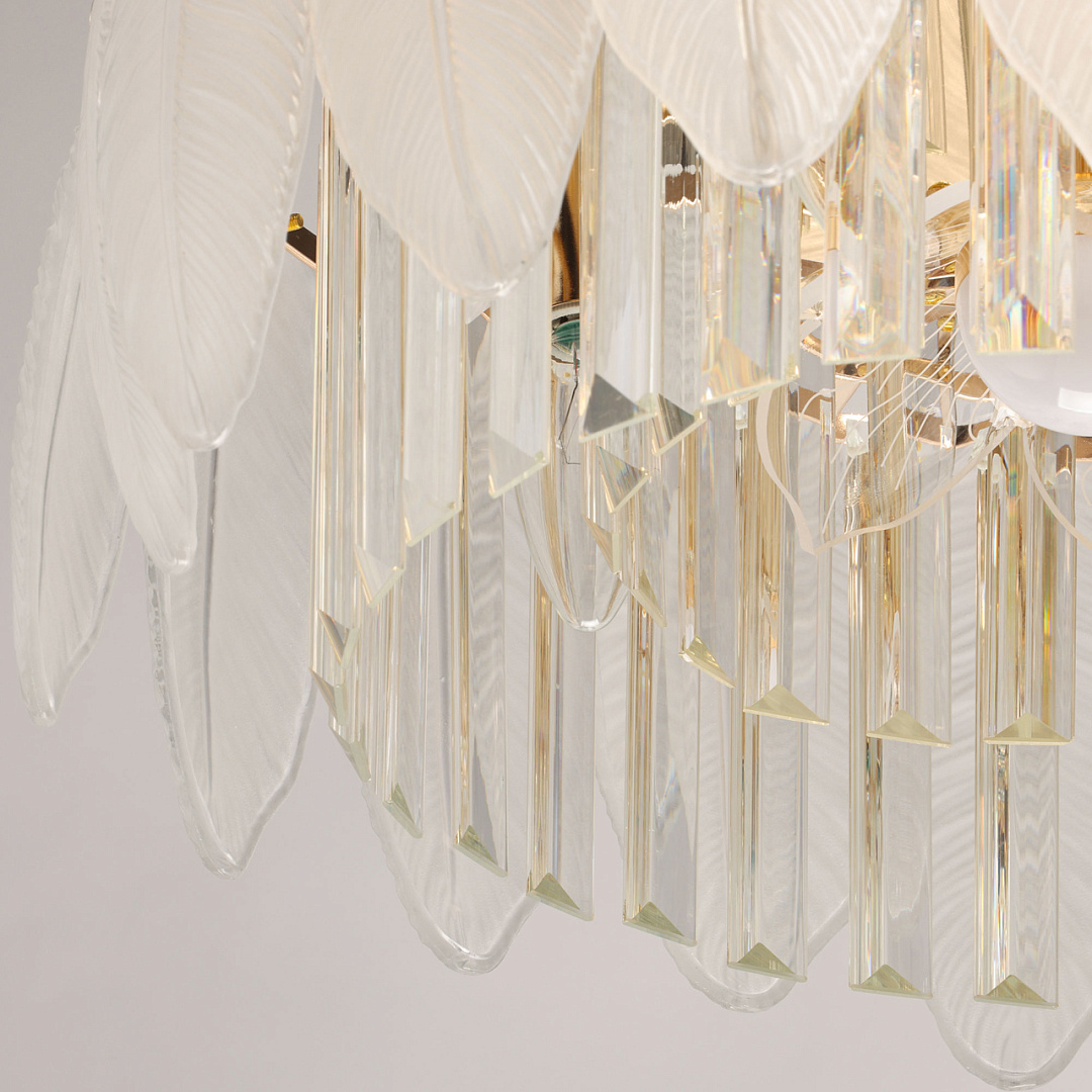 Благородный цвет золота сохраняет свою актуальность.Стеклянные листья тонкой работы соответствуют тренду природности.Матированный декор из стекла создает мягкий и уютный свет.Декор из прозрачного хрусталя красиво преломляет свет.Цветок из прозрачного акрила, окружающий источник света, придает люстре нежности и воздушности.Светодиоды экономичны и безопасны. Компактный размер светильника сохраняет пространство комнаты и позволяет его монтировать при стандартных потолках.