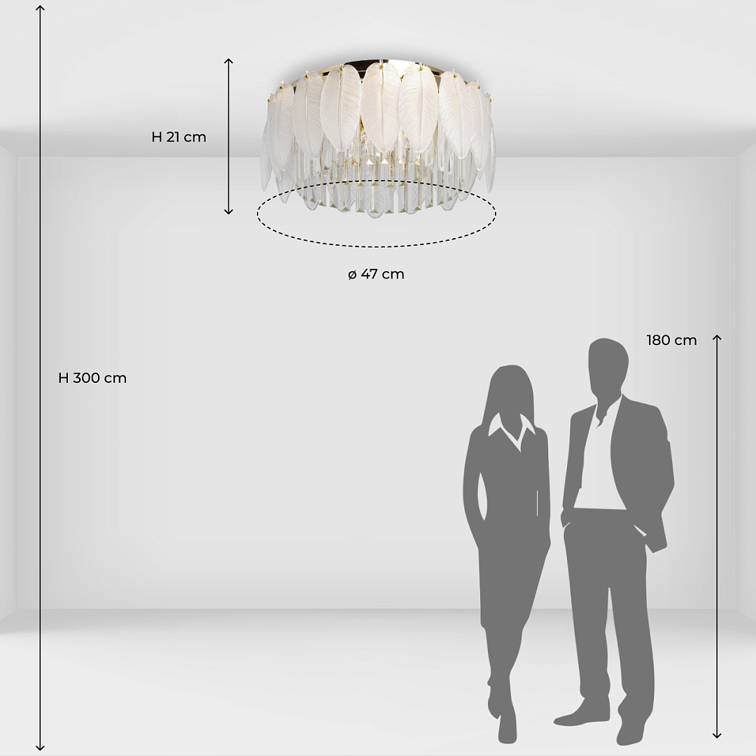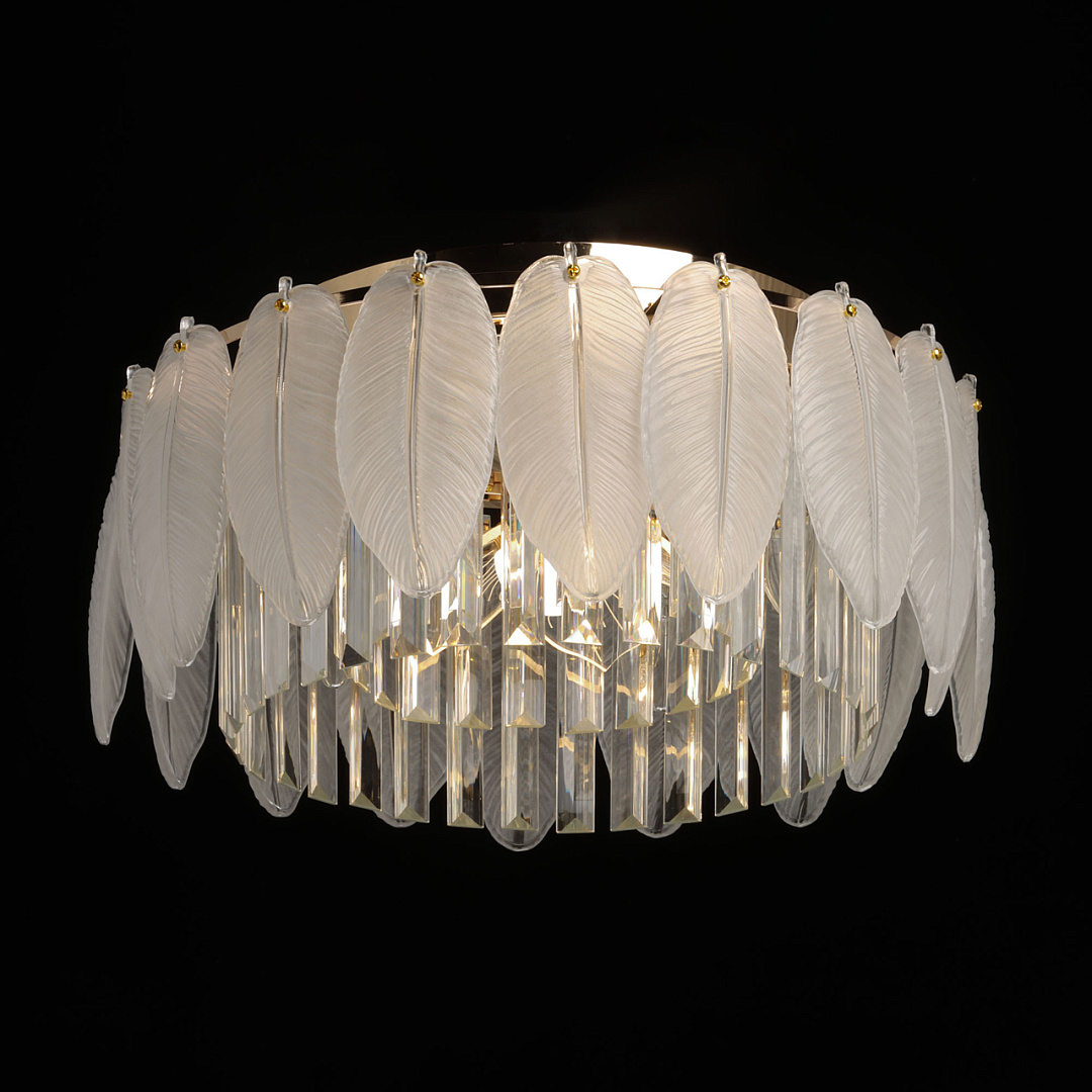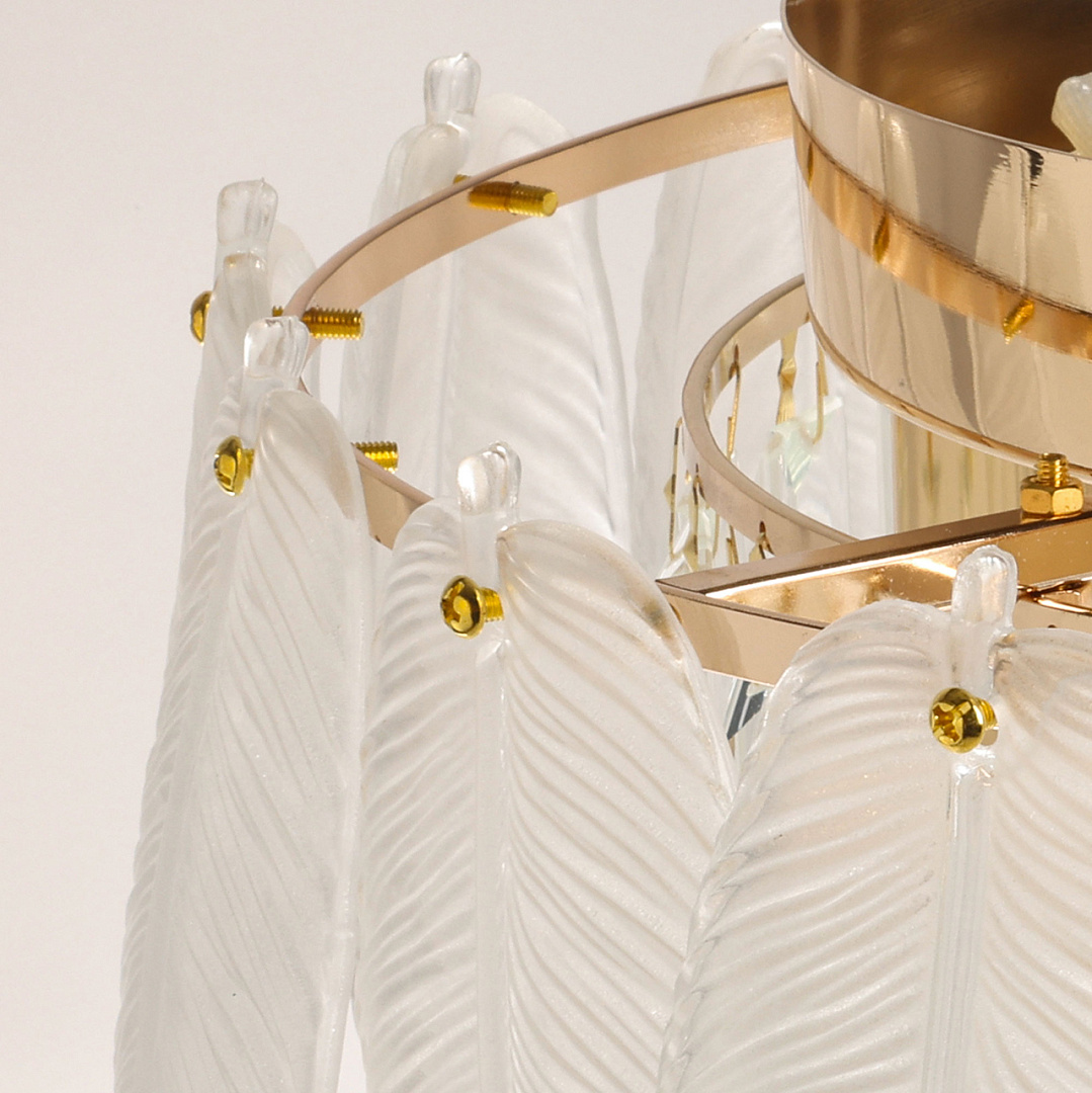 Благородный цвет золота сохраняет свою актуальность.Стеклянные листья тонкой работы соответствуют тренду природности.Матированный декор из стекла создает мягкий и уютный свет.Декор из прозрачного хрусталя красиво преломляет свет.Цветок из прозрачного акрила, окружающий источник света, придает люстре нежности и воздушности.Светодиоды экономичны и безопасны. Компактный размер светильника сохраняет пространство комнаты и позволяет его монтировать при стандартных потолках.