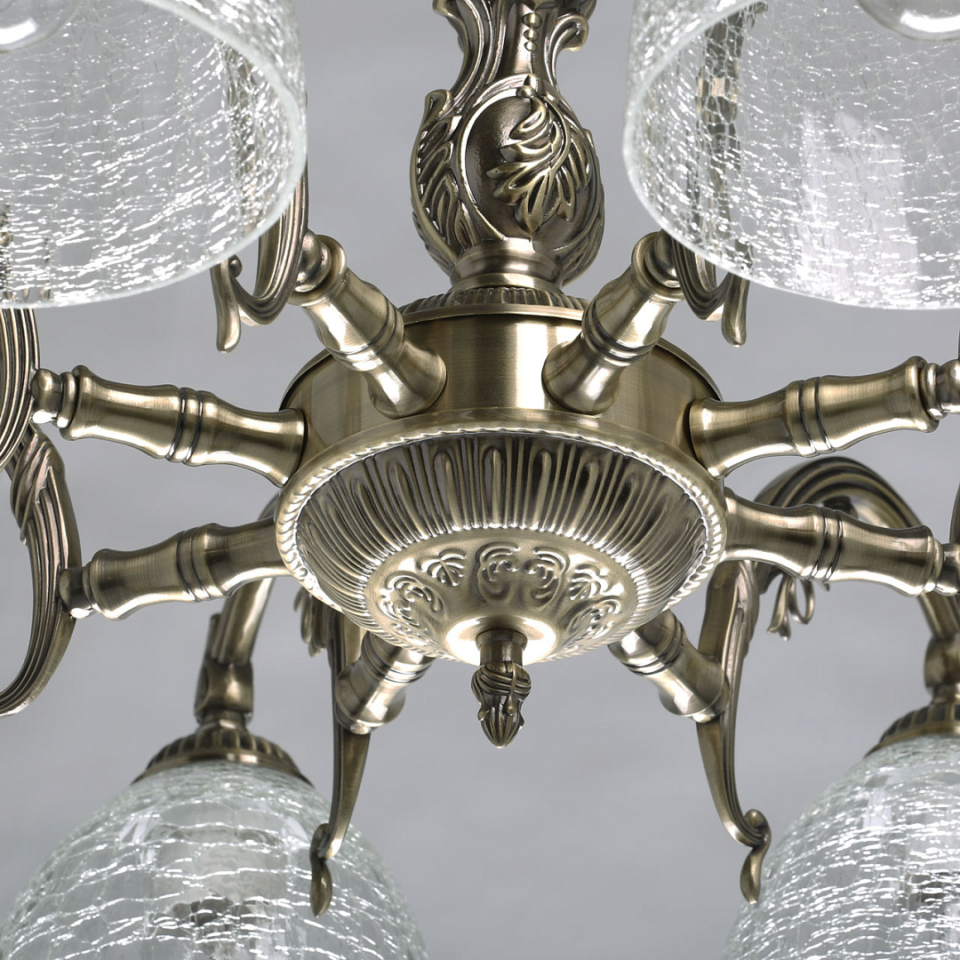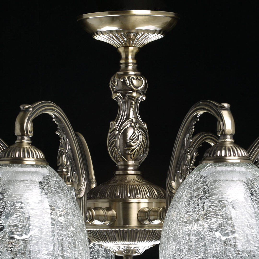 Актуальный цвет античной бронзы.Классический дизайн в дворцовом стиле.Стеклянные кракелированные плафоны вниз создают красивый свет Компактные размеры высоты светильника подойдут для стандартных потолков.Заменяемые источники света удобны в эксплуатации.