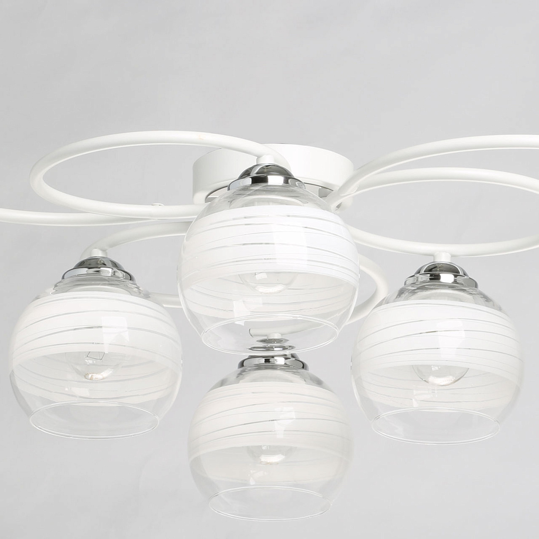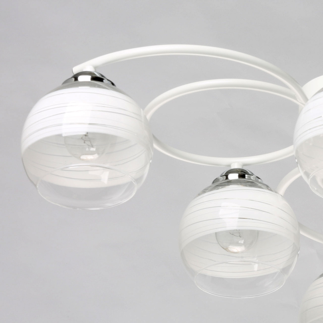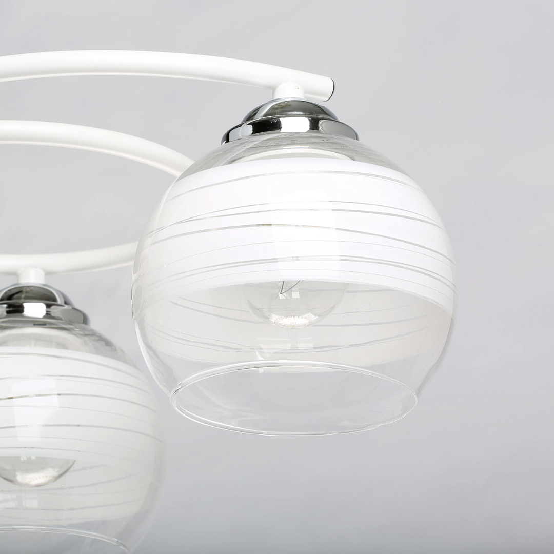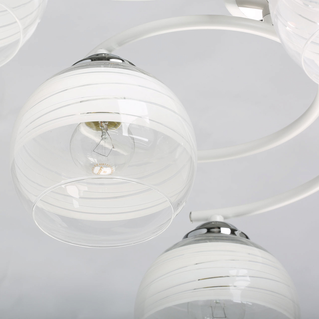 Необычная воздушная конструкция светильника как элемент дизайна.Актуальная комбинация металлов основания белого цвета и хрома. Стеклянные плафоны вниз хорошо освещают пространство комнаты.Большой диаметр обеспечивает высокие параметры освещенности.