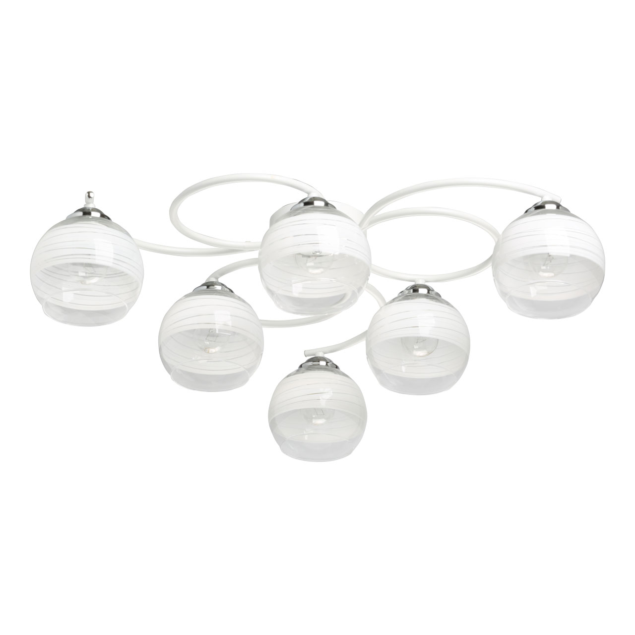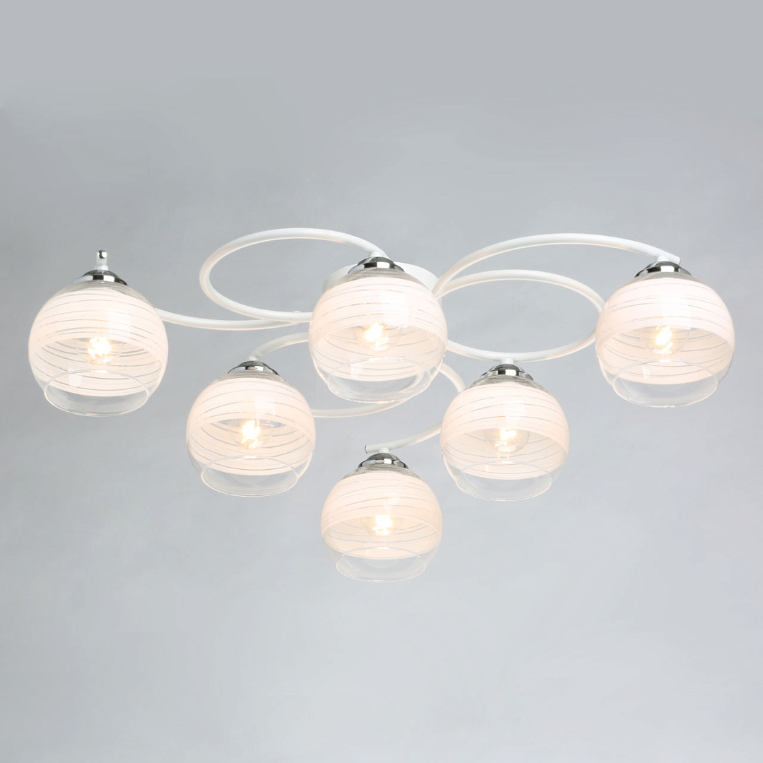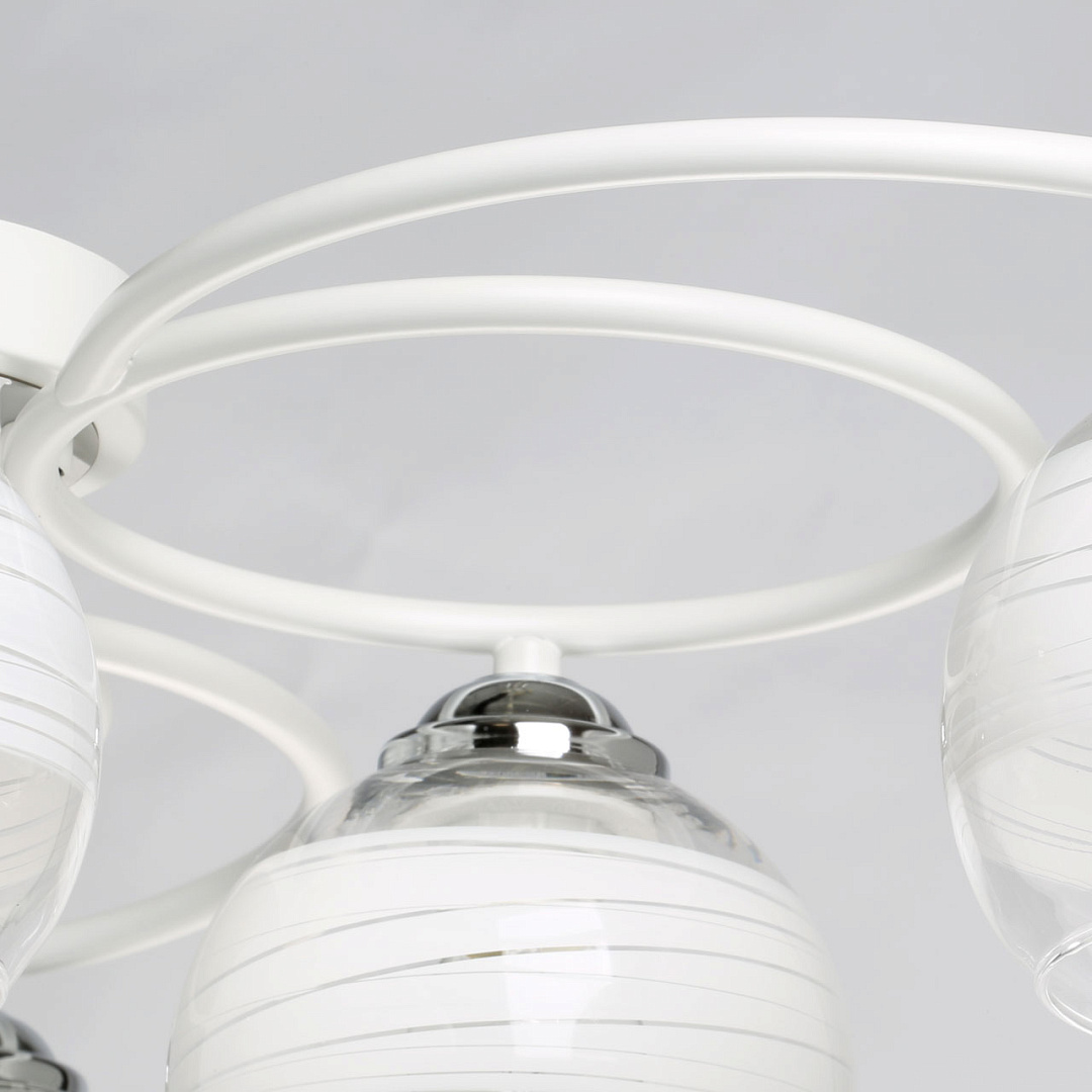 Необычная воздушная конструкция светильника как элемент дизайна.Актуальная комбинация металлов основания белого цвета и хрома. Стеклянные плафоны вниз хорошо освещают пространство комнаты.Большой диаметр обеспечивает высокие параметры освещенности.