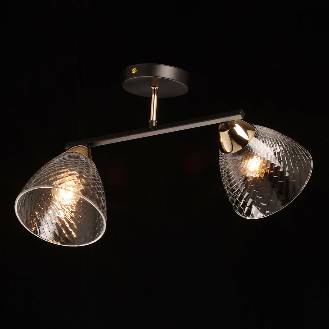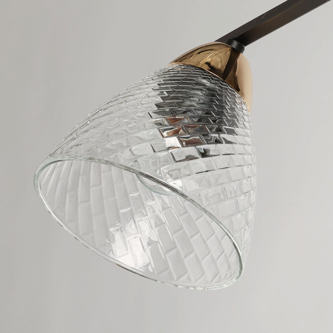 Контрастное сочетание глубокого черного цвета и цвета бронзы добавляют люстре элегантности и стиля. Прямые линии основания люстры подчеркивают современность дизайну. Плафоны из фактурного стекла соответствуют тренду геометричности и создают красивую игру света. Свет, направленный в разные стороны позволяет ярко осветить пространство. Заменяемые источники света удобны в эксплуатации.
