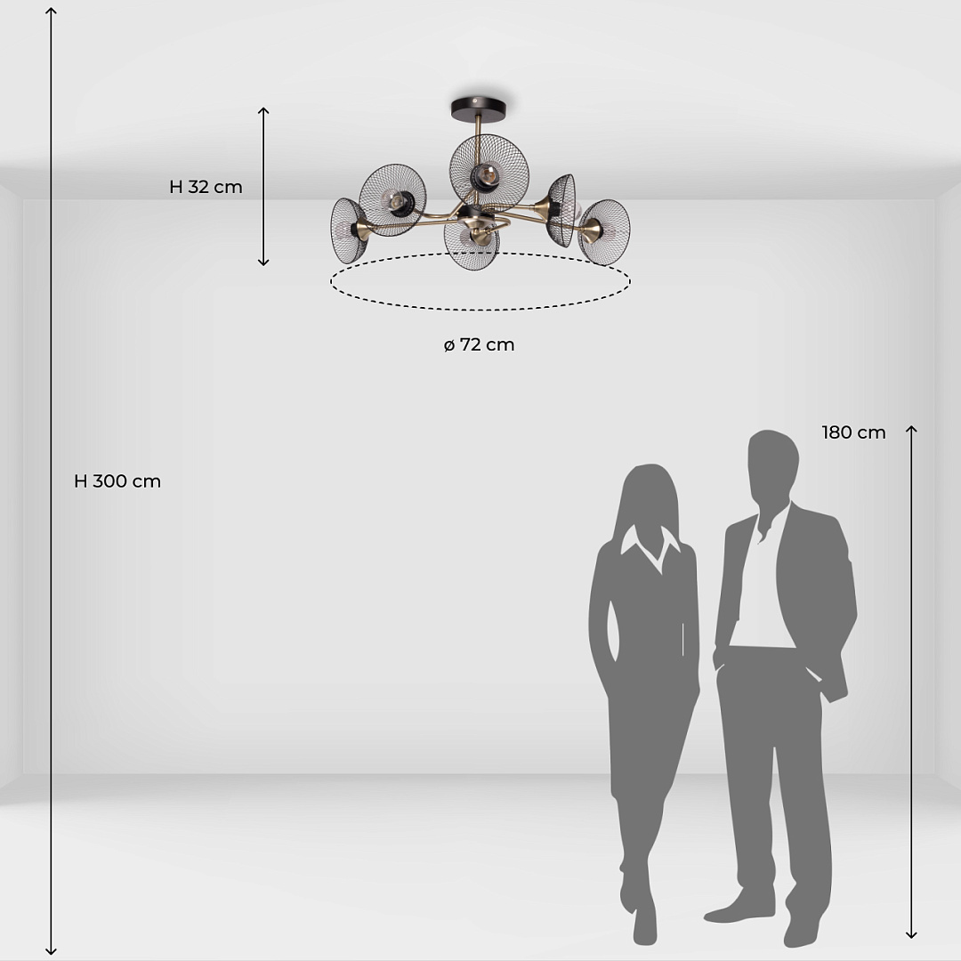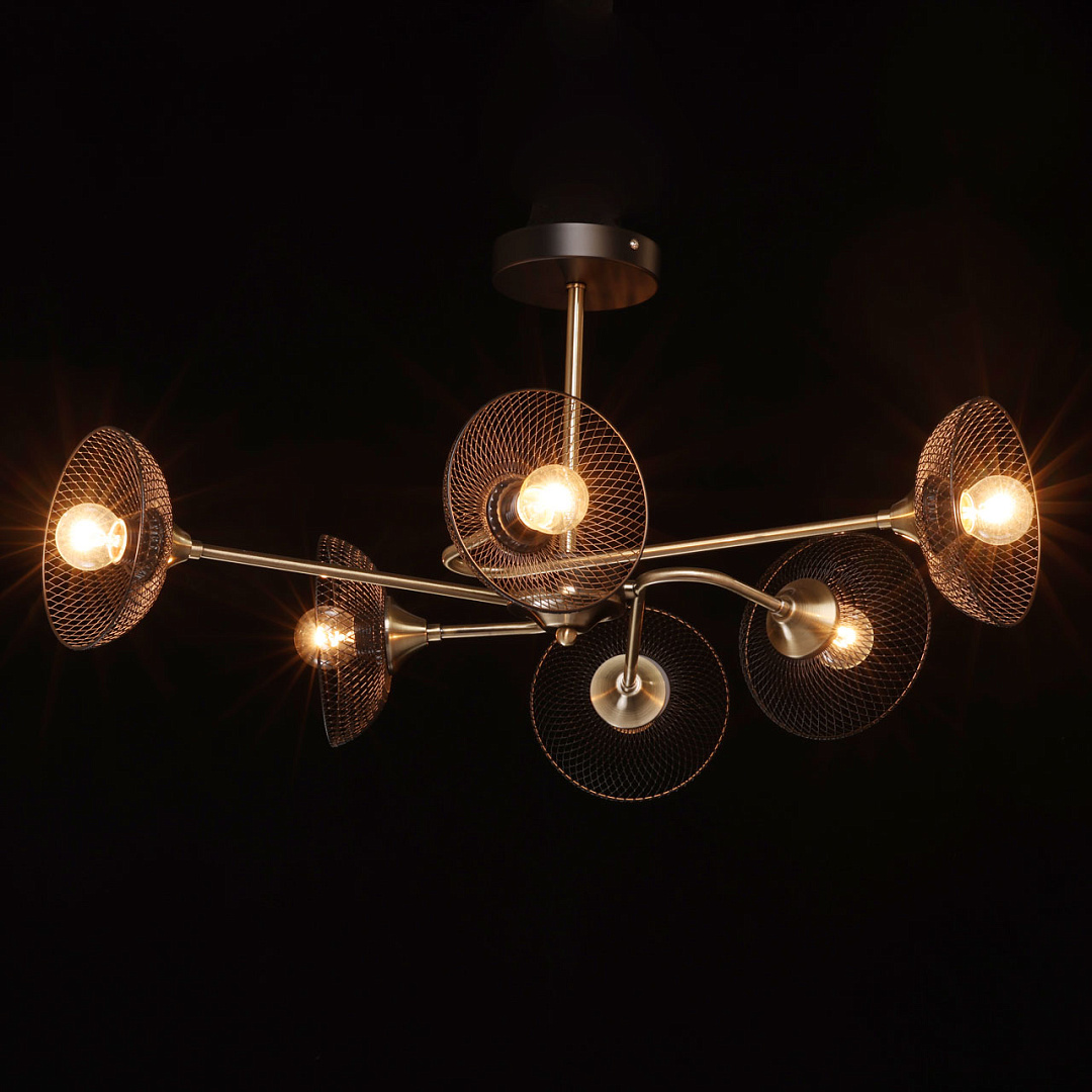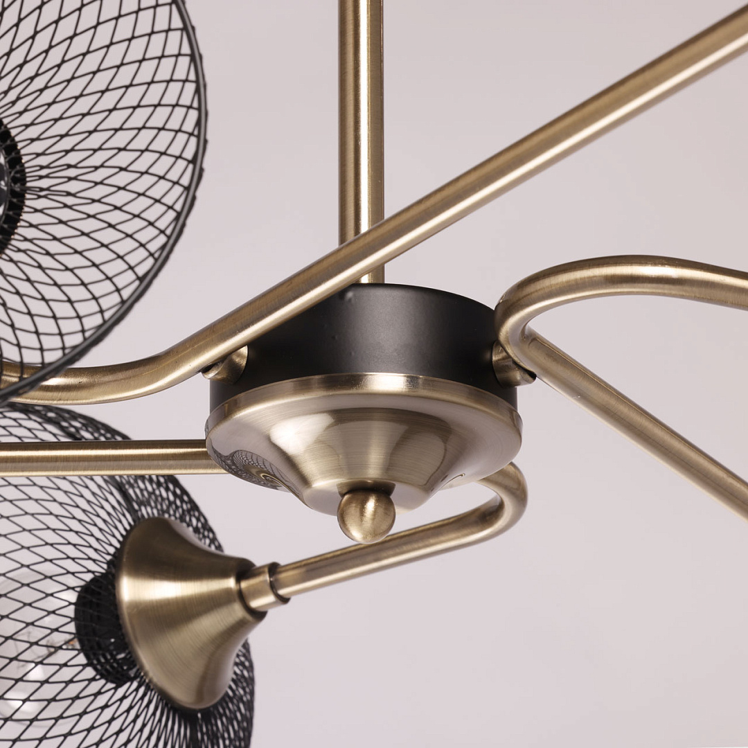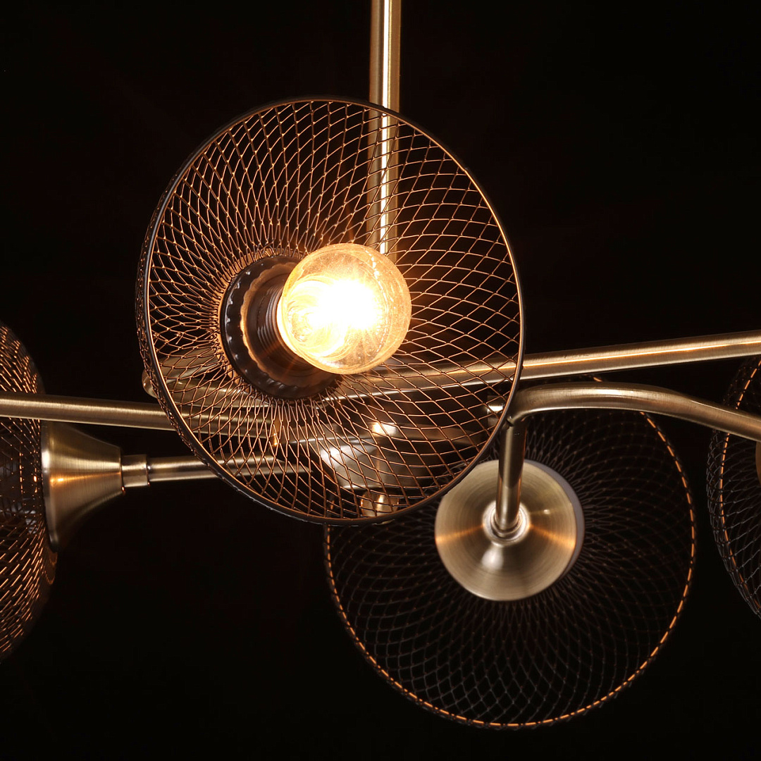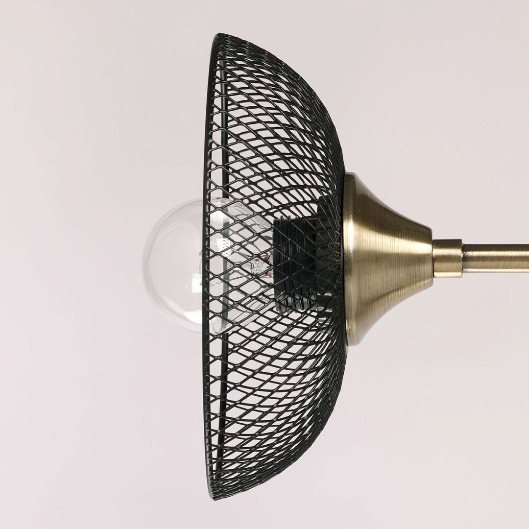 Гармоничное сочетание черного цвета и цвета бронзы основания придает люстре сдержанный и элегантный вид. Добавление цвета бронзы вносит теплоту и шарм в стиль интерьера. Металлические плафоны в форме сетки придают люстре оригинальность и уникальность, делая ее привлекательным акцентом в помещении. Заменяемые источники света удобны в эксплуатации.