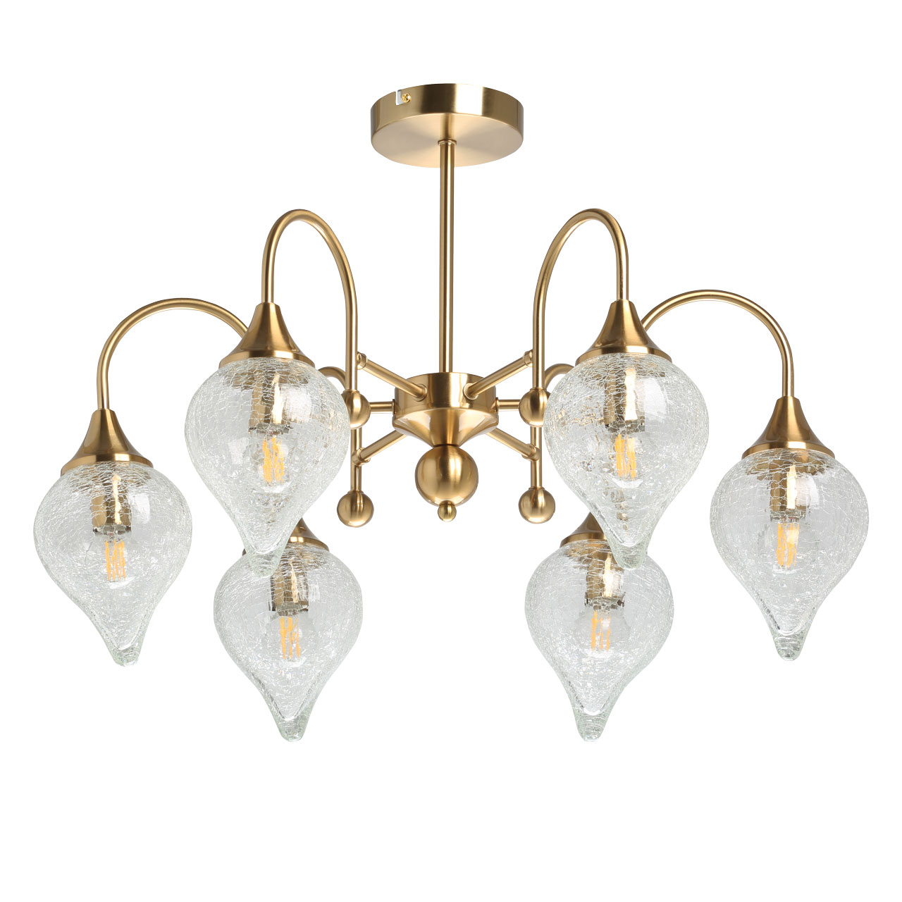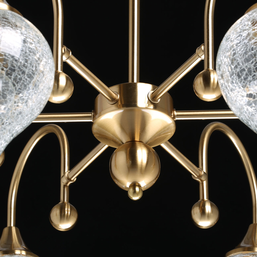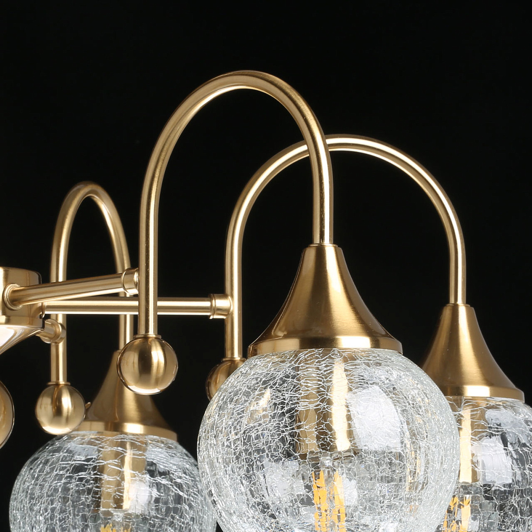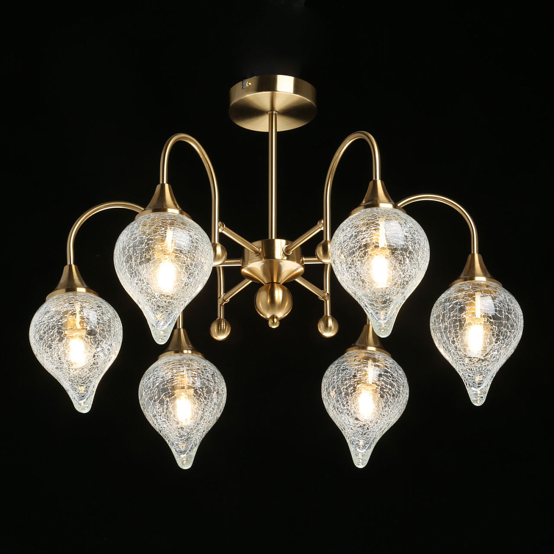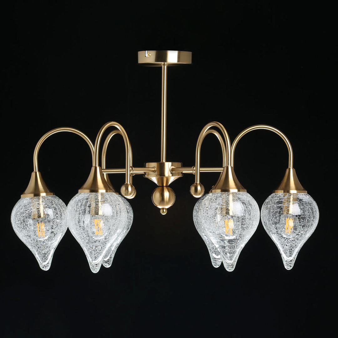 Актуальный цвет античной бронзы.Стеклянные плафоны оригинальной формы из кракелированного стекла создают красивую игру света.Компактный размер светильника прекрасно подойдет к стандартным потолкам.Изящные рожки с декором.Заменяемые источники света удобны в эксплуатации.
