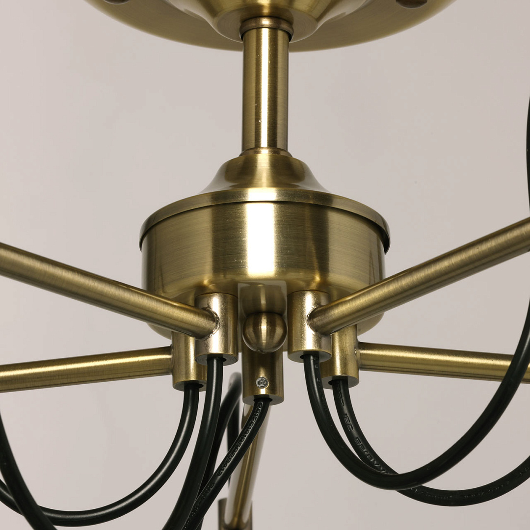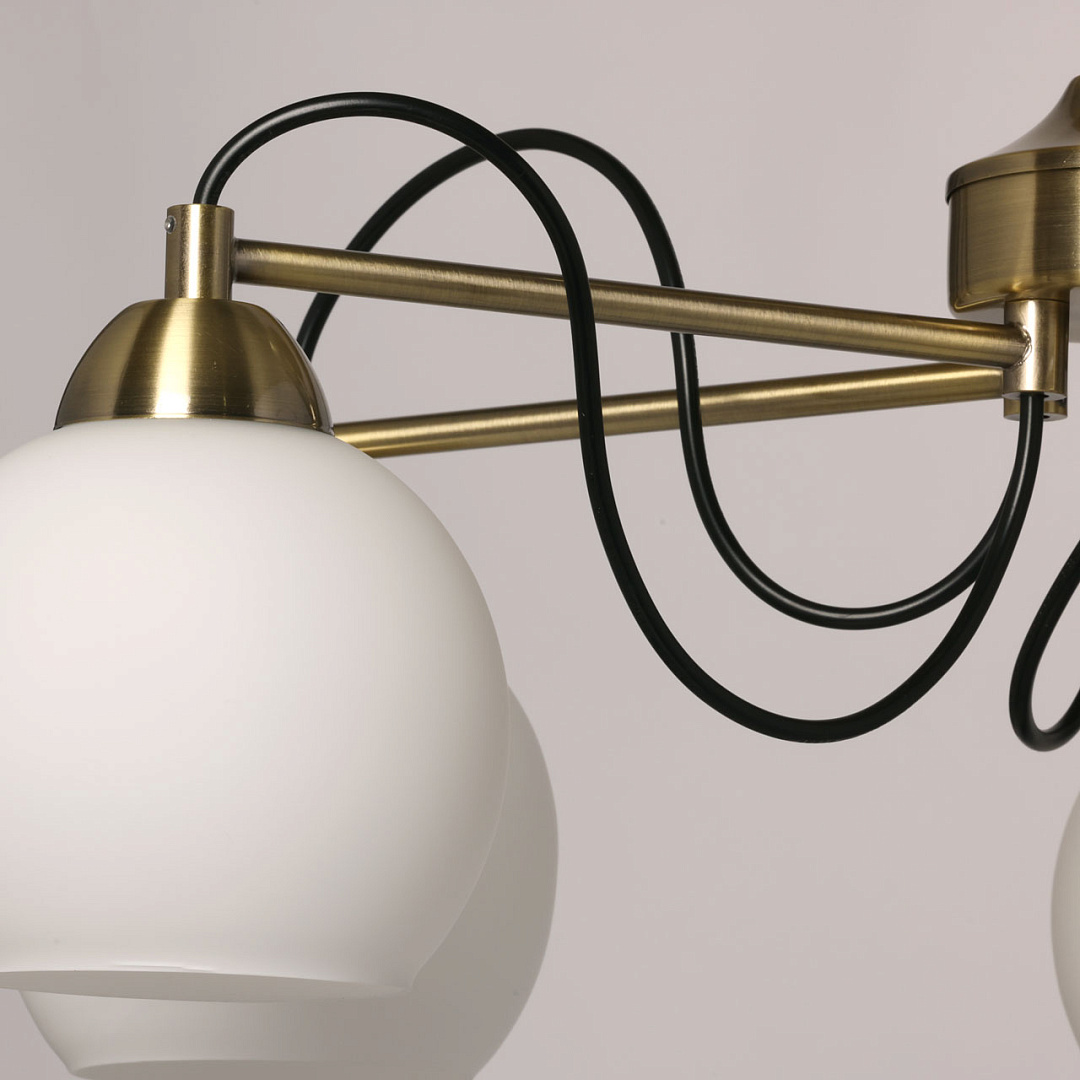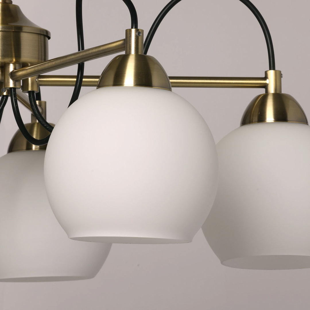 Благодаря сочетанию цвета античной бронзы и матового стекла люстра привнесет в интерьер атмосферу уюта. Современности и стиля светильнику придают контрастные черные наружные кабели. Свет, направленный вниз создает яркое зональное освещение. Заменяемые источники света удобны в эксплуатации.