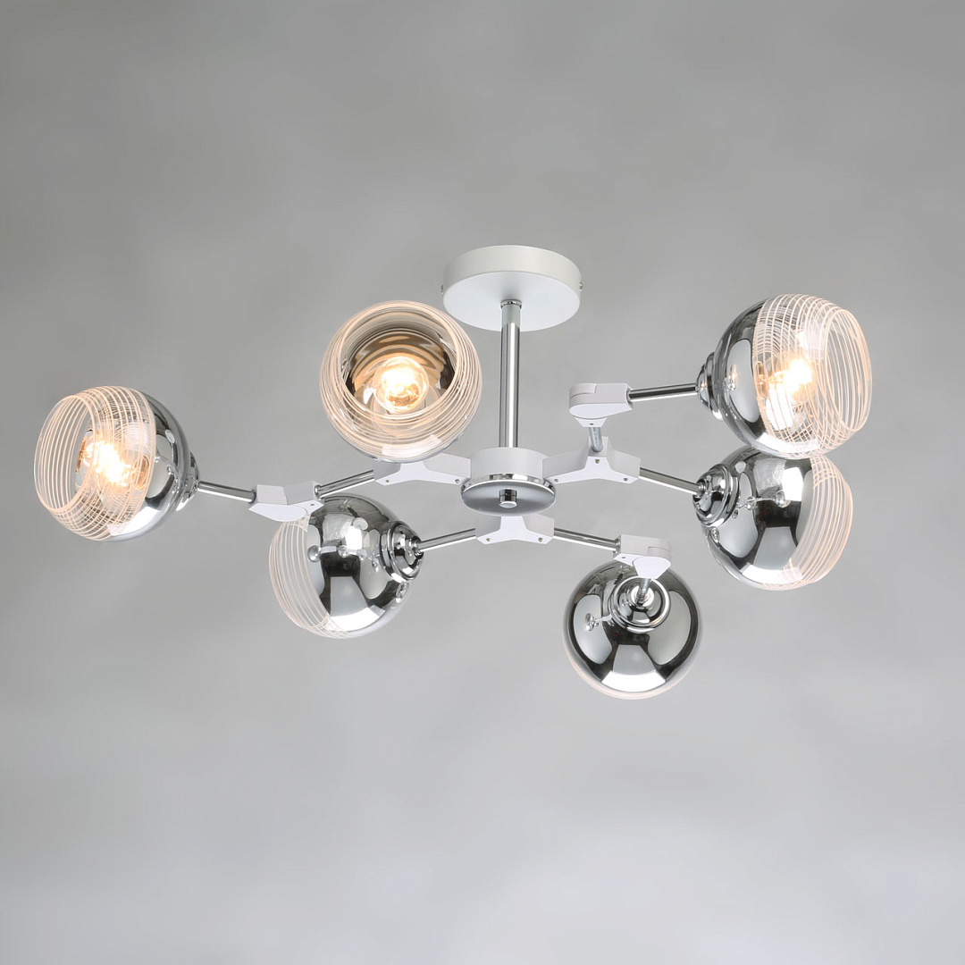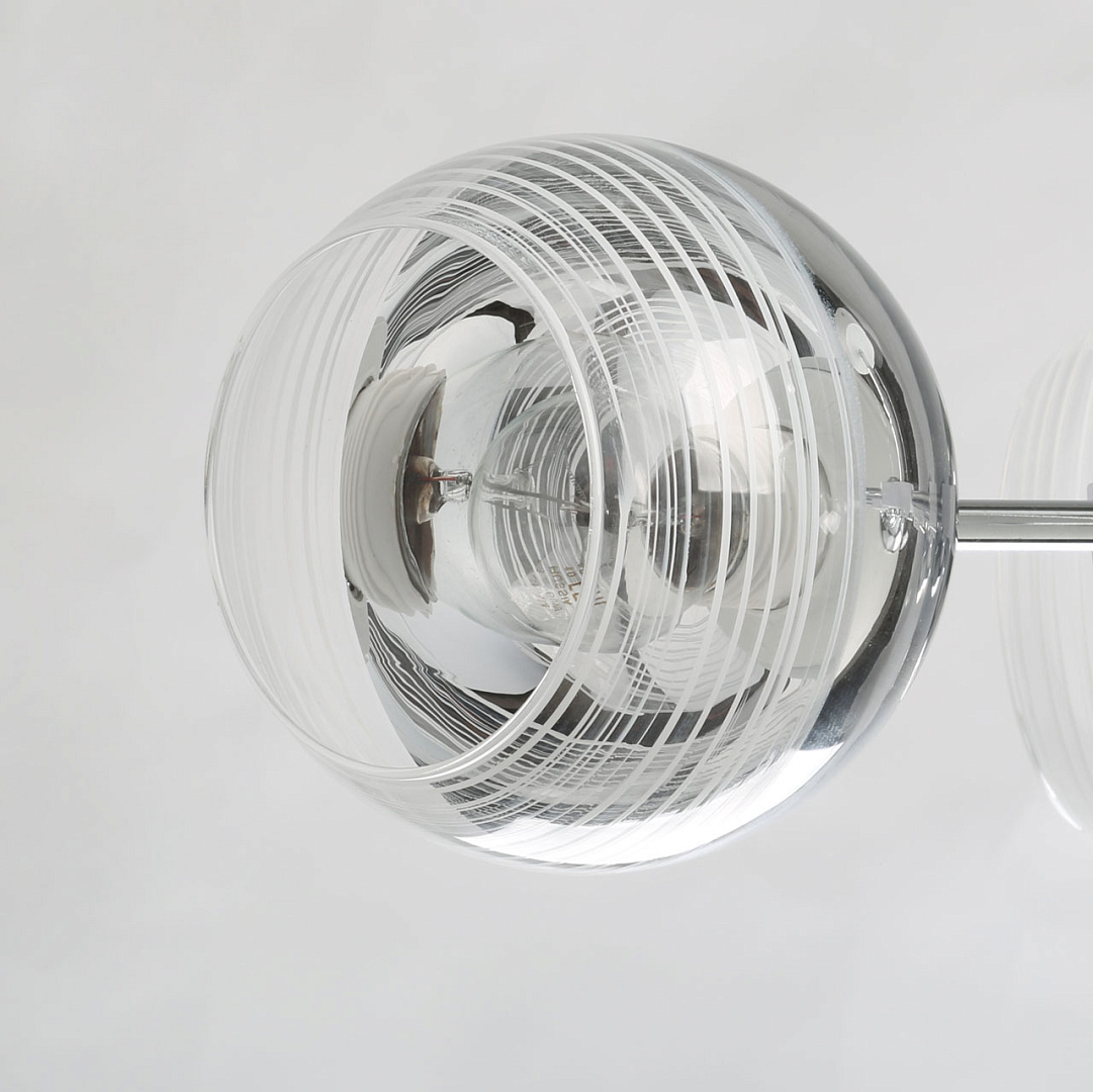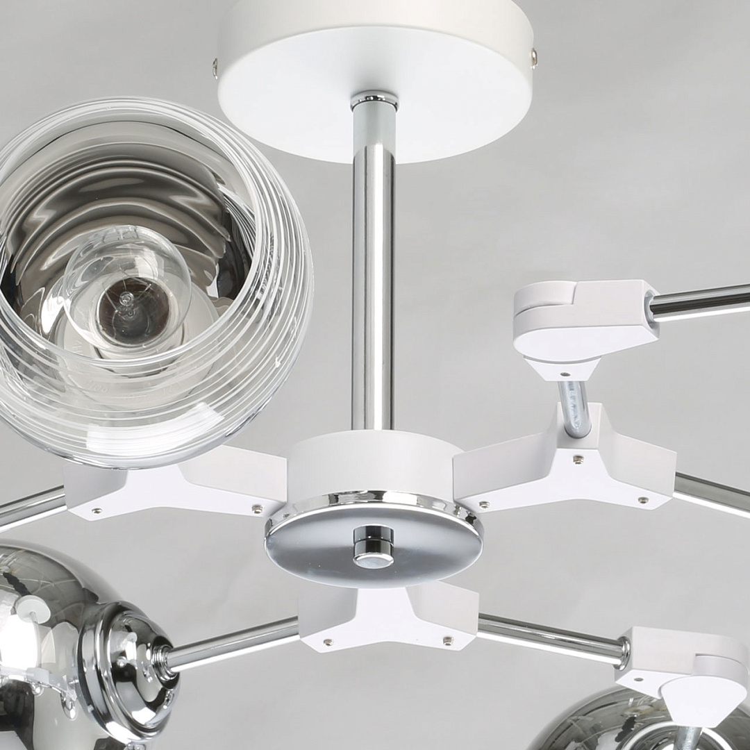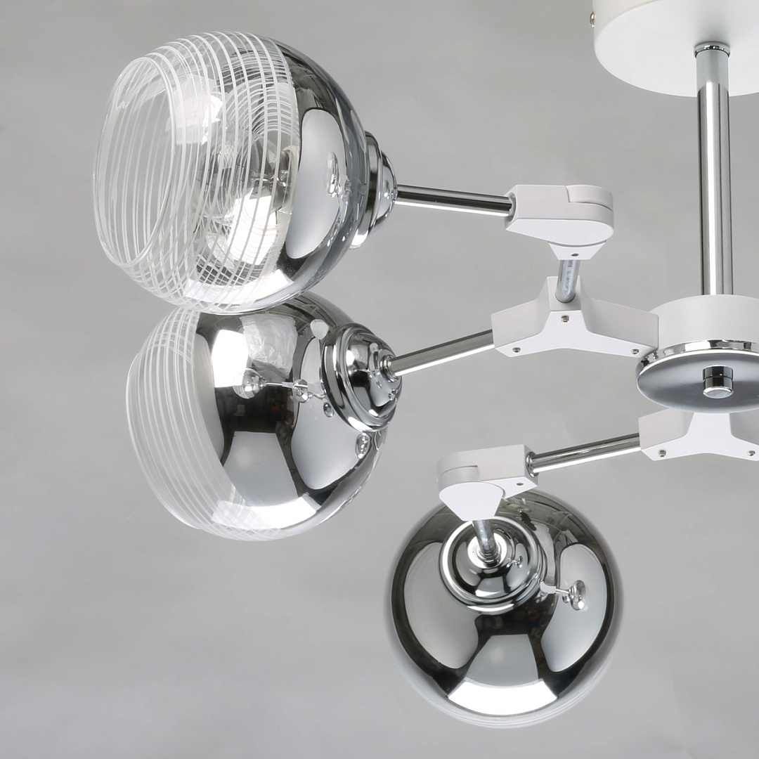 Модный дизайн в виде молекулы привлекает вниманиеЦвет хрома делает светильник универсальным в современный интерьерПотолочная люстра сохраняет пространство комнатыПлафоны, направленные в разные стороны создают яркое освещениеКачественная электрика делает люстру безопасной