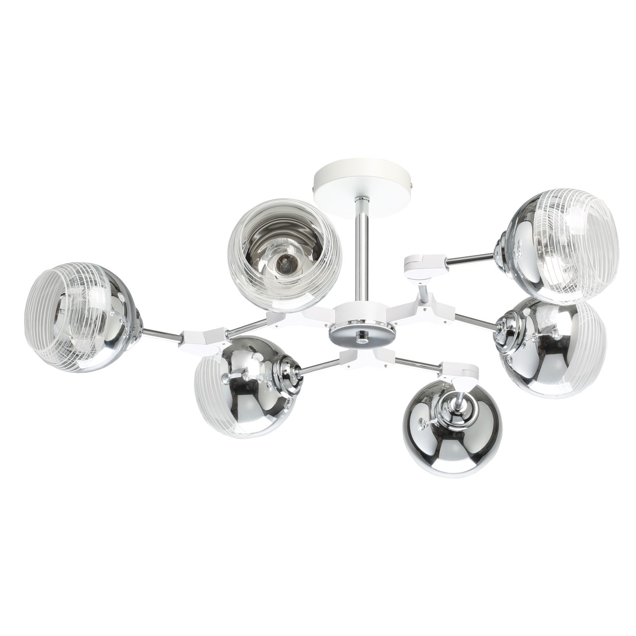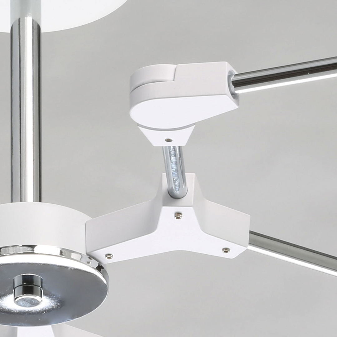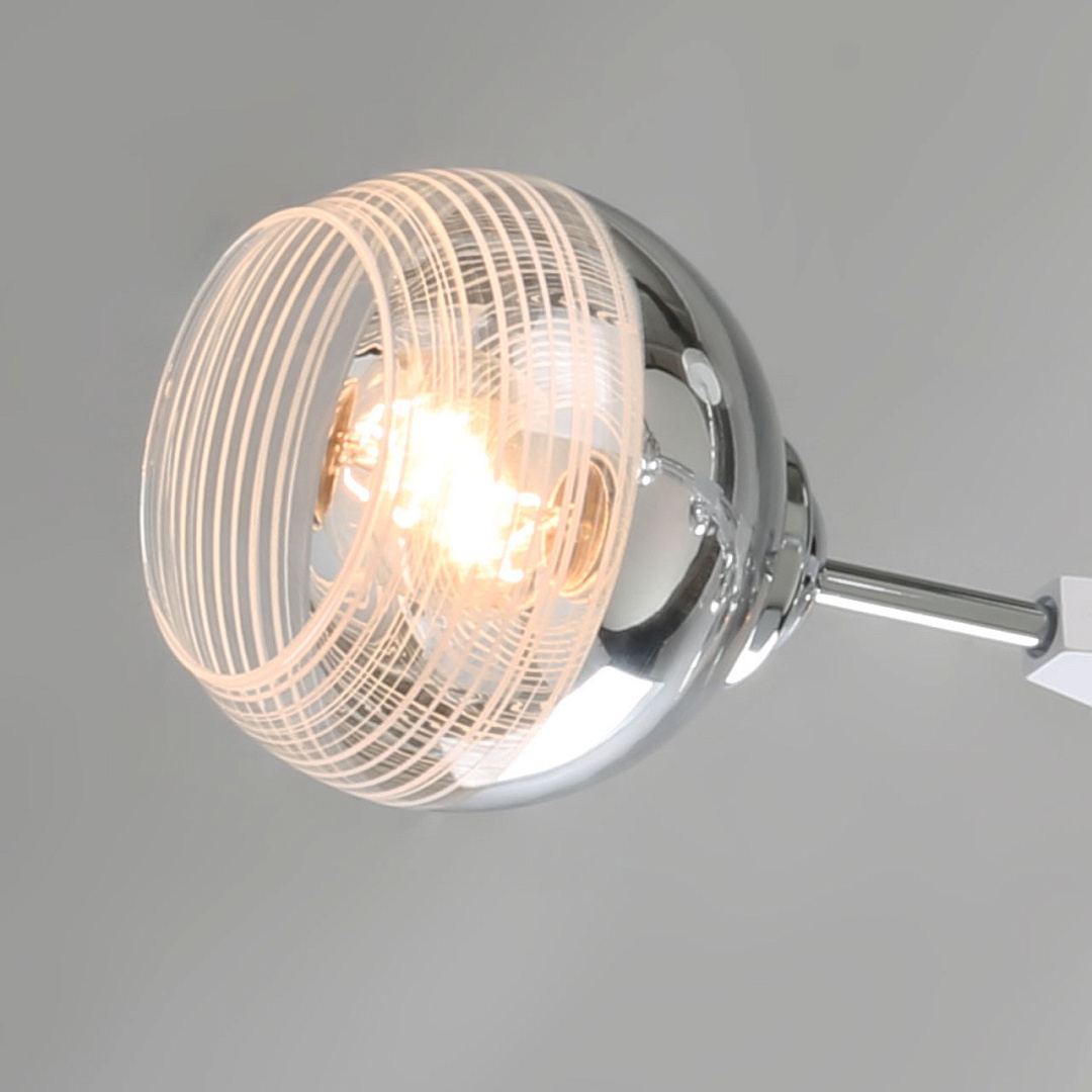 Модный дизайн в виде молекулы привлекает вниманиеЦвет хрома делает светильник универсальным в современный интерьерПотолочная люстра сохраняет пространство комнатыПлафоны, направленные в разные стороны создают яркое освещениеКачественная электрика делает люстру безопасной
