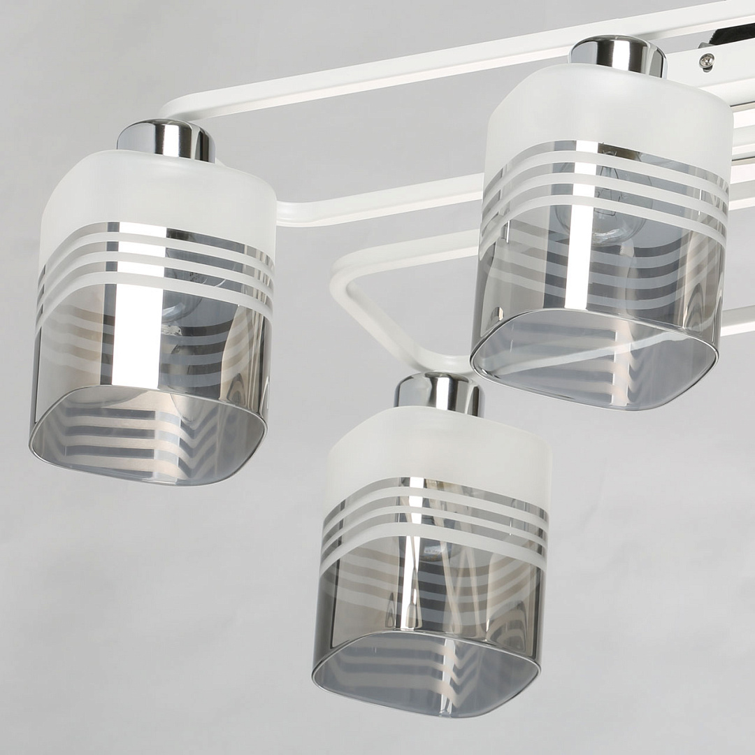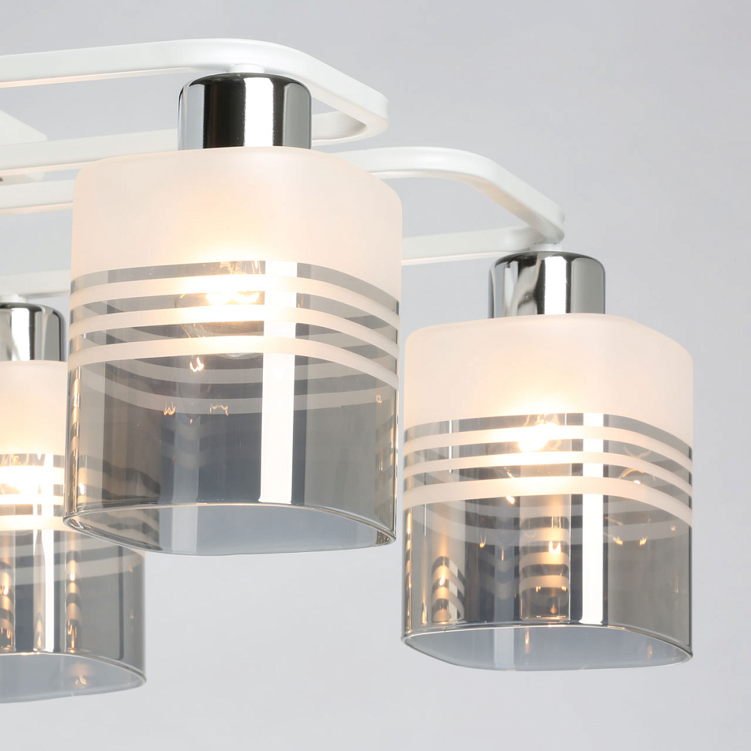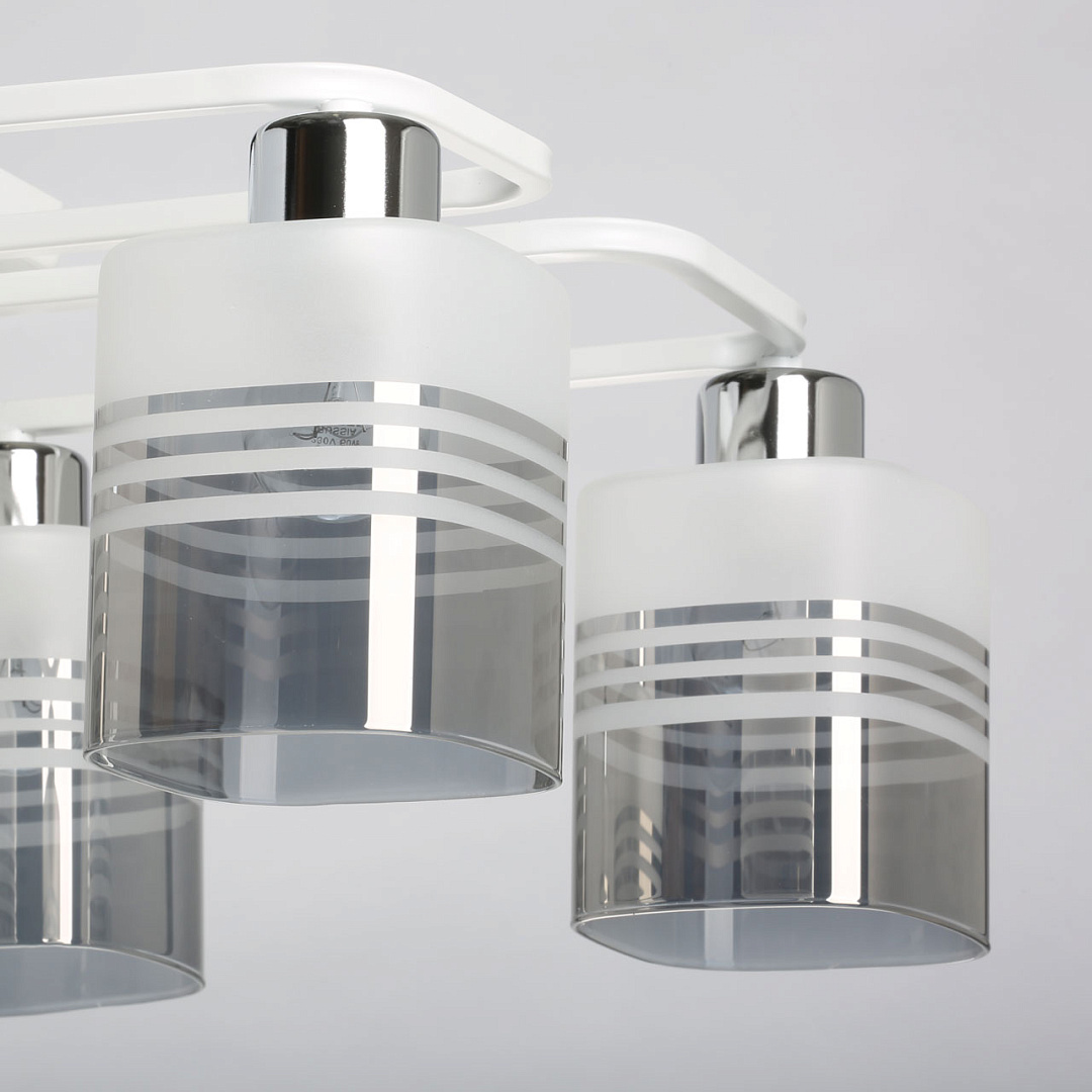 Компактный светильник для небольших помещений.Популярное сочетание белого и цвета хрома основания светильника.Цилиндрическая форма плафонов из стекла дымчатого оттенка как элемент дизайна.Заменяемые источники света удобны в эксплуатации.Потолочная люстра в гостиную, в спальню в современном дизайне.