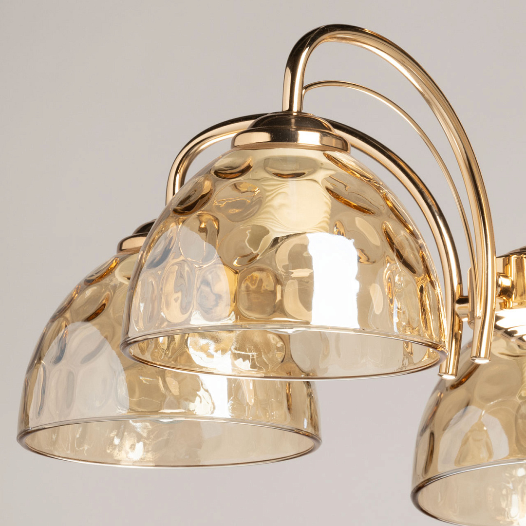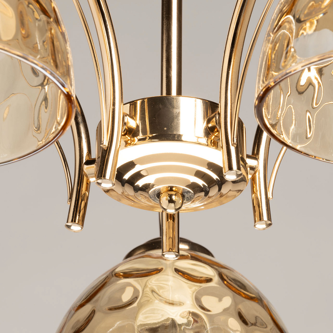 Эта универсальная модель подходит для интерьеров различных стилей. Стеклянные плафоны цвета шампань создают мягкий световой поток. Компактная высота светильника идеальна для стандартных потолков. Заменяемые источники света упрощают эксплуатацию.