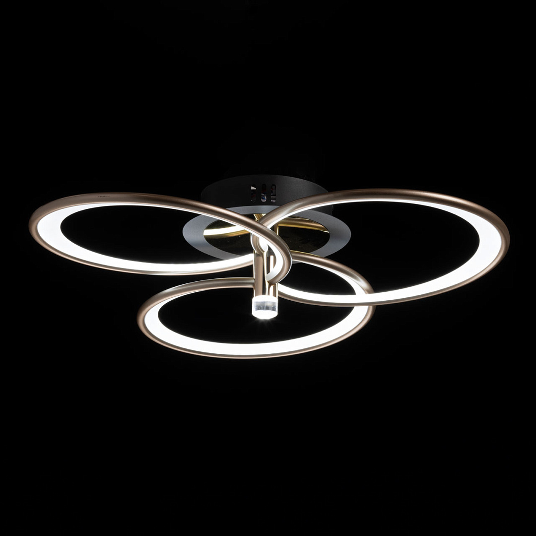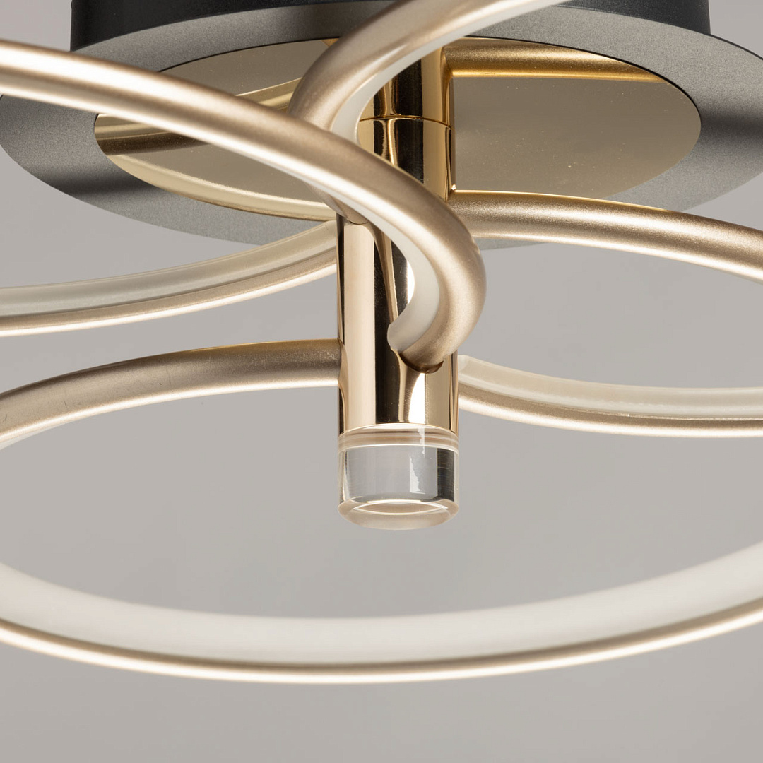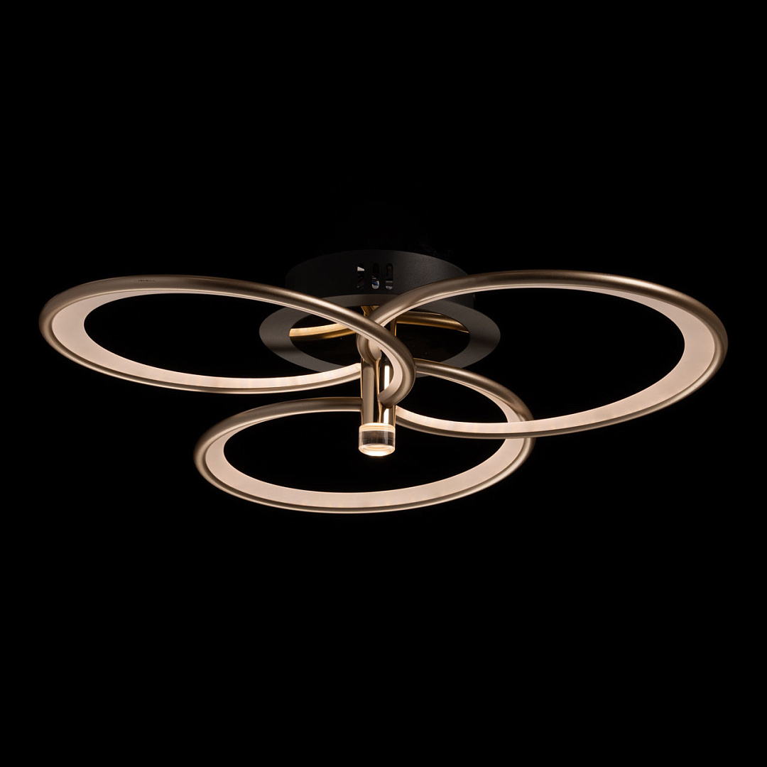 Контрастное сочетание глубокого черного цвета и благородного цвета золота эффектно выделяет люстру на потолке. Матовый акрил мягко рассеивает свет. Многорежимность с изменением цветовой температуры от 3000К до 6500К и яркости света является элементом светодизайна. Плавное диммирование позволяет регулировать интенсивность освещения.  Качественные светодиоды обеспечивают яркое освещение и долгий срок службы. Наличие ПДУ позволяет управлять режимами освещения. Светодиодные источники света безопасны и экономичны. Компактные размеры светильника сохраняют пространство комнаты и подходят для стандартных потолков.